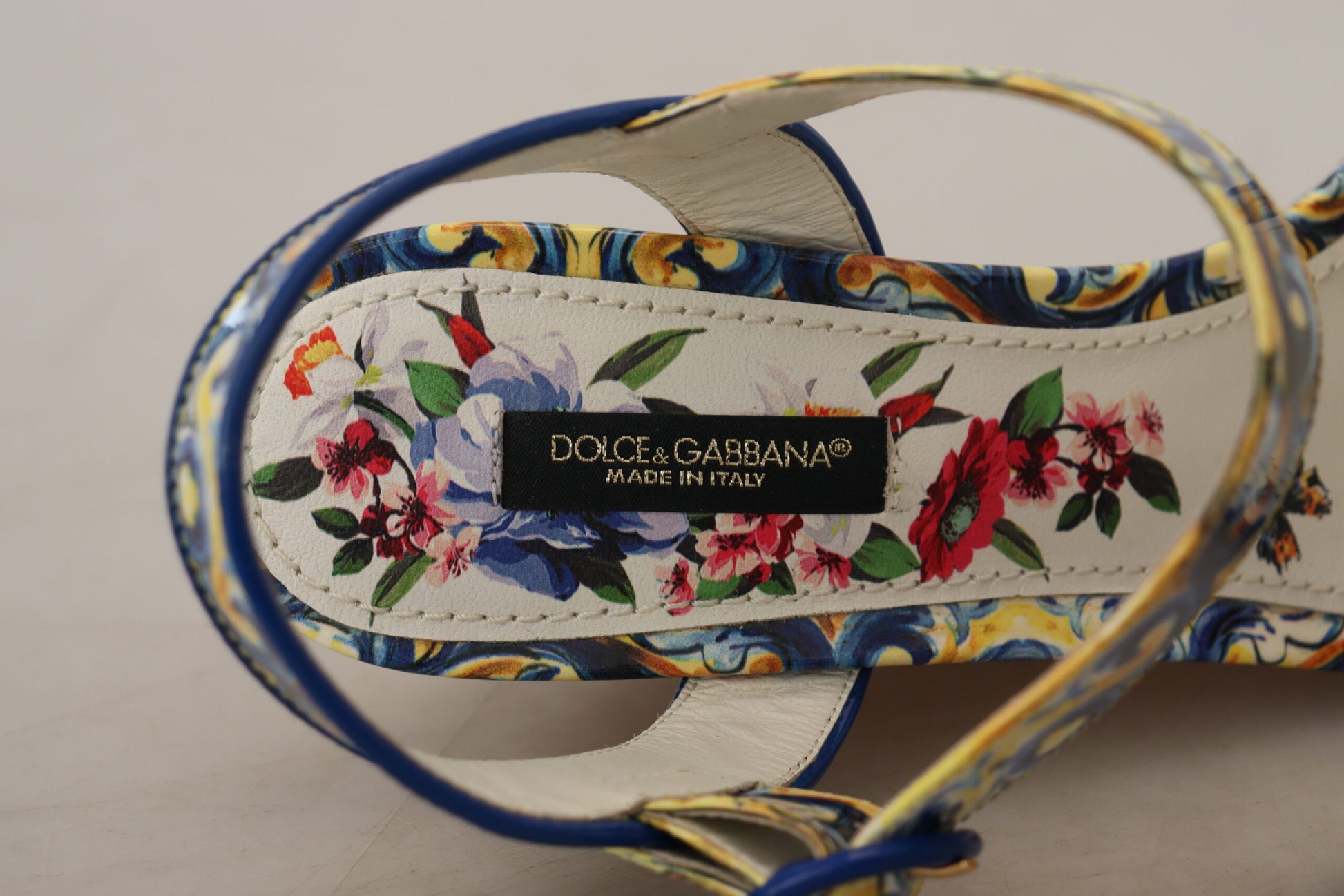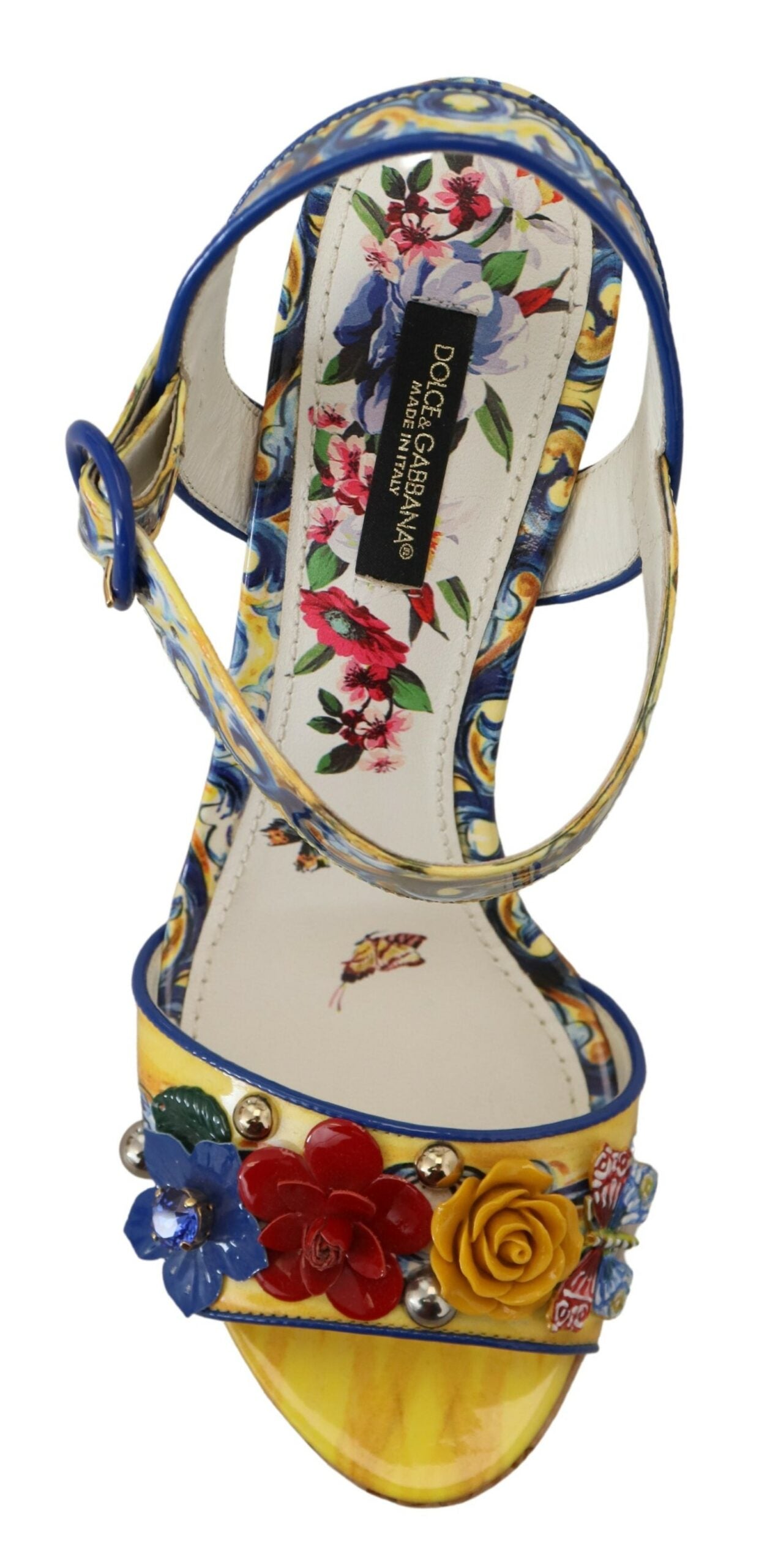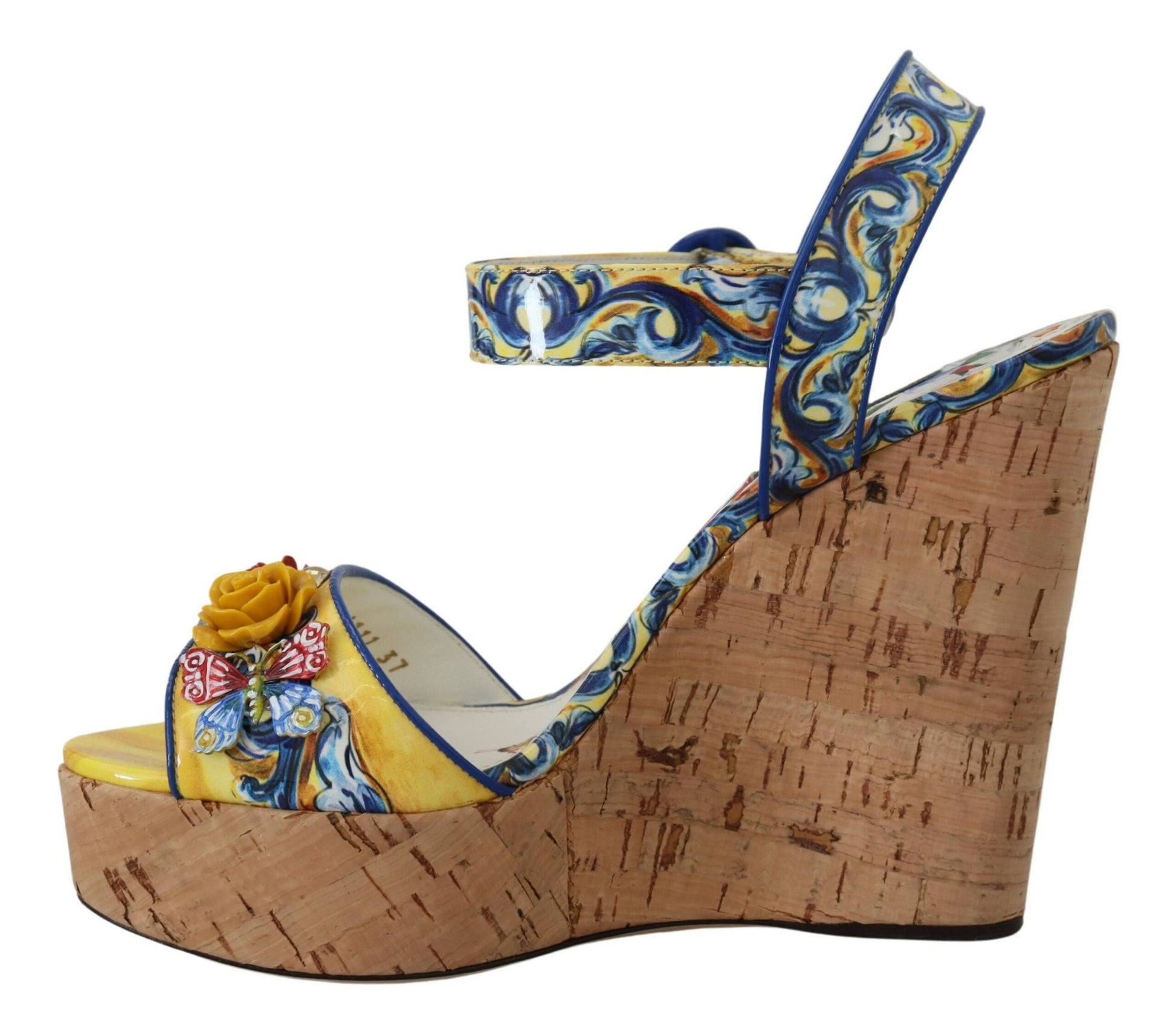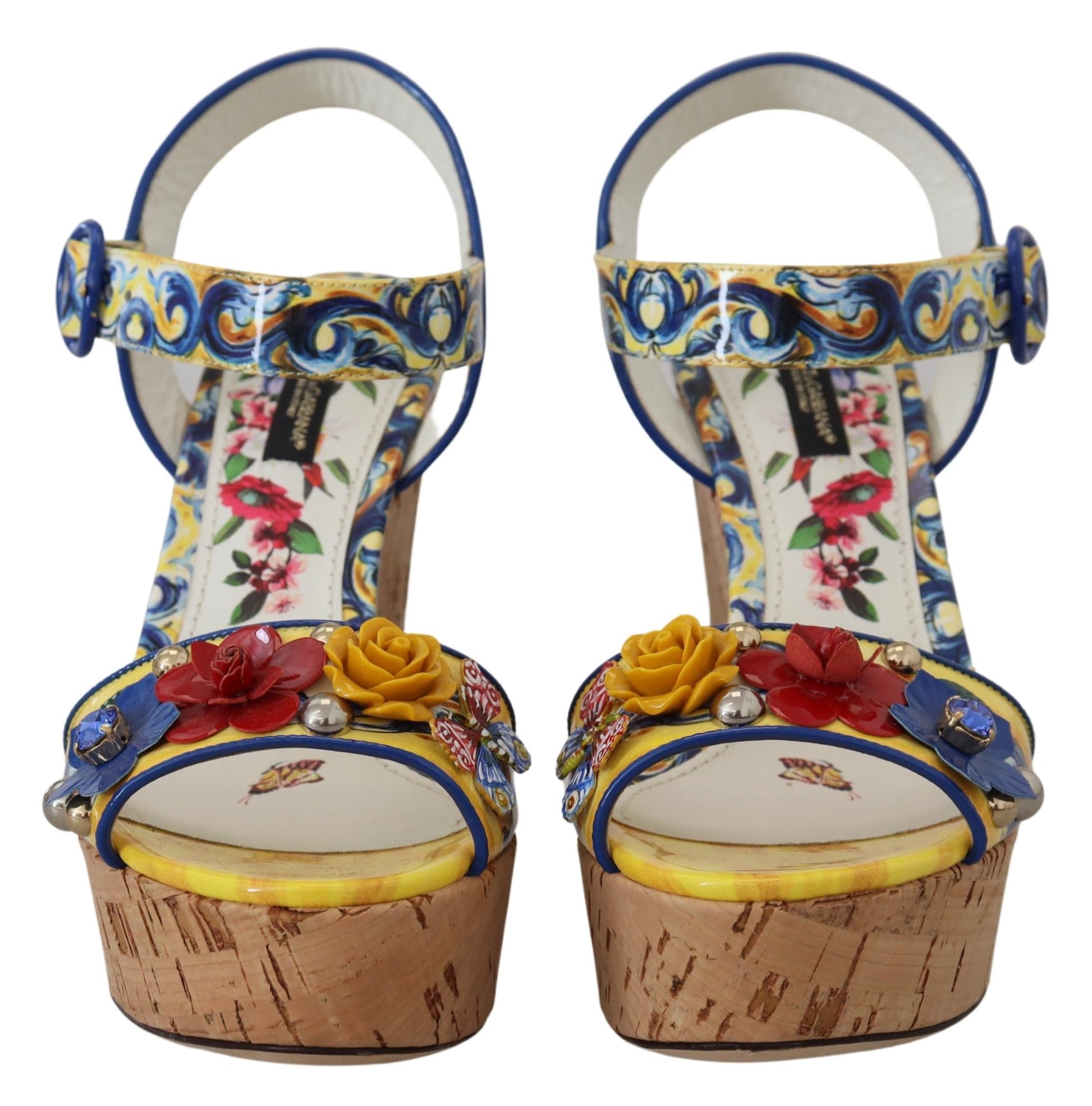 Step into the glamour and sophistication of Dolce & Gabbana with these stunning ankle strap wedges, featuring a vibrant multicolor Majolica print. Embellished with a dazzling array of multicolor crystals, these shoes are the epitome of luxury fashion. Crafted with the highest quality materials, they showcase exquisite Italian craftsmanship. Perfect for adding a touch of elegance to any outfit, these wedges are a must-have for fashion enthusiasts.
