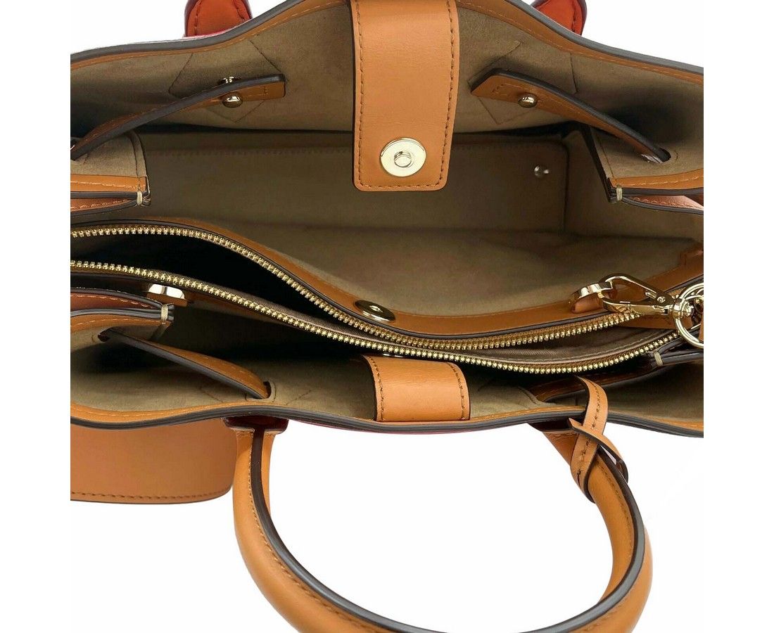 Made of Leather; Dual rolled leather handles; Detachable shoulder strap; Gold tone hardware; Suede lining; Style: Shoulder Bag; Character: Ruby; MCM Hang tag; Measurements: Bag Height: 9; Bag Depth: 5.5; Bag Width: 11.5 Inches; Original MCM tags, dust bag and authenticity cards included.