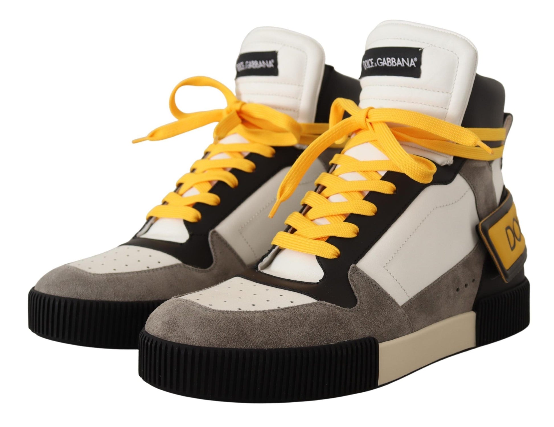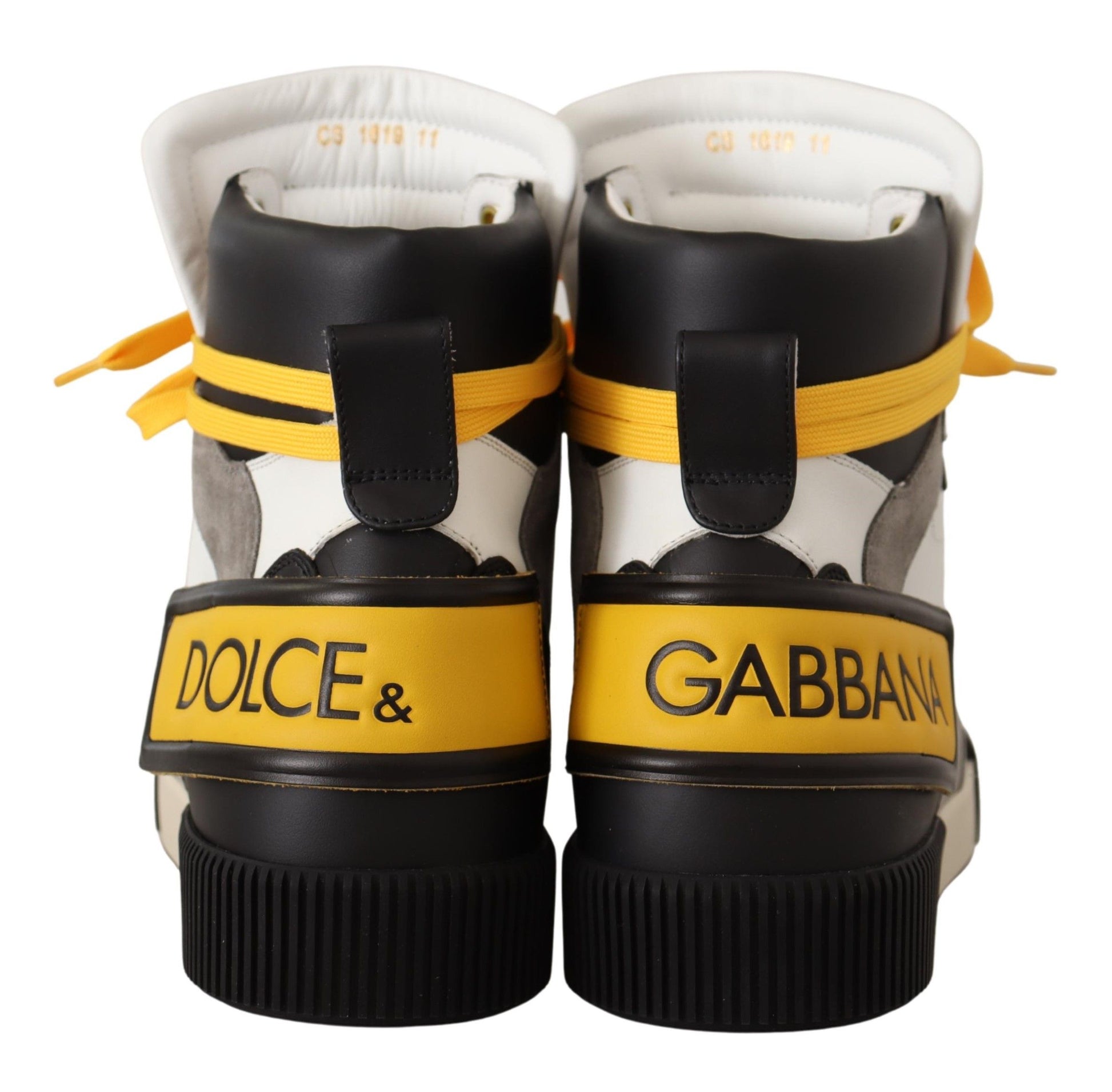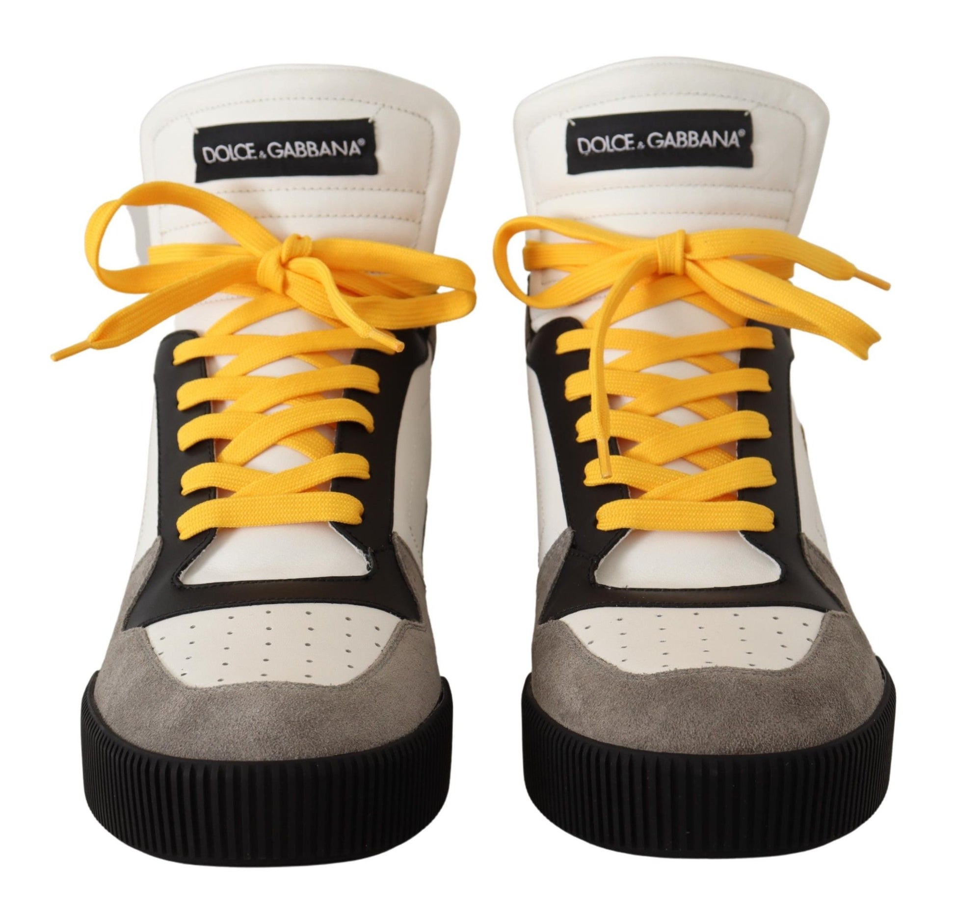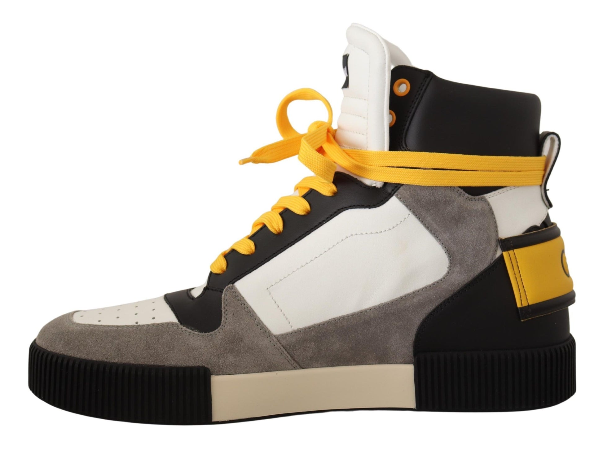 Step into unparalleled craftsmanship and style with these Dolce & Gabbana high top sneakers. Exquisitely constructed with 100% leather, these shoes boast a vibrant multicolor design of white, yellow, gray, and black, perfect for making a bold fashion statement. The robust rubber sole offers durability and comfort, making them ideal for any occasion. Embellished with the iconic logo details, these sneakers are a testament to luxury and elegance, crafted in the heart of Italy.