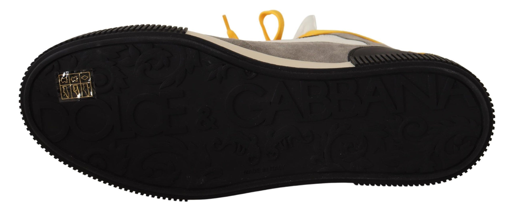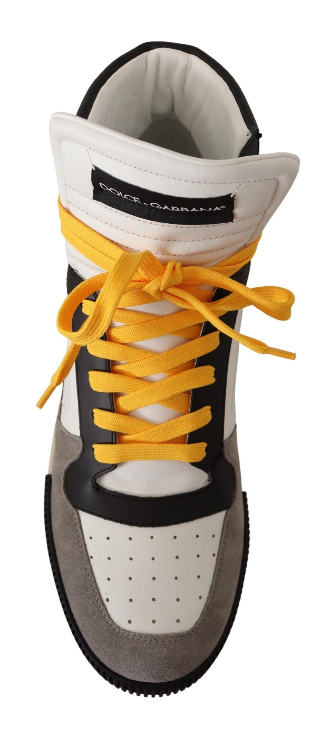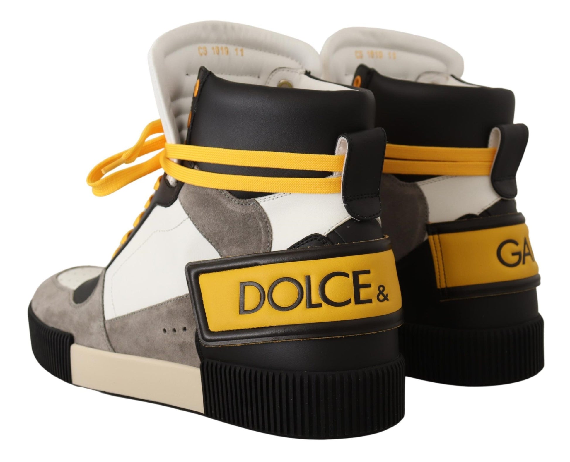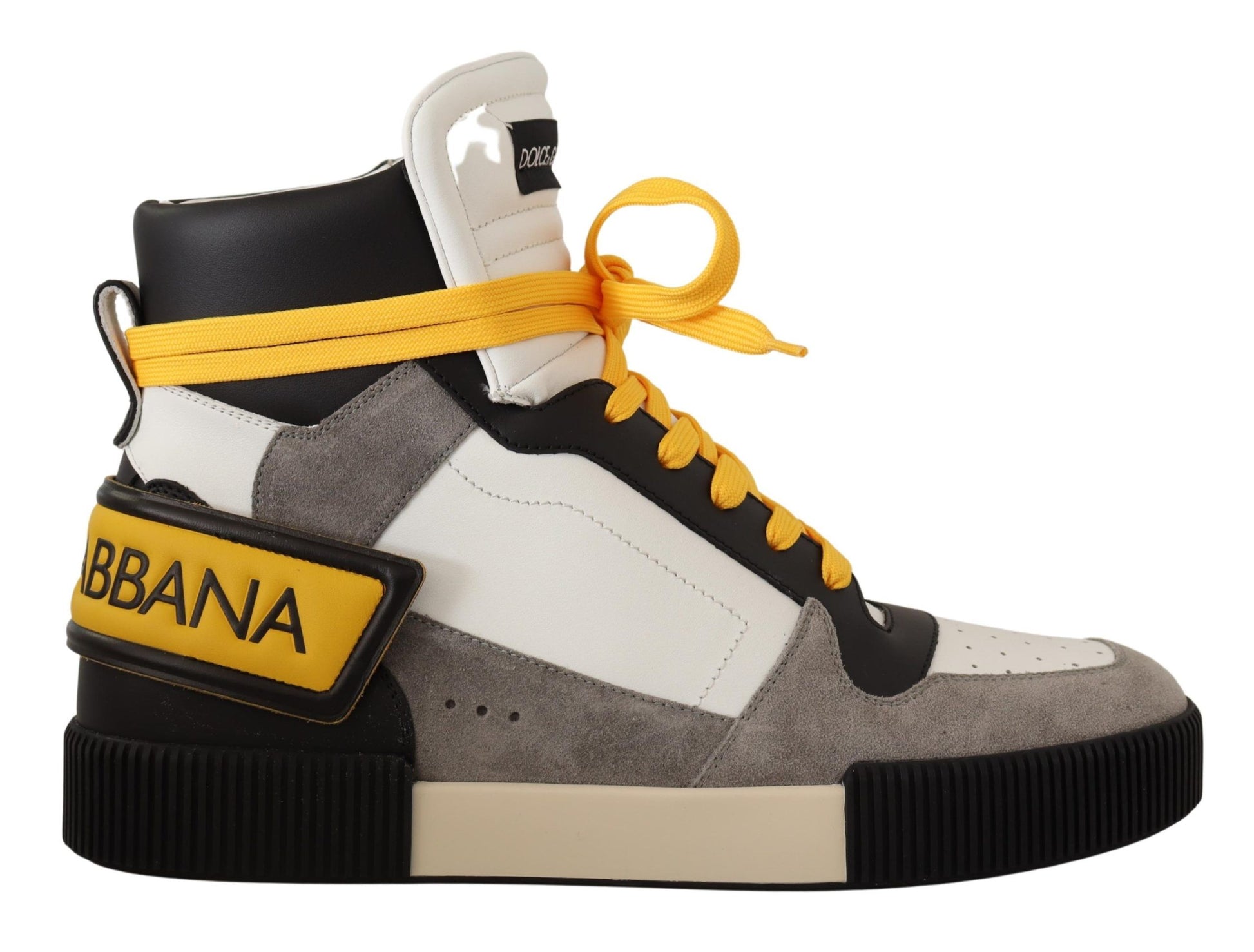 Step into unparalleled craftsmanship and style with these Dolce & Gabbana high top sneakers. Exquisitely constructed with 100% leather, these shoes boast a vibrant multicolor design of white, yellow, gray, and black, perfect for making a bold fashion statement. The robust rubber sole offers durability and comfort, making them ideal for any occasion. Embellished with the iconic logo details, these sneakers are a testament to luxury and elegance, crafted in the heart of Italy.