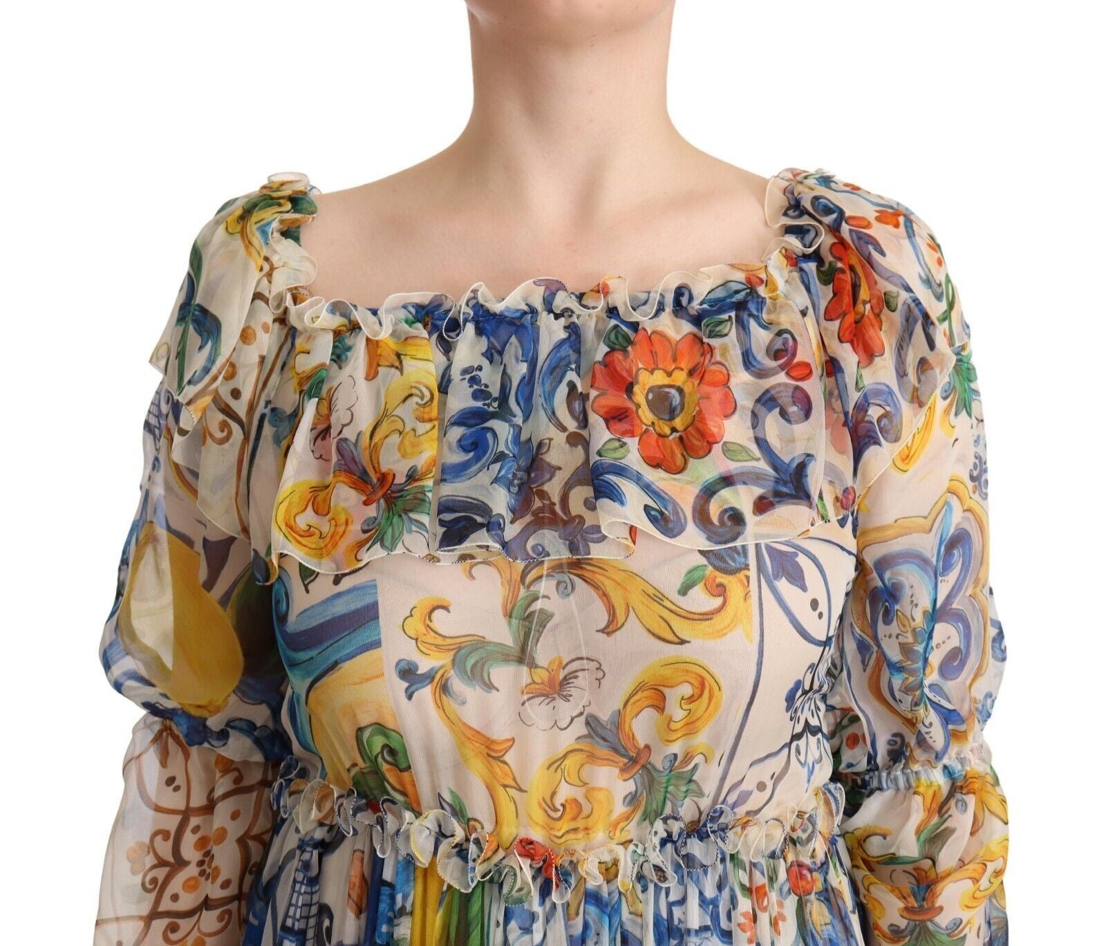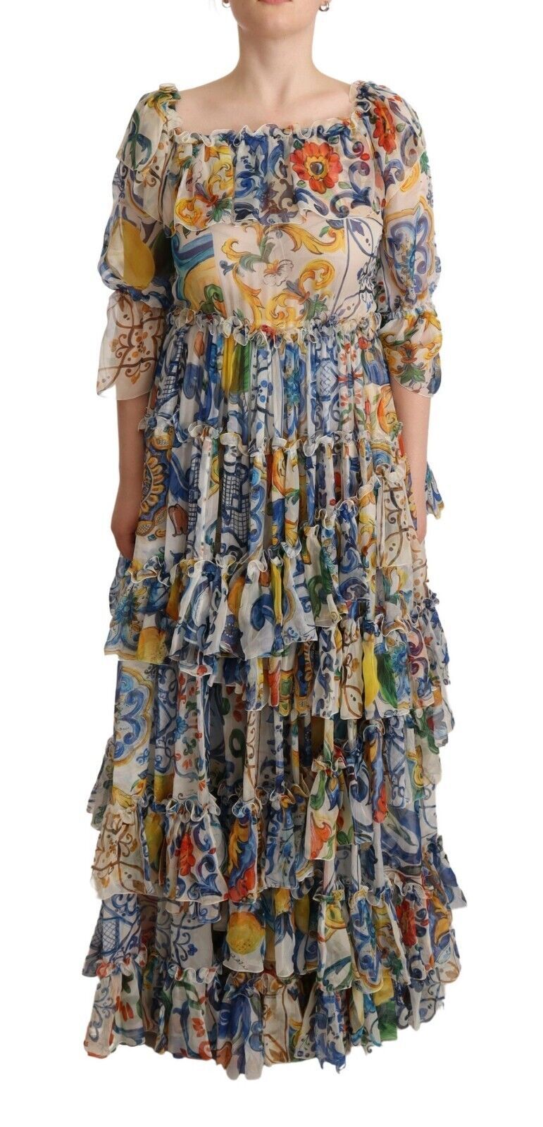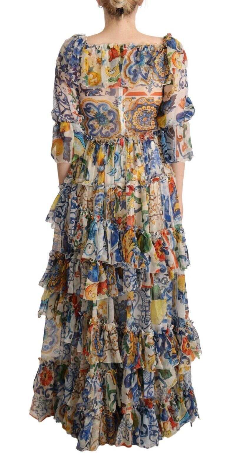 Step into a world of exuberant style with this luxurious Dolce & Gabbana silk maxi dress. Crafted from 100% pure silk, this Italian-made masterpiece drapes elegantly on the figure. It boasts a vibrant majolica print design, an alluring square neckline, and a concealed back zip for a seamless silhouette. This dress isn’t just a garment; it’s a statement of unparalleled craftsmanship and opulence.