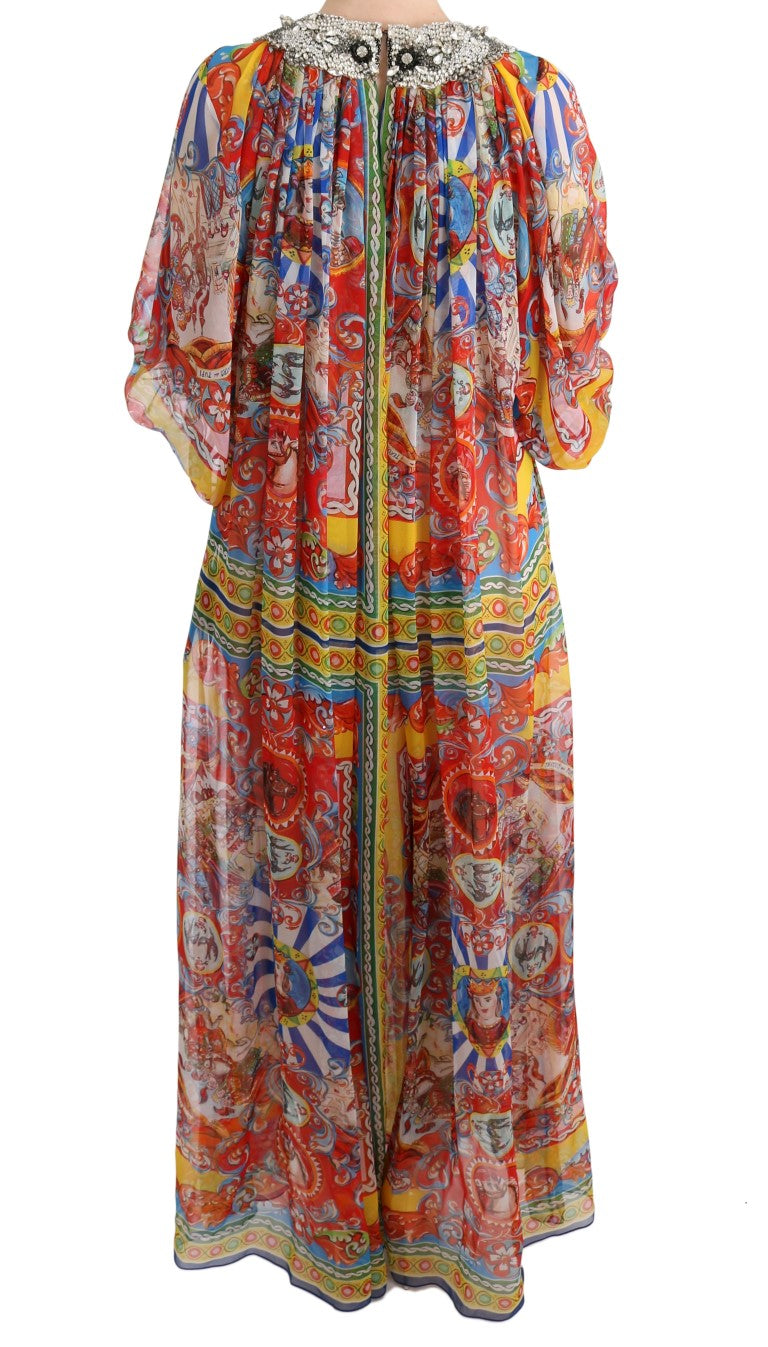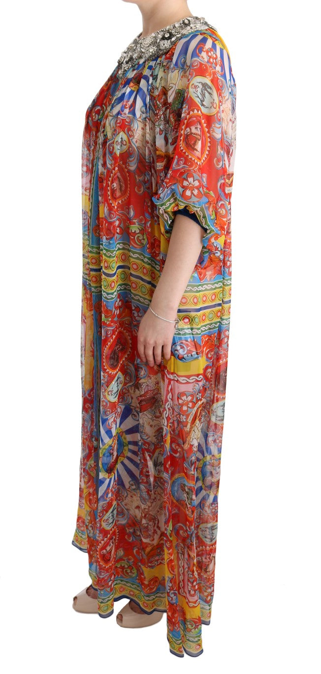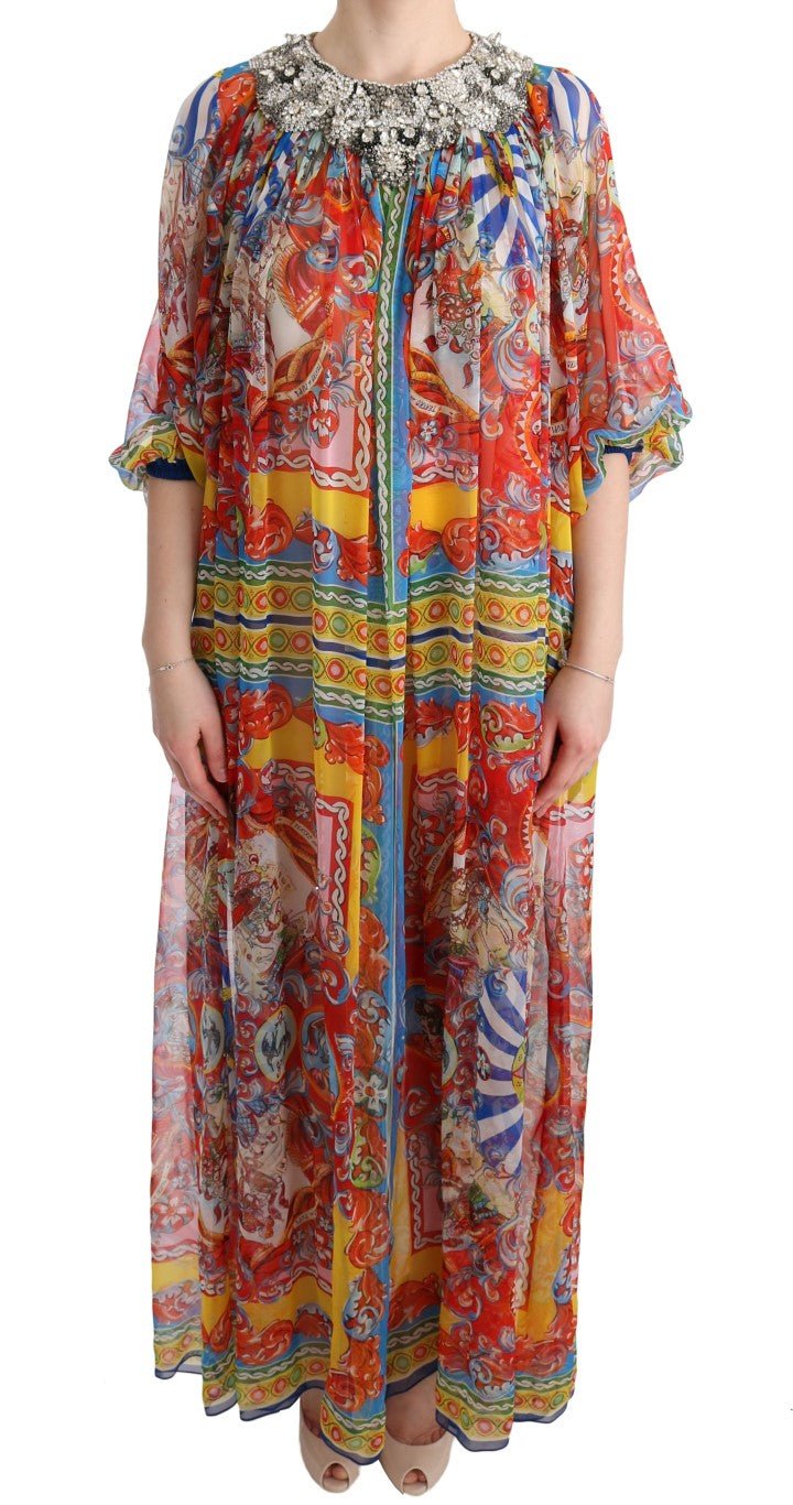 Embrace the epitome of Italian luxury and grace with this Dolce & Gabbana full-length tunic maxi dress, brand new with tags. Adorned in the vibrant Multicolor Carretto pattern and enhanced with shimmering crystals in gray, clear, and black, this stunning dress combines traditional influences with modern elegance. Meticulously crafted in Italy, it reflects the commitment to high craftsmanship and exclusive style that the brand is renowned for. With its pure silk composition, prepare to indulge in unrivaled sophistication and comfort.