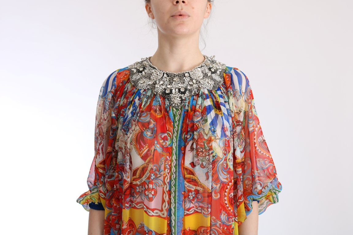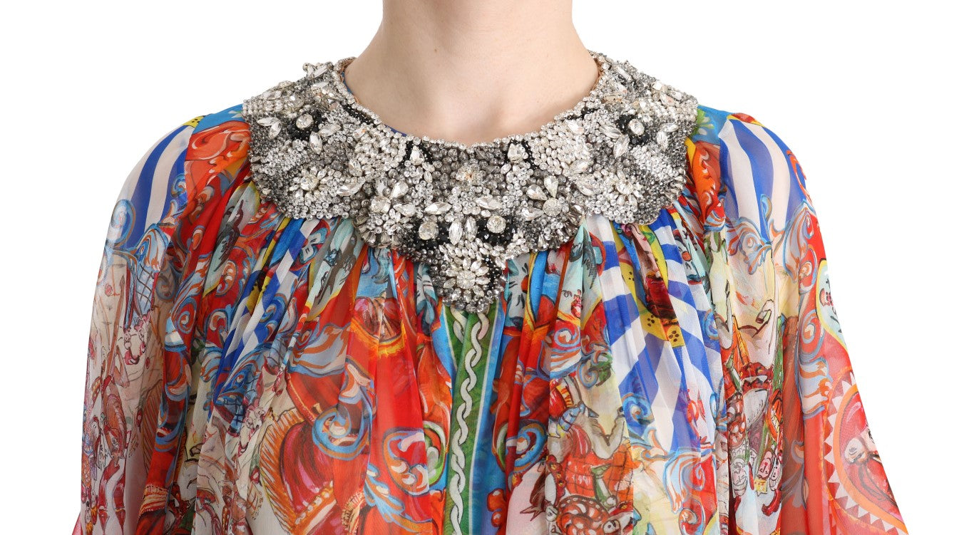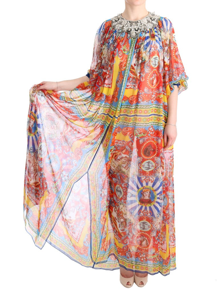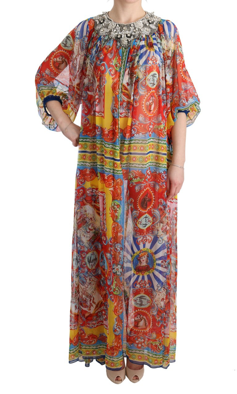 Embrace the epitome of Italian luxury and grace with this Dolce & Gabbana full-length tunic maxi dress, brand new with tags. Adorned in the vibrant Multicolor Carretto pattern and enhanced with shimmering crystals in gray, clear, and black, this stunning dress combines traditional influences with modern elegance. Meticulously crafted in Italy, it reflects the commitment to high craftsmanship and exclusive style that the brand is renowned for. With its pure silk composition, prepare to indulge in unrivaled sophistication and comfort.