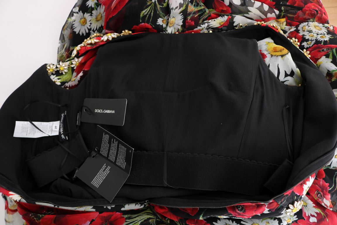 Step into a captivating elegance with the Dolce & Gabbana Floral Maxi Gown. This stunning piece showcases a luxurious black base adorned with a vibrant multicolor floral and sunflower print, complemented by exquisite gold metal detailing. Embellished with sparkling clear and yellow crystals, it’s a statement of true craftsmanship and Italian haute couture. A full-length silhouette, perfected with a zipper closure at the back and a sleek silk inner lining, promises a grand entrance at any high-class event.