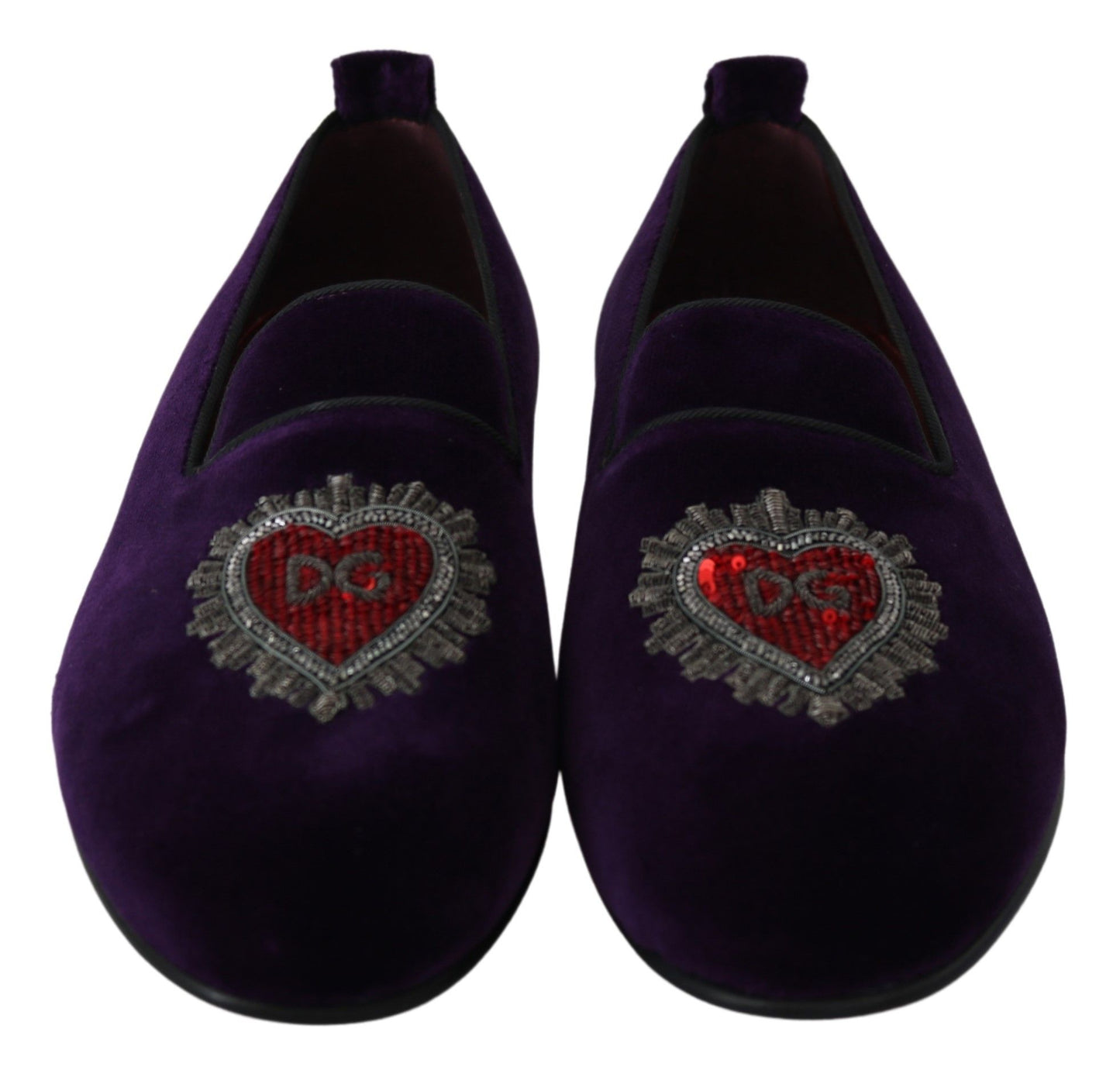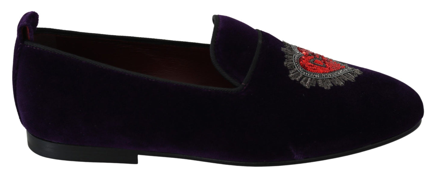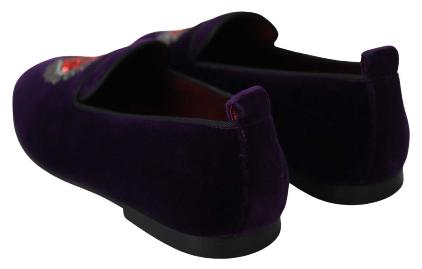 Embrace the epitome of luxury with these exquisite Dolce & Gabbana loafers. Crafted in Italy from premium cotton velvet in a rich purple hue, these slippers are a testament to high craftsmanship. The stunning red enchanted heart embroidery adds a regal touch, while the bordeaux leather sole ensures durability and style. Complete with the brand’s iconic logo details, these loafers are more than just footwear—they are a fashion statement. Ideal for those special occasions or elevating your everyday style.