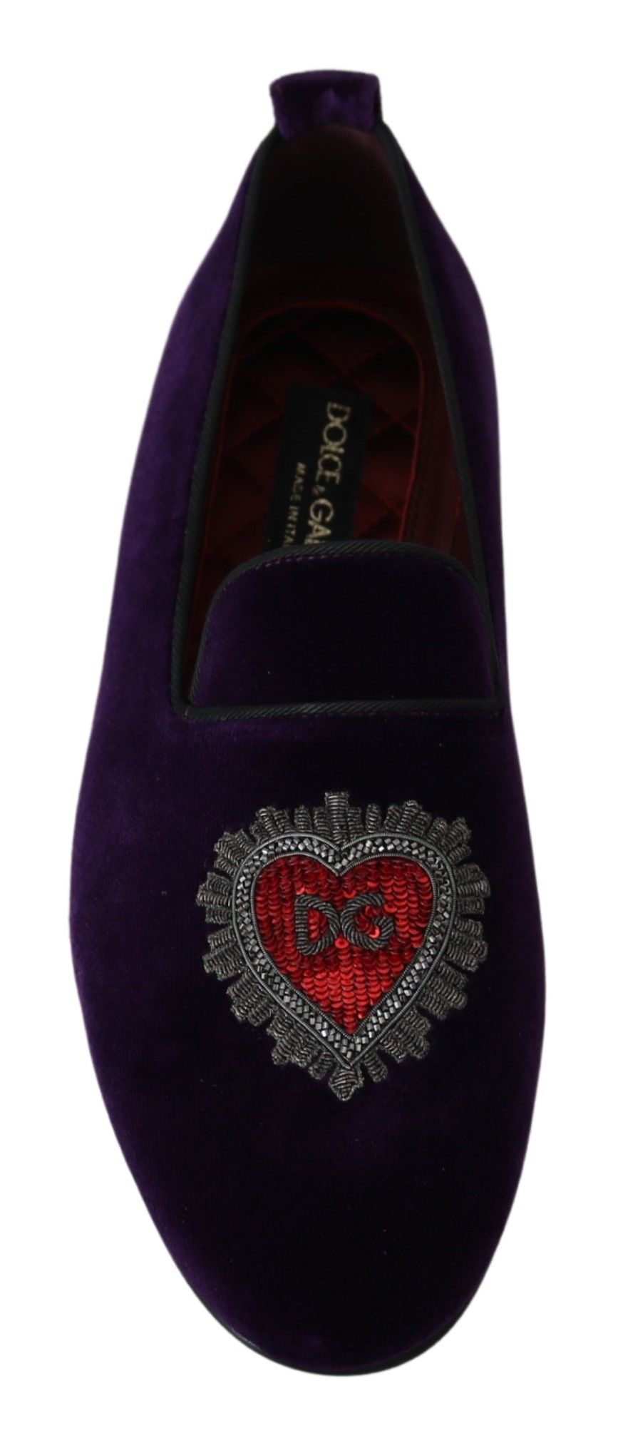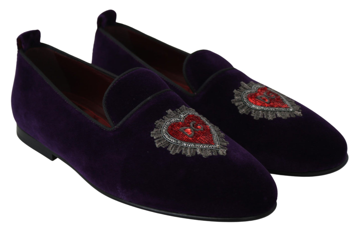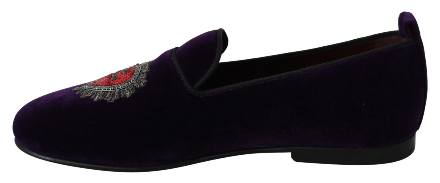 Embrace the epitome of luxury with these exquisite Dolce & Gabbana loafers. Crafted in Italy from premium cotton velvet in a rich purple hue, these slippers are a testament to high craftsmanship. The stunning red enchanted heart embroidery adds a regal touch, while the bordeaux leather sole ensures durability and style. Complete with the brand’s iconic logo details, these loafers are more than just footwear—they are a fashion statement. Ideal for those special occasions or elevating your everyday style.