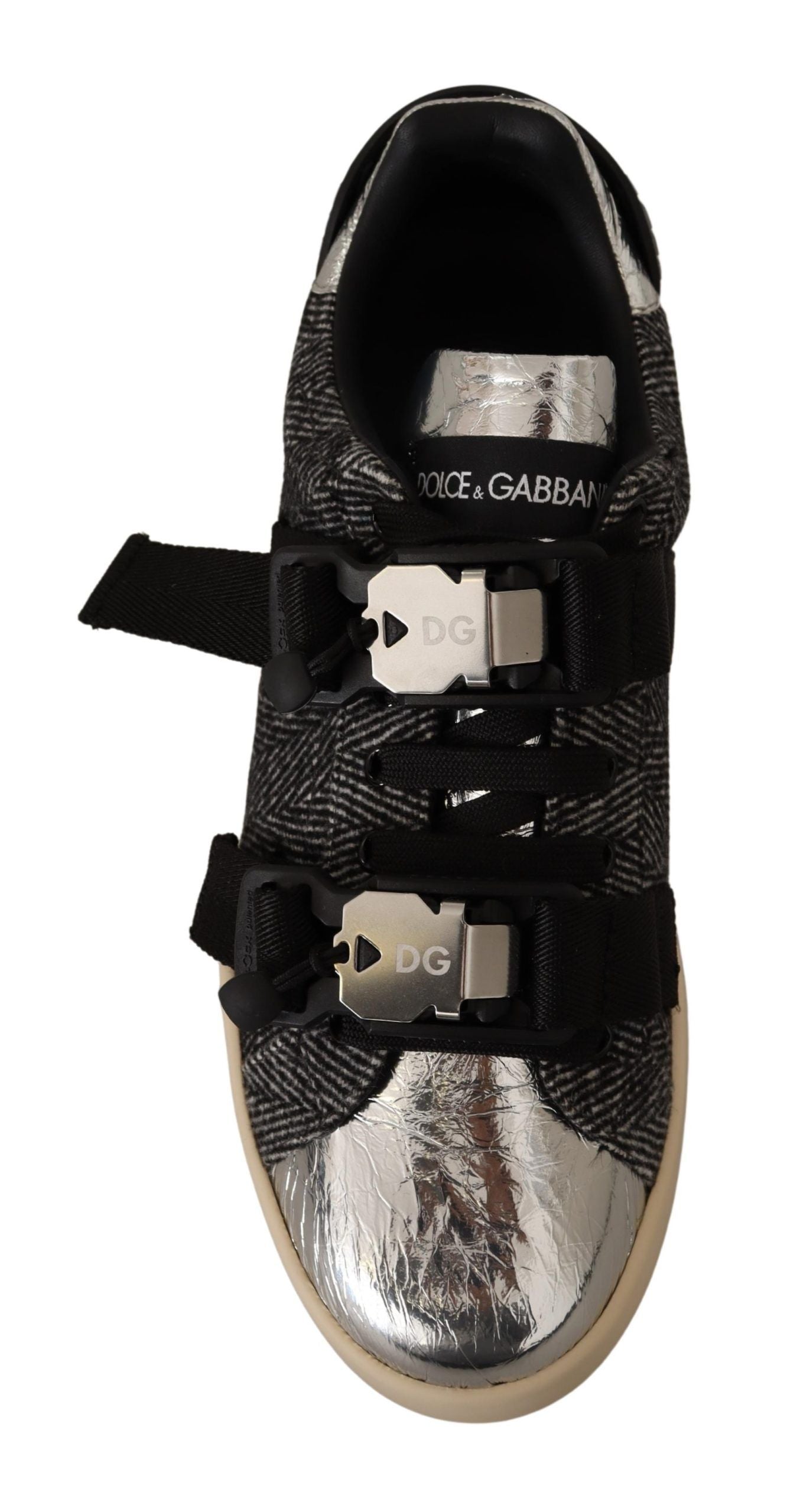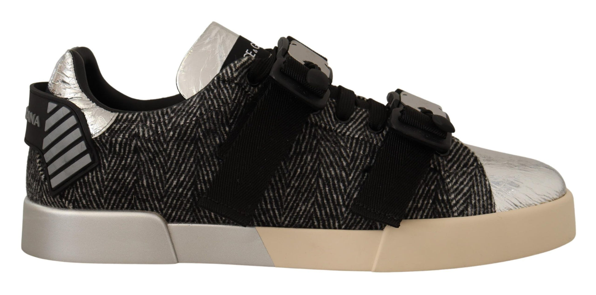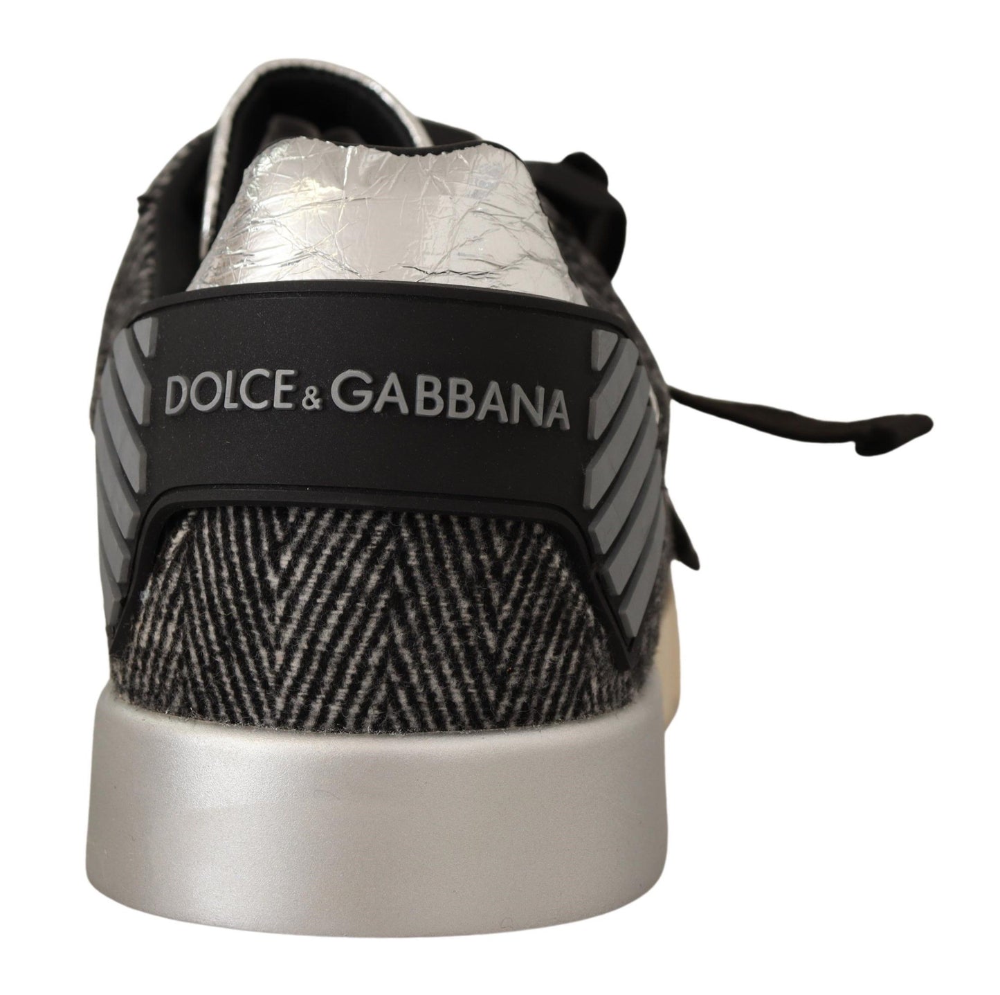Step into luxury with these stunning, brand new, 100% Authentic sneakers from Dolce & Gabbana. These low-top casual sneakers combine elegance with comfort, featuring a sleek silver colorway with subtle gray and black accents that will add a dash of sophistication to any outfit. Crafted from a mix of premium materials including leather, wool, and cotton, these shoes are designed not just for style but also for durable wear. Resting on a robust rubber sole for optimum grip, they’re perfect for everyday elegance.