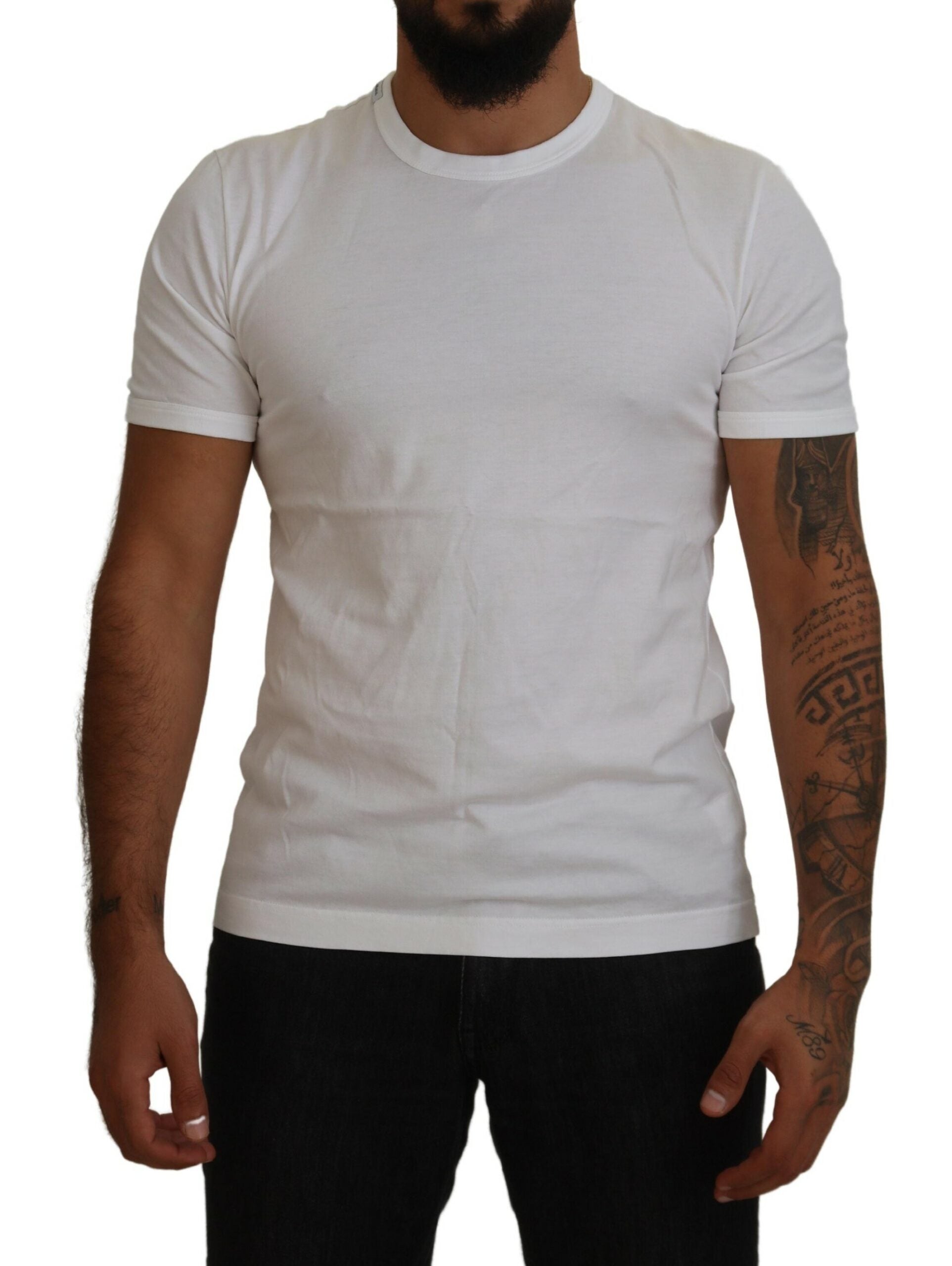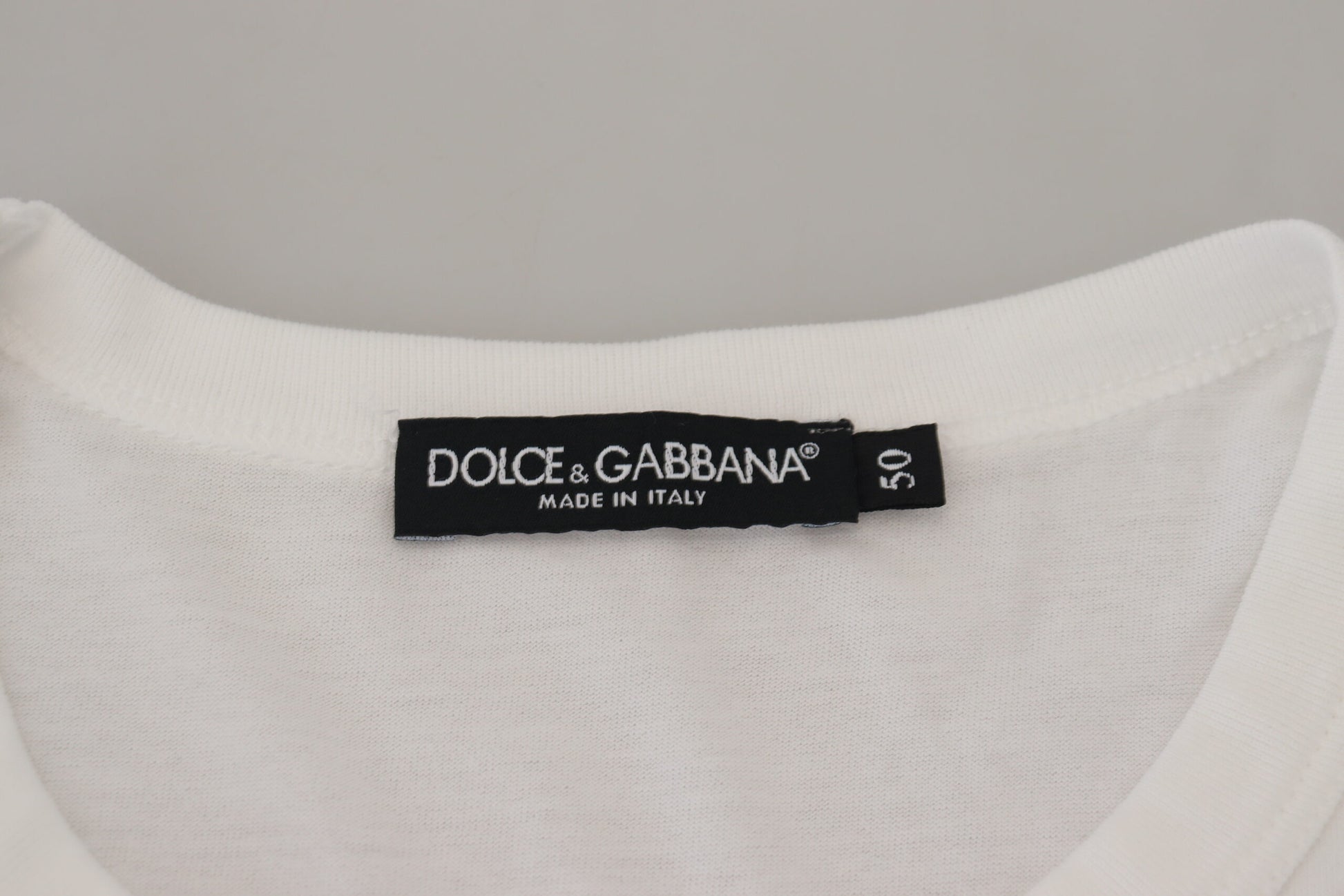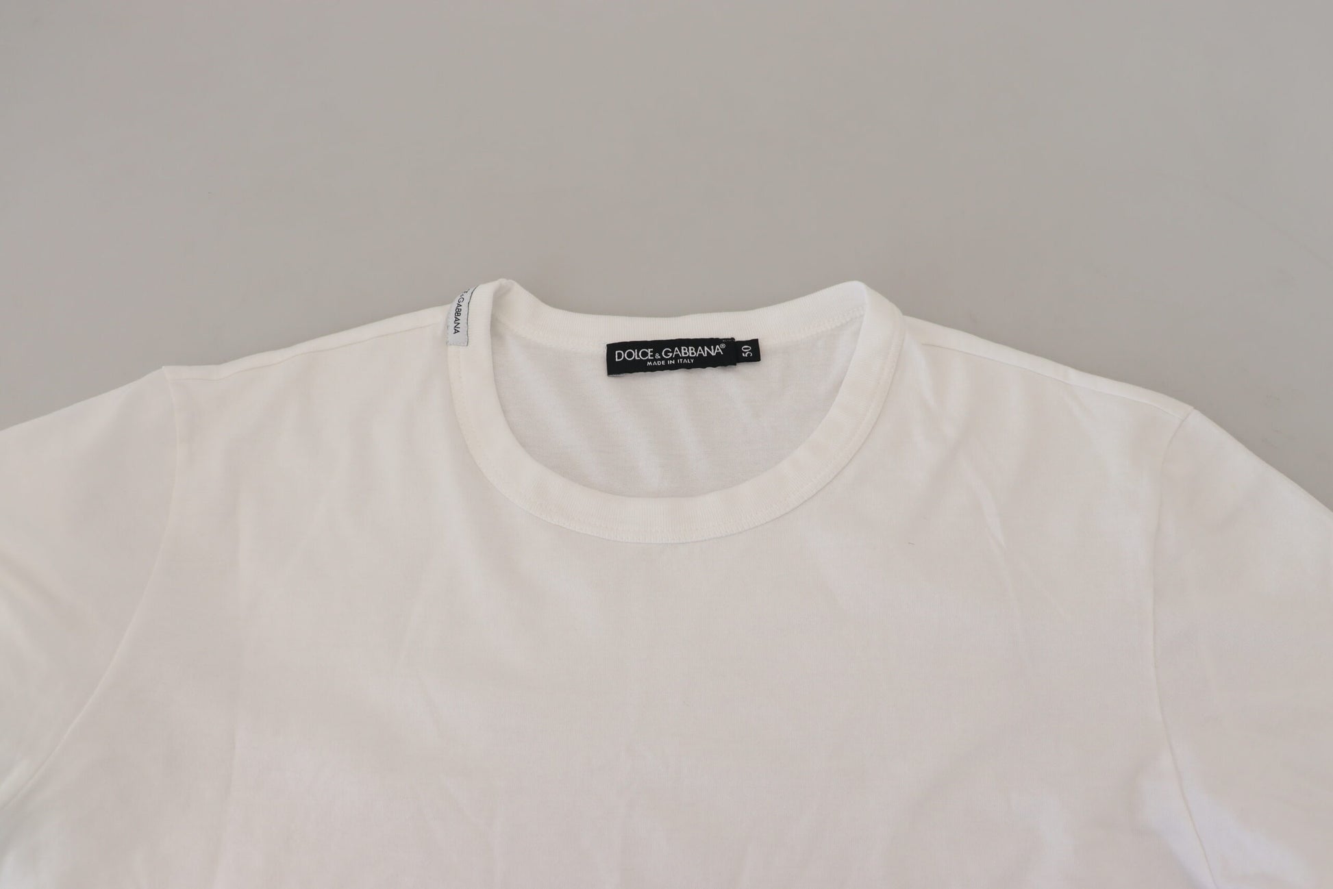 Step up your style game with this elegant white t-shirt from the esteemed Dolce & Gabbana collection. Boasting a sharp crew neckline and classic short sleeves design, this t-shirt is a testament to uncomplicated luxury. Perfect for pairing with jeans or dressing up for an evening out, it’s a versatile addition to any discerning wardrobe. Crafted from pure, soft 100% cotton, this piece ensures both comfort and a flattering fit. Enhance your attire with this timeless, regular fit t-shirt, adorned with the iconic logo detail that adds a hint of prestige to your ensemble. Made with love in Italy, it’s an authentic piece that effortlessly blends heritage with modern style.