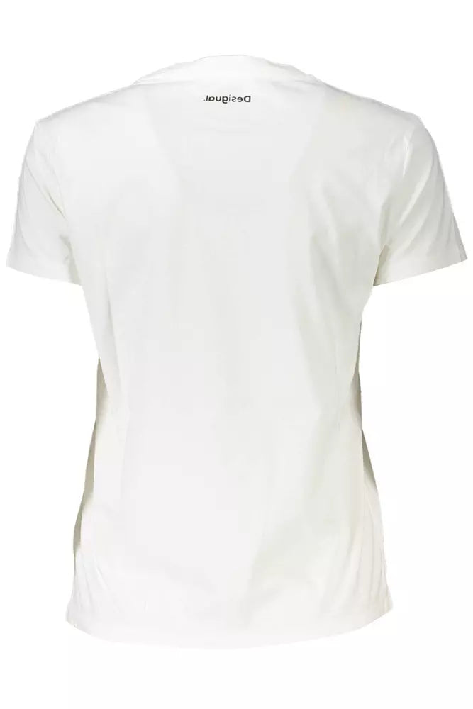 Embrace effortless style with this chic white t-shirt from Desigual, featuring short sleeves and a classic round neckline. Adorned with a vibrant print and the brand’s signature logo, this top is a must-have staple that combines comfort with casual sophistication.