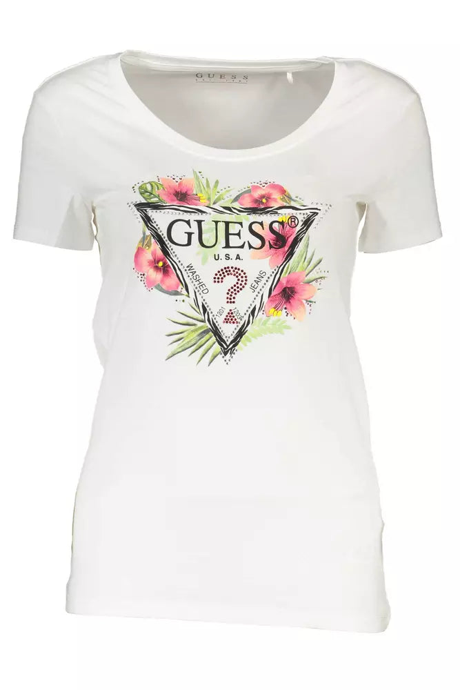 Infuse sophistication into your casual wardrobe with this Guess Jeans short sleeve t-shirt. Elegantly crafted with a wide neckline that flatters any body shape, and adorned with eye-catching print and applications that add a touch of glamour. The iconic logo is tastefully presented, ensuring that your fashion statement is both subtle and impactful.