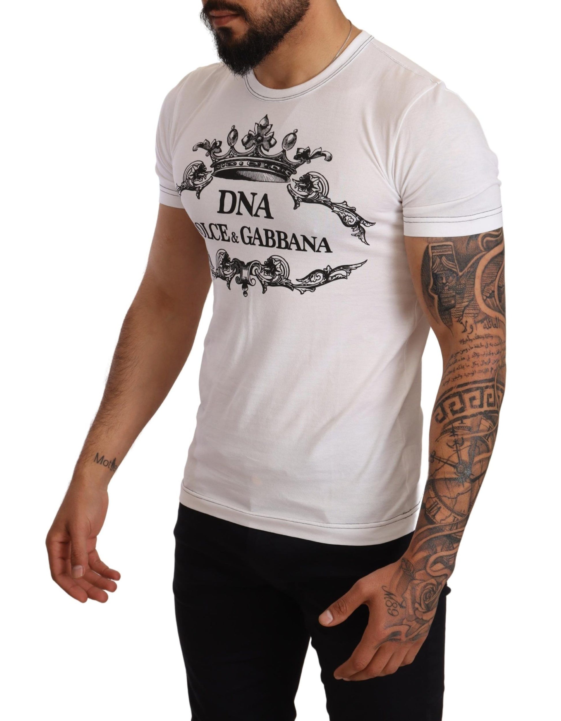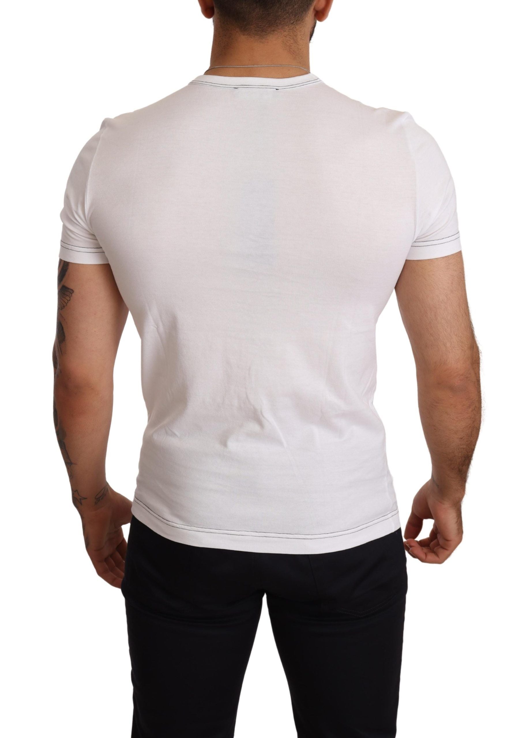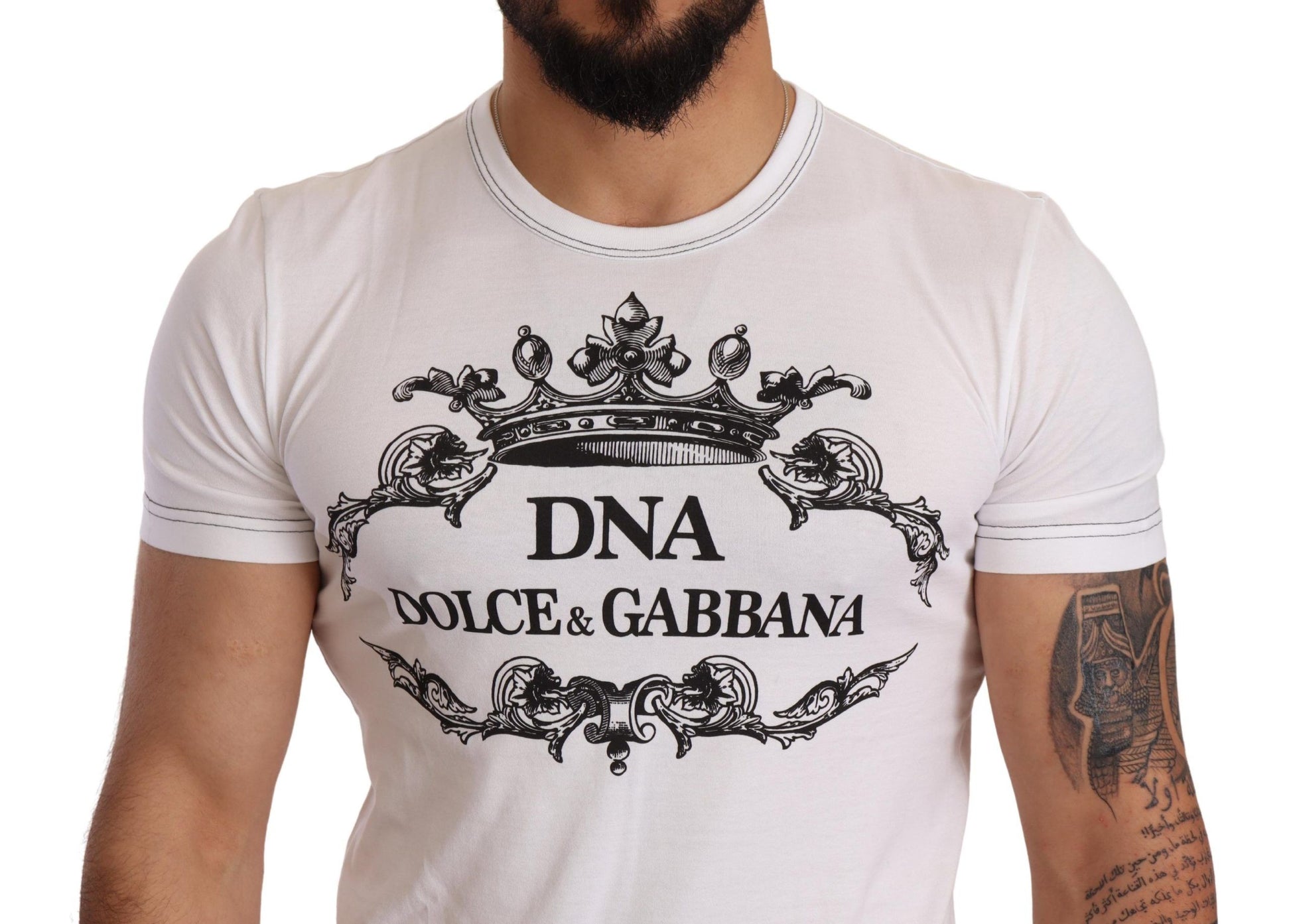 Presenting an artistic blend of comfort and style with this pristine white T-shirt from Dolce & Gabbana. The luxurious 100% cotton fabric ensures you not only carry a piece of high-fashion but also embrace the soft touch and breathability that come with it. Highlighted by the iconic black graphic print that lends an element of bold sophistication, this crewneck tee is a versatile addition to any discerning gentleman’s wardrobe. Elevate your casual outings or layer under a blazer for an unexpectedly chic ensemble.