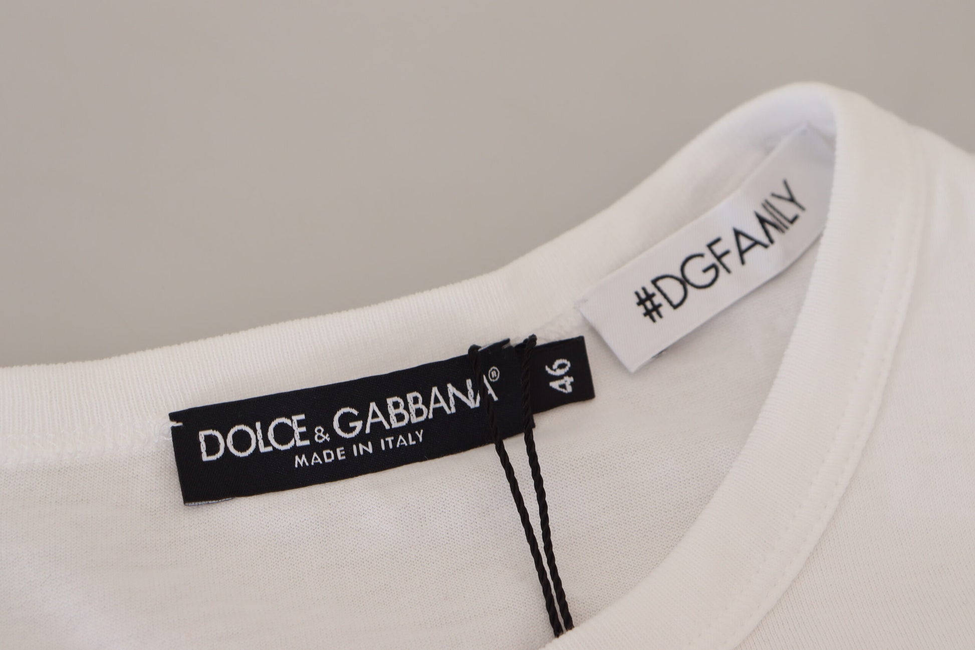 Embrace the epitome of Italian sophistication with our newest luxury garment. This exquisite Dolce & Gabbana t-shirt flaunts a chic #DGFamily logo, crafted from the finest 100% cotton for unmatched comfort and a sleek, regular fit. Its timeless white hue and round neckline design make it a perfect addition to any fashion connoisseur’s wardrobe. Each piece is a testament to exceptional craftsmanship, proudly made in Italy.