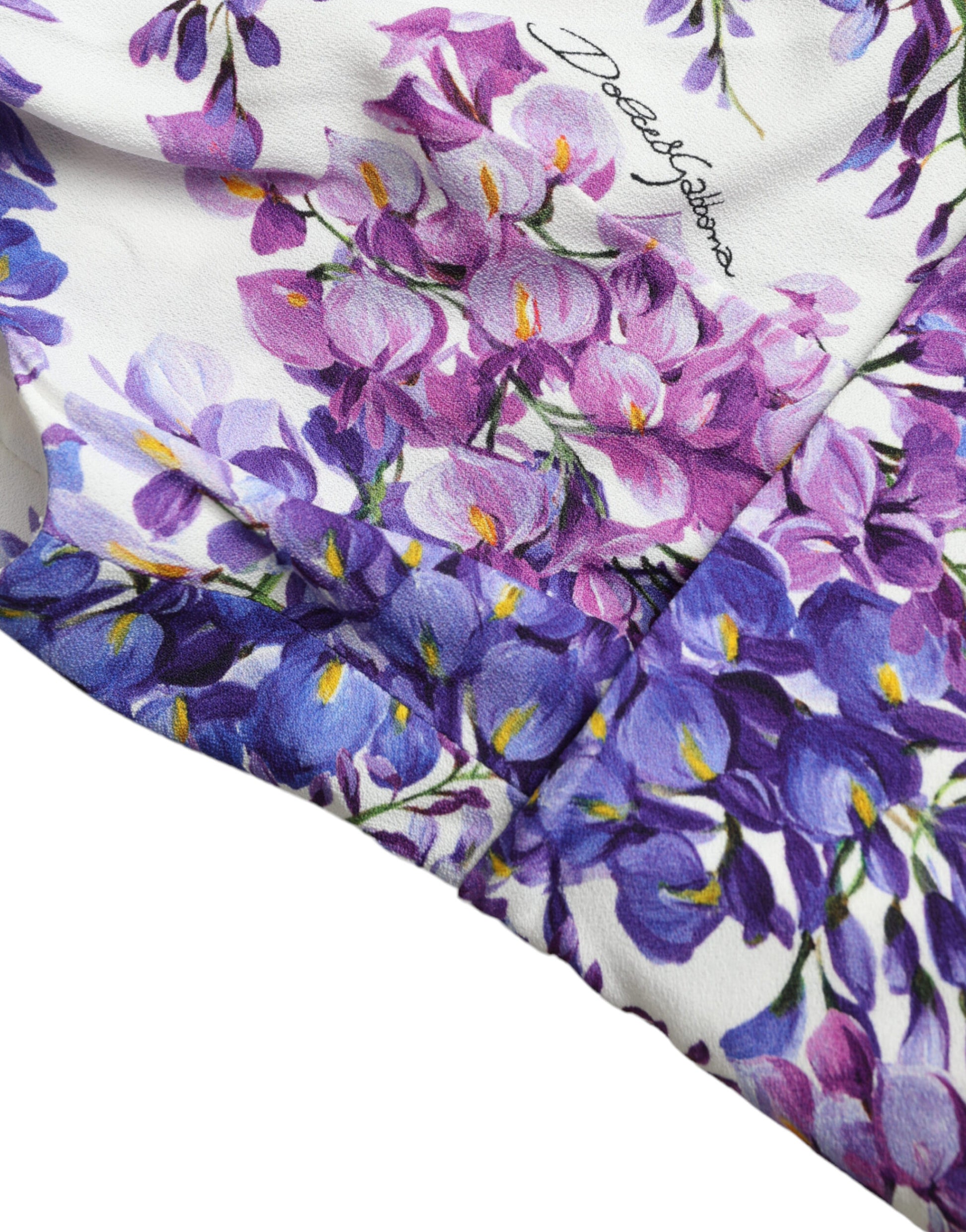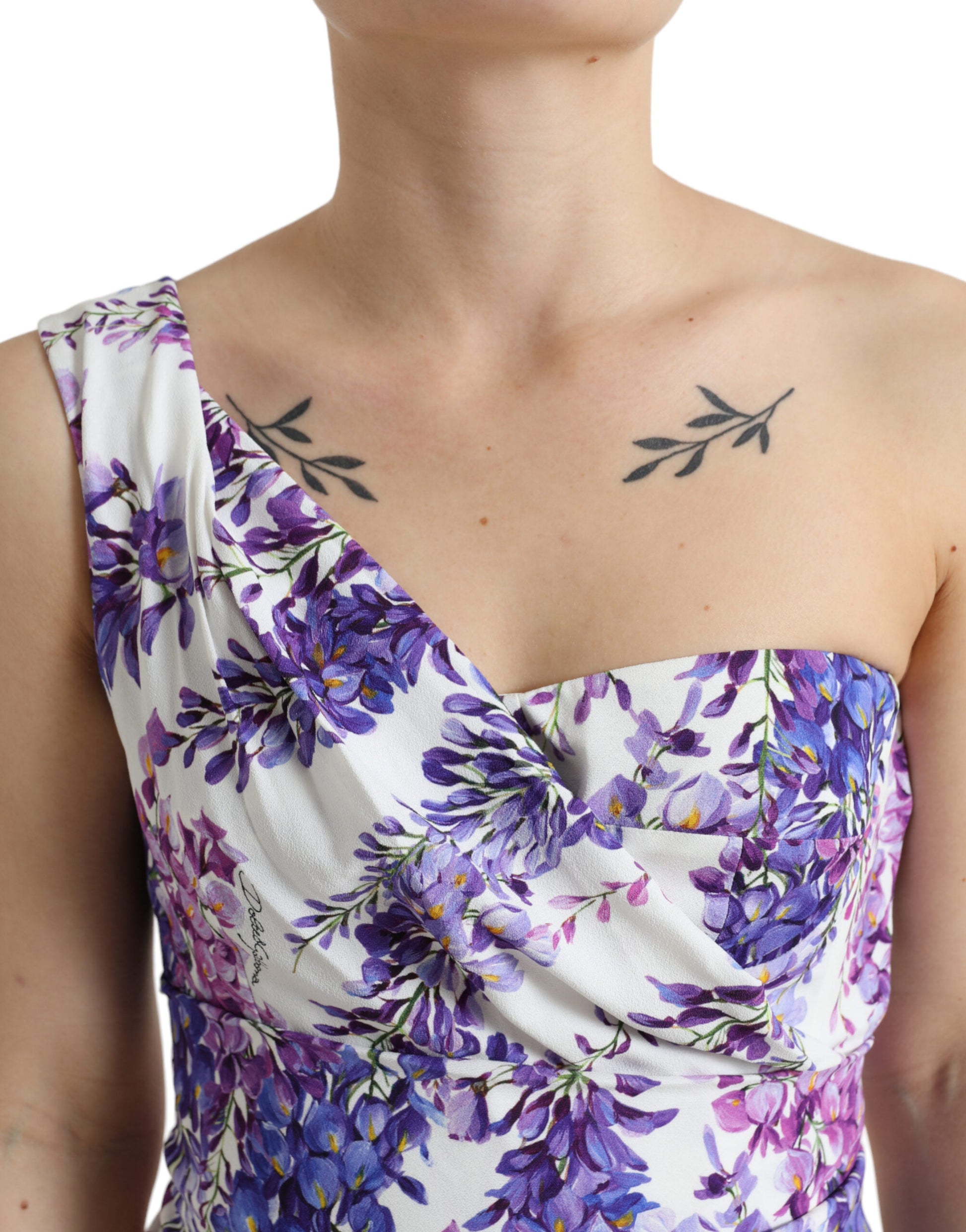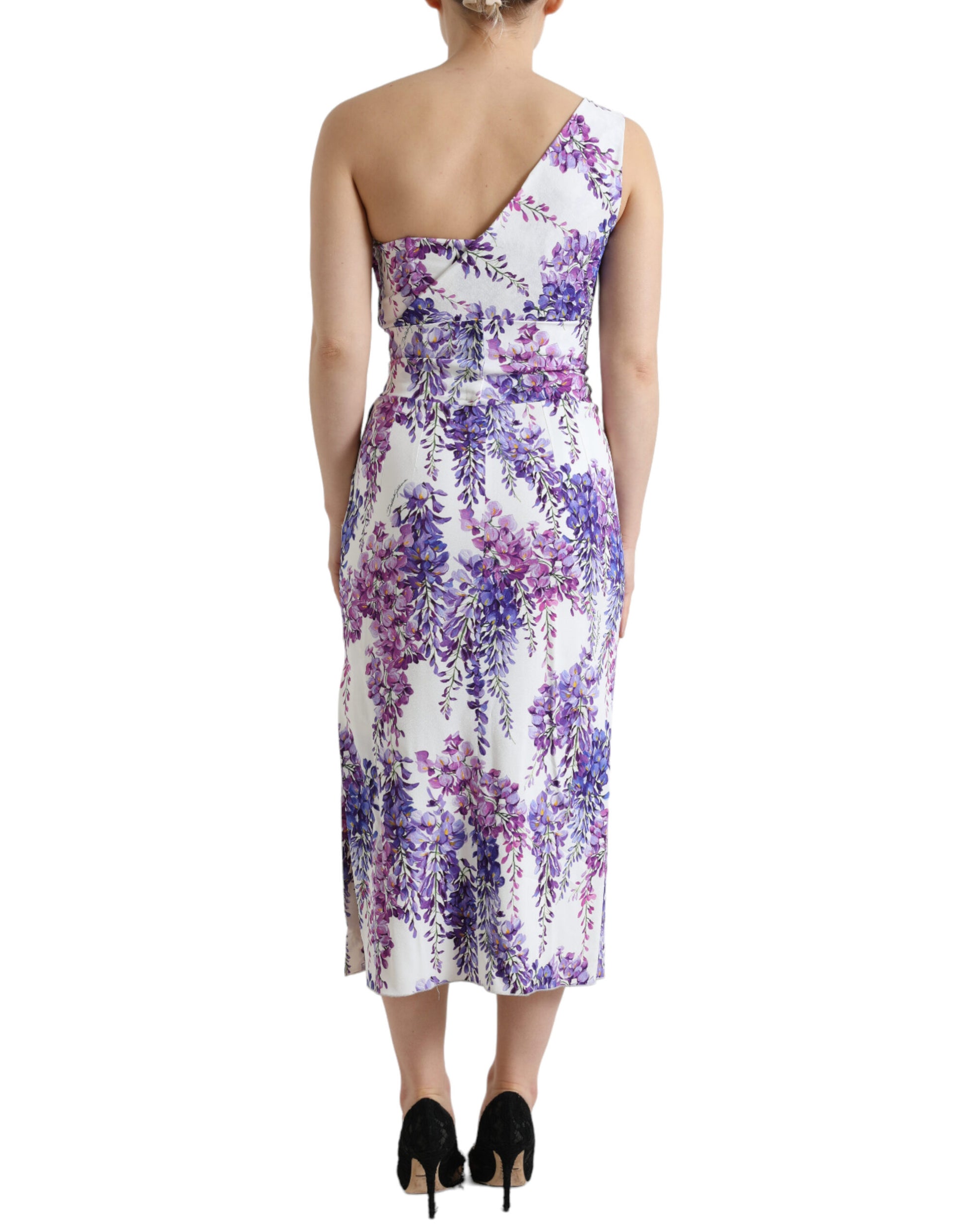 Step into the essence of spring with this exquisite wisteria print midi dress by Dolce & Gabbana. Crafted in Italy, this one-shoulder sheath dress embodies a harmonious blend of charm and sophistication. The white color provides a fresh canvas for the enchanting purple floral print, while the figure-hugging silhouette ensures a flattering fit, perfect for special occasions. Complete with a convenient zip closure on the back, this dress also showcases the brand’s meticulous attention to detail through its subtle logo embellishments.