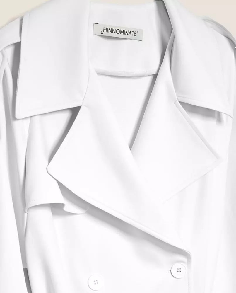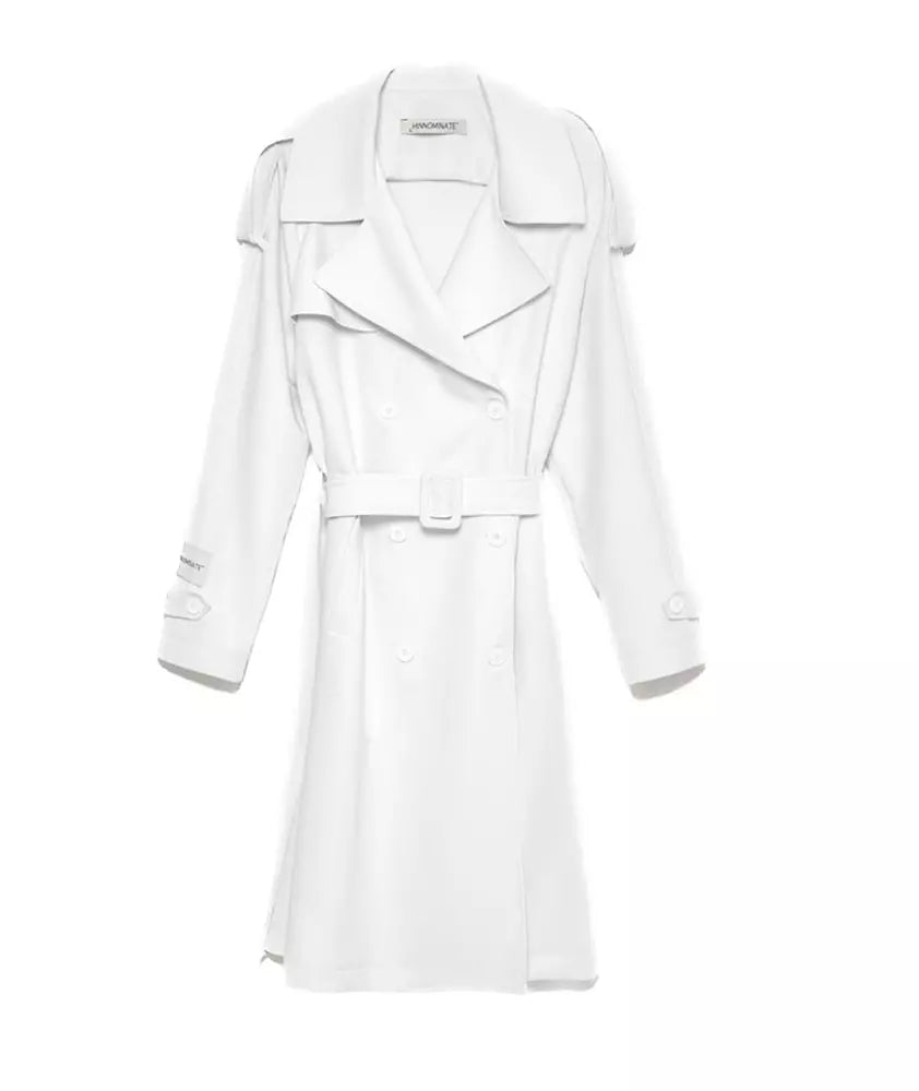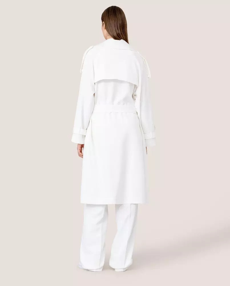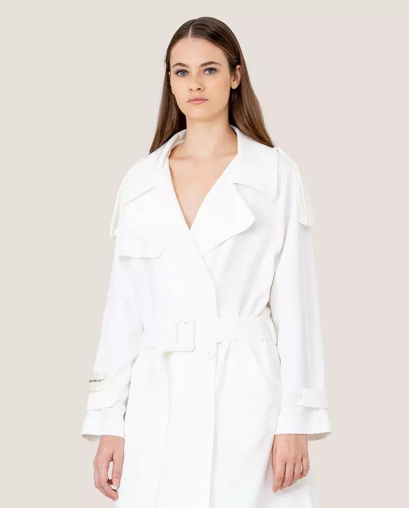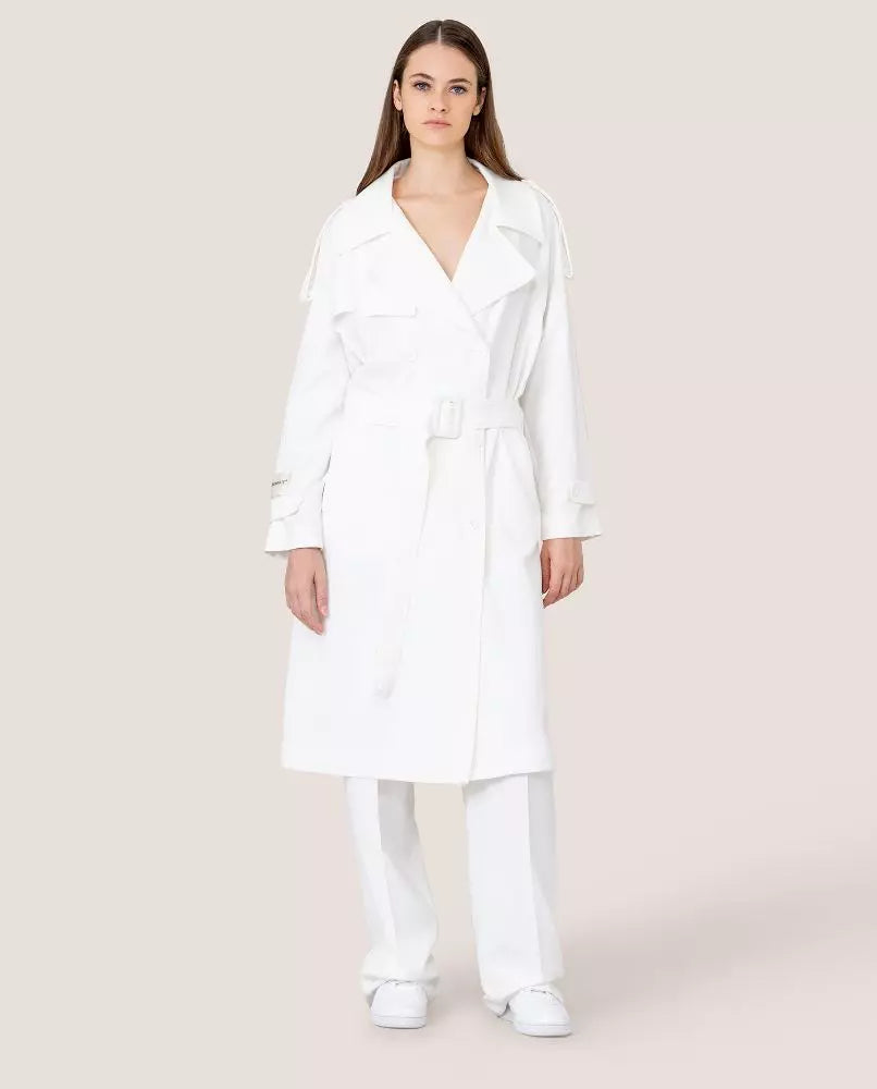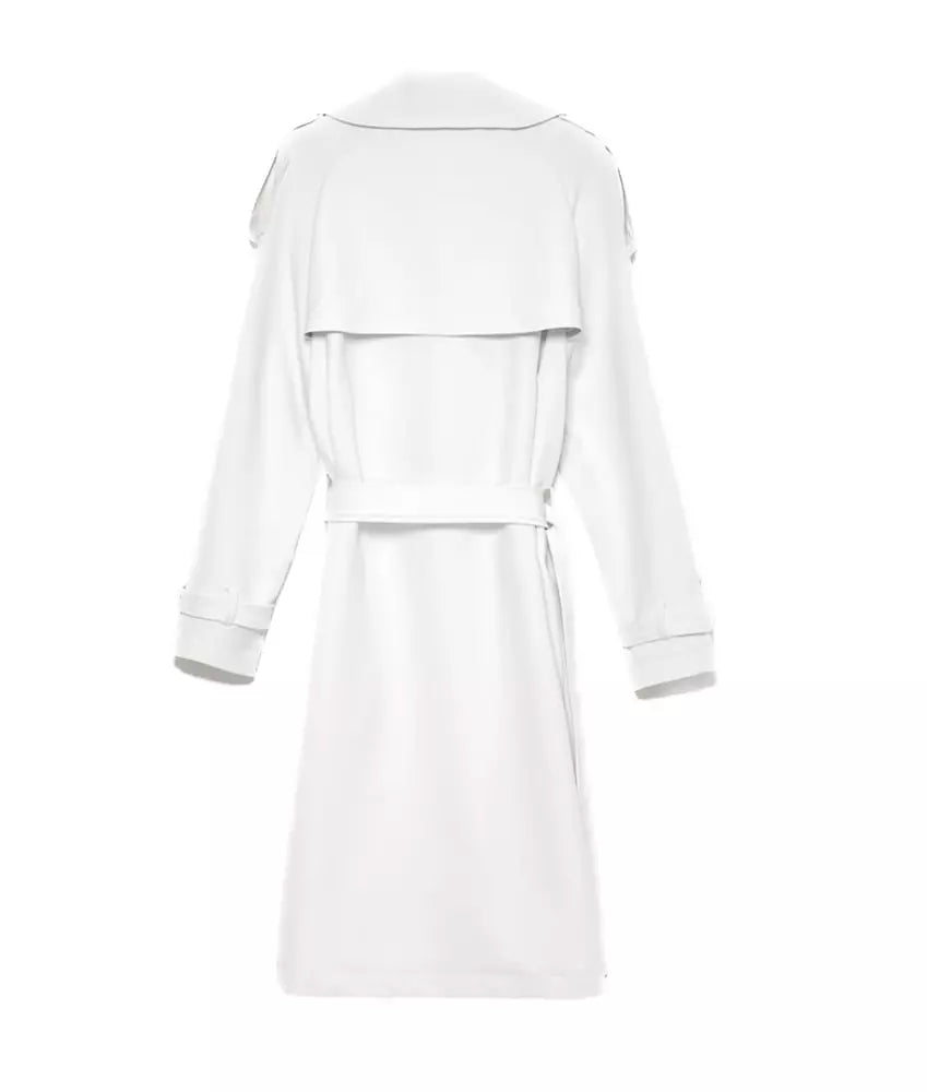 Step out in style with our elegant white trench coat, perfect for transitioning from day to night. This classic double-breasted coat comes with a fabric belt to cinch your waist and add that extra touch of sophistication. Crafted from a blend that offers a hint of stretch for your comfort, this trench is a timeless piece designed in Italy.