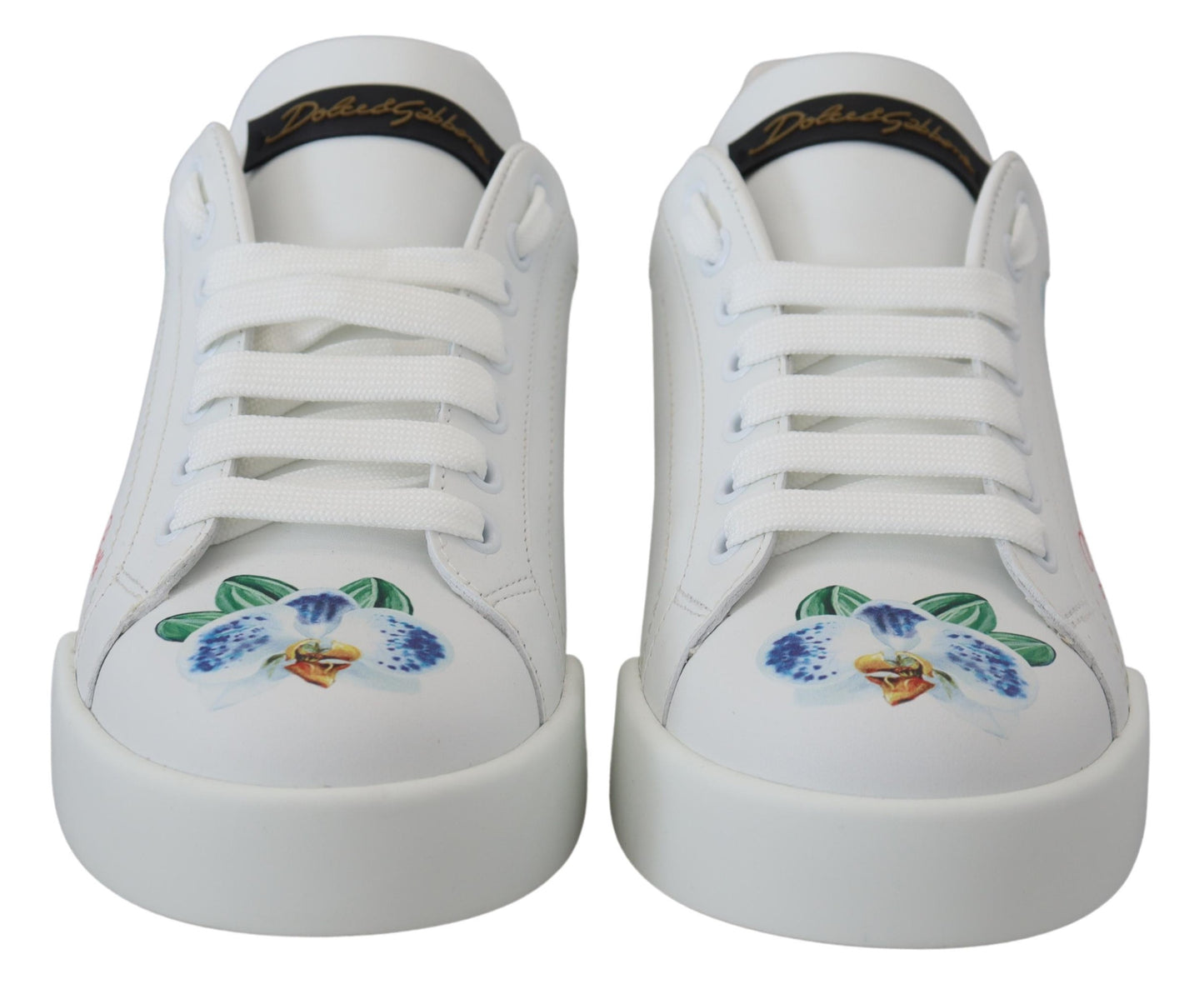 Step into luxury with these Dolce & Gabbana Portofino sneakers, brand new and complete with tags. These white sneakers are adorned with a charming roses print, adding a touch of elegance to the matte smooth leather. A stylish contrast is provided by the red and blue heel tab, alongside a black tongue patch featuring the iconic logo. These sneakers represent the pinnacle of craftsmanship, made in Italy, and are sure to be a coveted addition to any wardrobe, offering both an exclusive look and premium comfort.