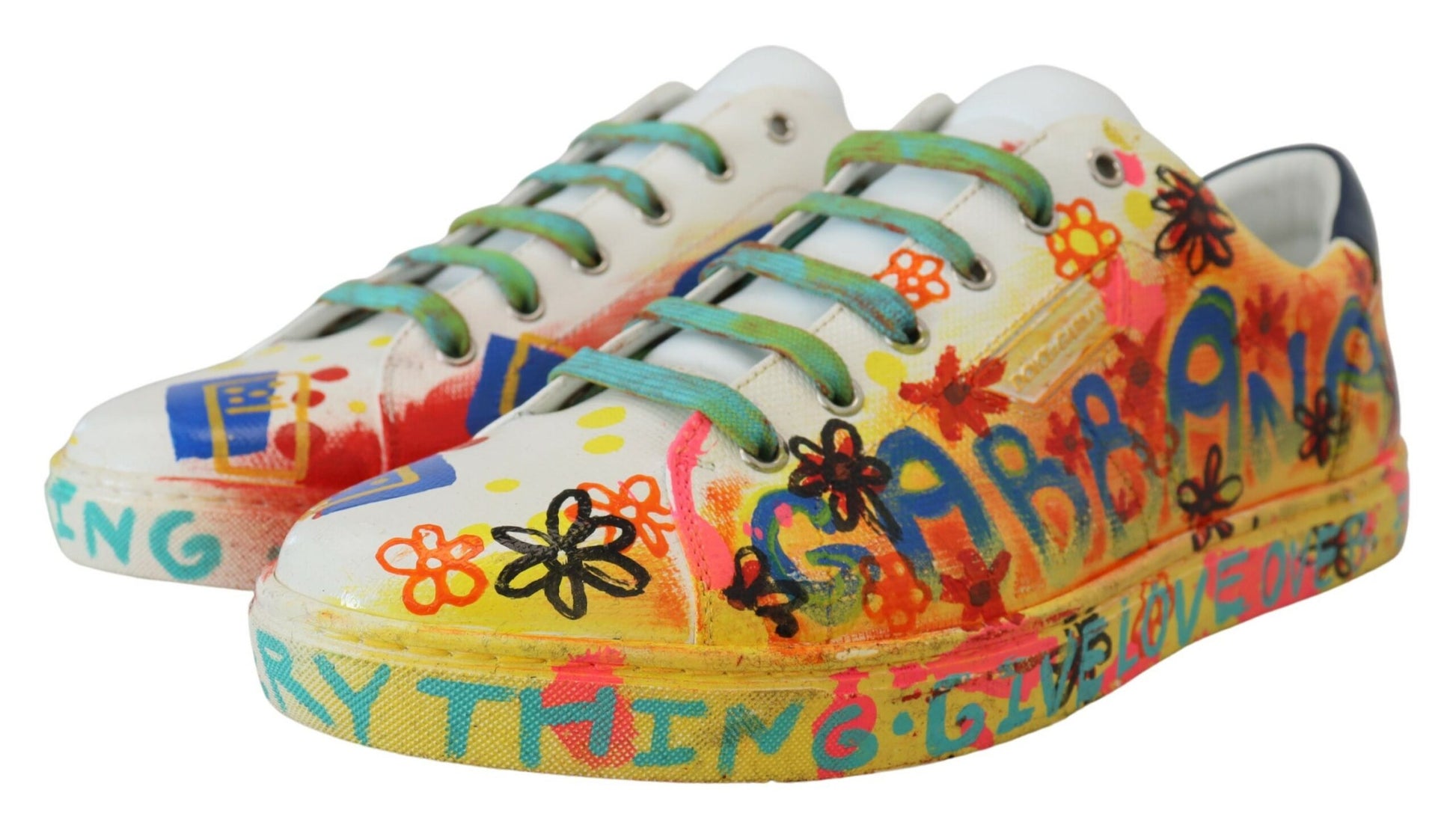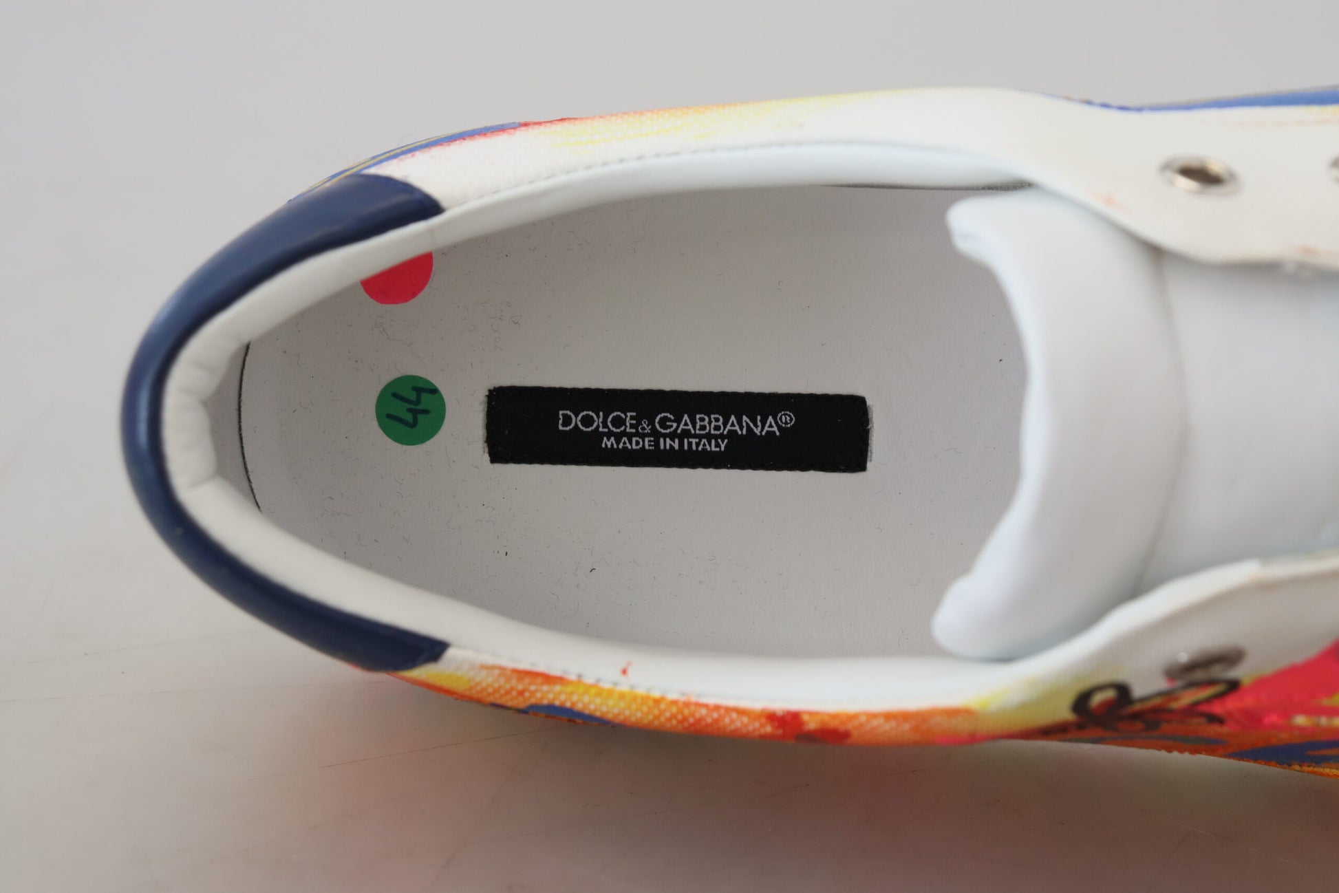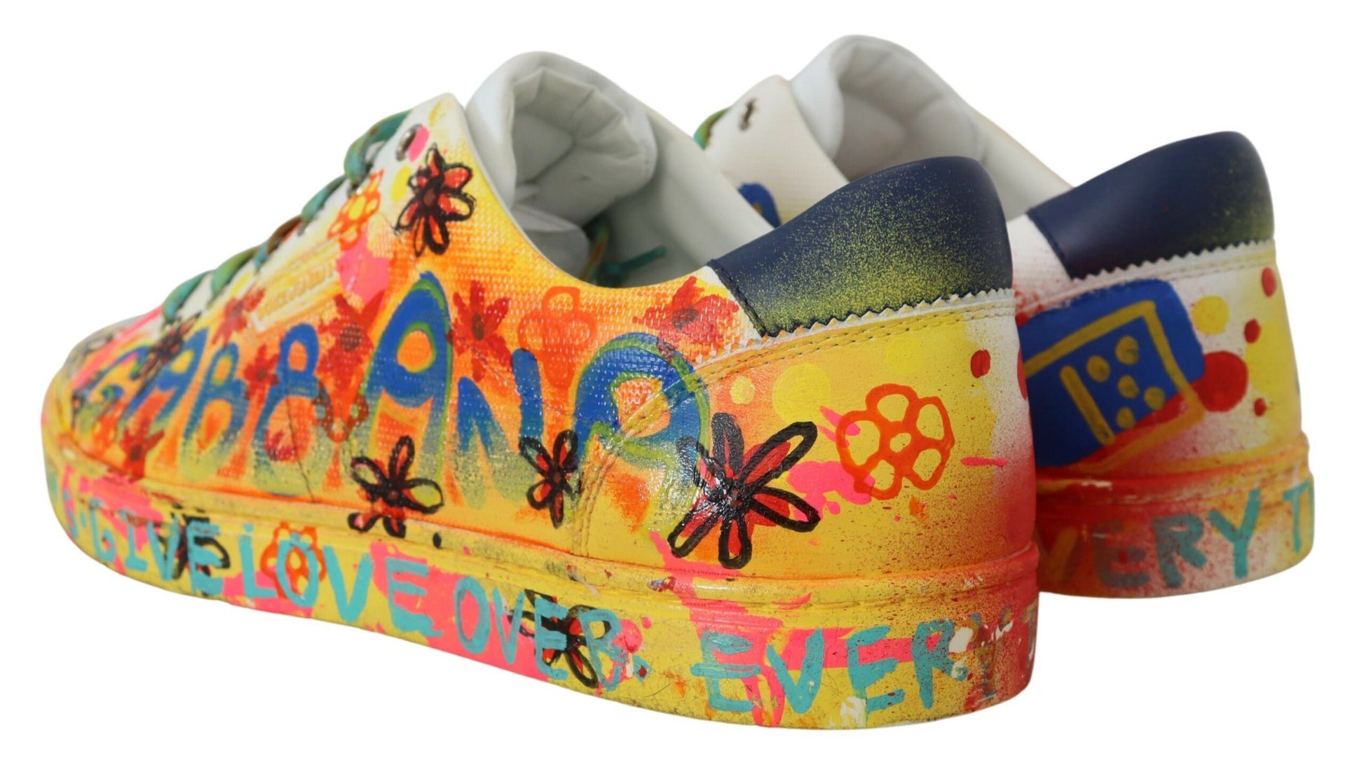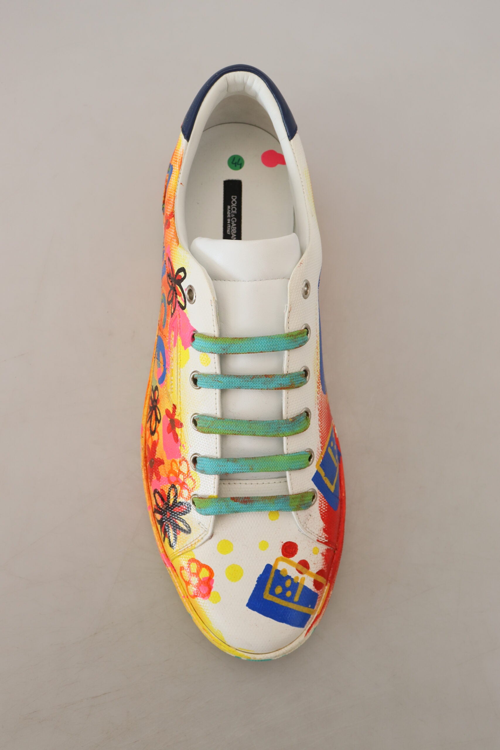 Step out in style with these exquisite white low top sneakers, accented with vibrant, multicolor handpainted detailing. Crafted from the finest 100% leather, these shoes marry comfort with pure Italian craftsmanship. Perfect for the fashion-forward individual, they feature a durable rubber sole and signature logo details. Designed and made in Italy by Dolce & Gabbana, these sneakers are a statement piece for your footwear collection.