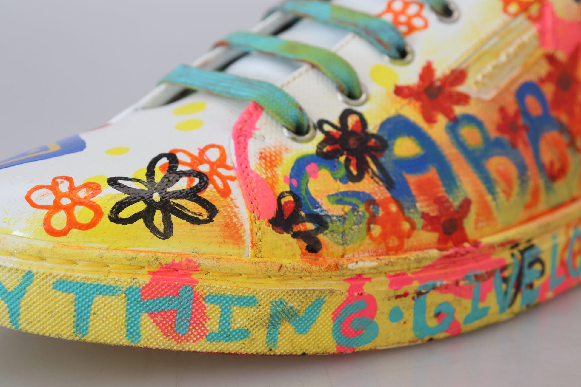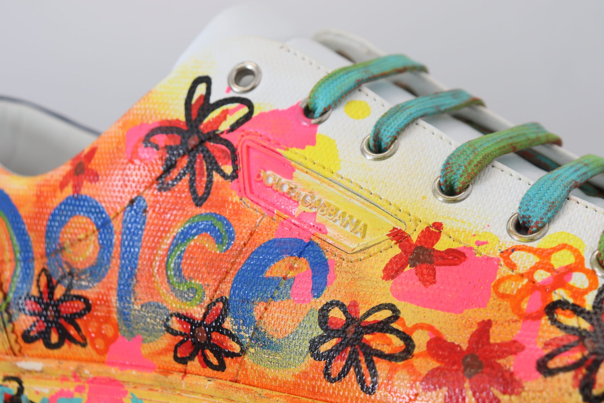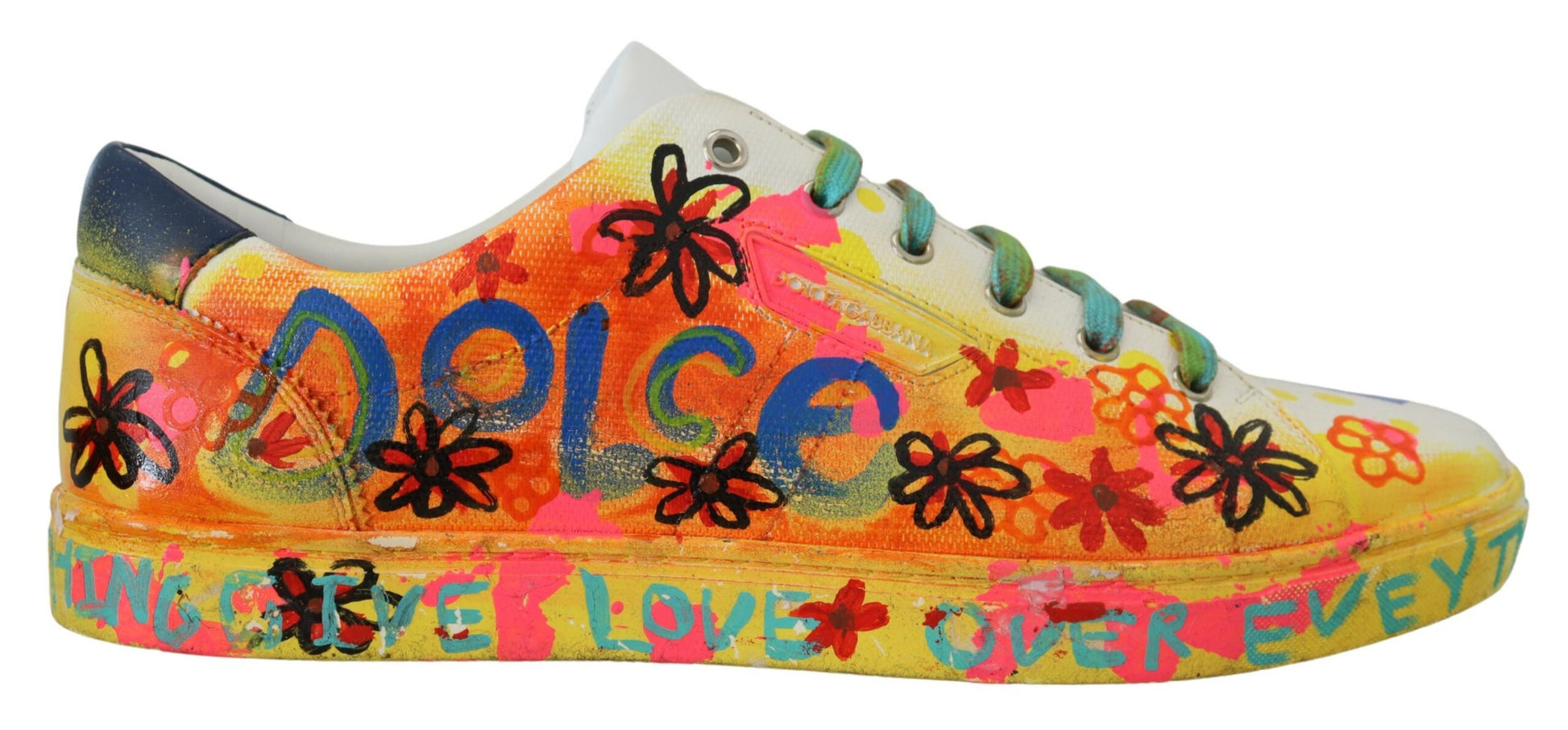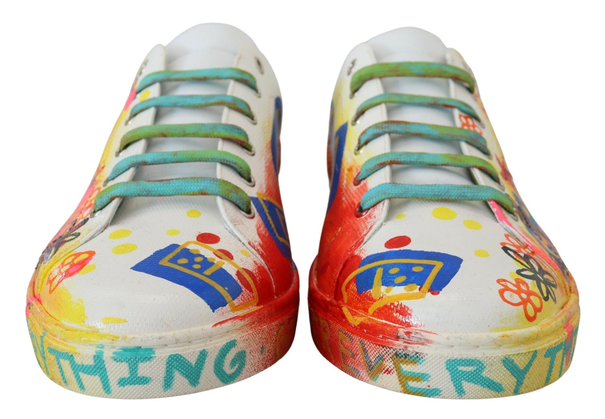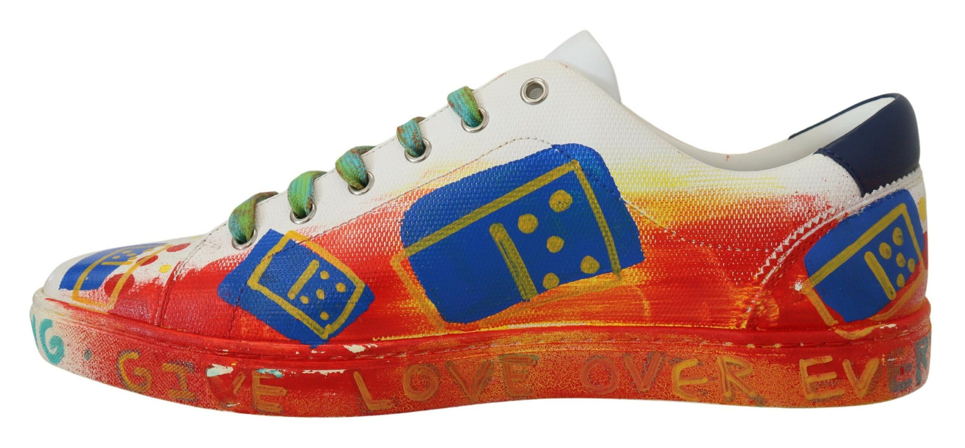 Step out in style with these exquisite white low top sneakers, accented with vibrant, multicolor handpainted detailing. Crafted from the finest 100% leather, these shoes marry comfort with pure Italian craftsmanship. Perfect for the fashion-forward individual, they feature a durable rubber sole and signature logo details. Designed and made in Italy by Dolce & Gabbana, these sneakers are a statement piece for your footwear collection.