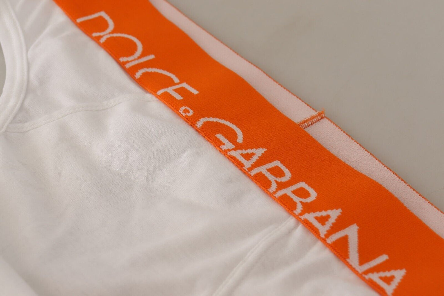 Step into luxury with our exclusive Dolce & Gabbana signature underwear in crisp white accented with a vibrant orange waistband. Crafted from superior quality cotton, these briefs offer both exceptional comfort and a great fit. Designed with style in mind, the bold waistband features the distinctive logo branding, adding a touch of elegance to your everyday wear. Made in Italy, these briefs promise to be a stylish and comfortable addition to your wardrobe.