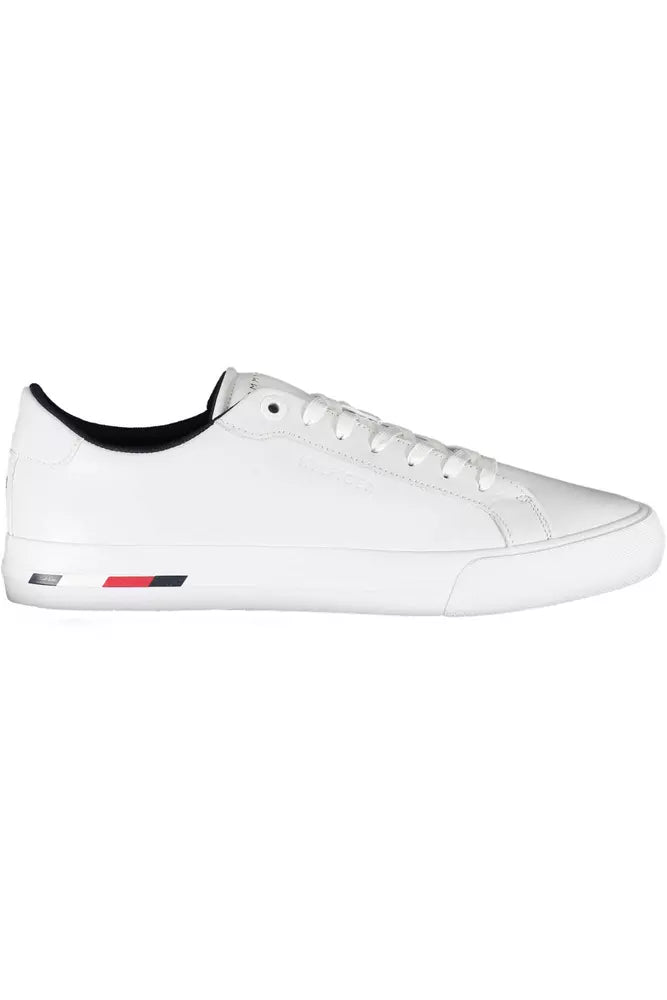 Step up your footwear game with these sleek white sneakers adorned with eye-catching contrasting details and a distinctive logo. Crafted by the renowned Tommy Hilfiger, these shoes are not only on-trend but eco-conscious, made from 100% recycled polyester. Whether for sports or style, stride in comfort and confidence.