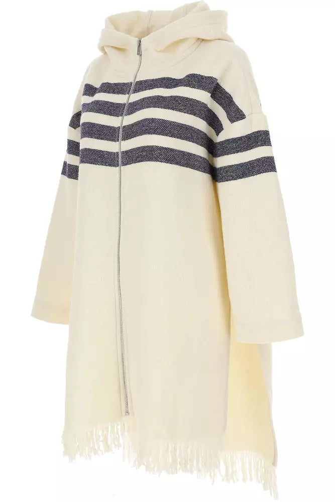 Indulge in the warmth and style of this sophisticated wool blend coat. Perfectly balancing comfort with elegance, the coat features contrasting stripes for a chic, modern touch. The cowl neck design and wide sleeves with a unique set-in add a sense of luxury, while the side slits and fringe detailing at the hem bring an artistic flair to your outerwear collection. Fastened with a front metal zip, this piece is crafted in Italy with a dedication to quality and style.