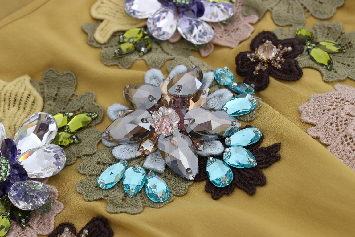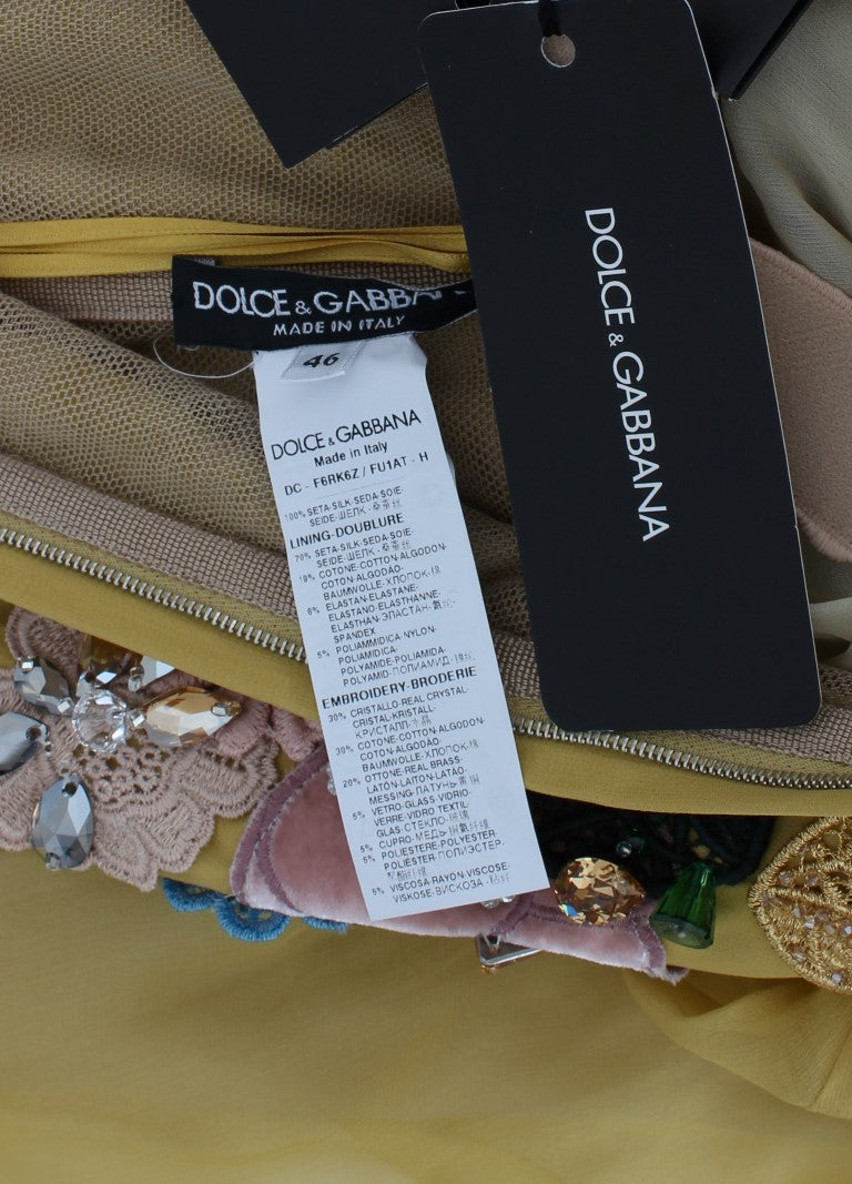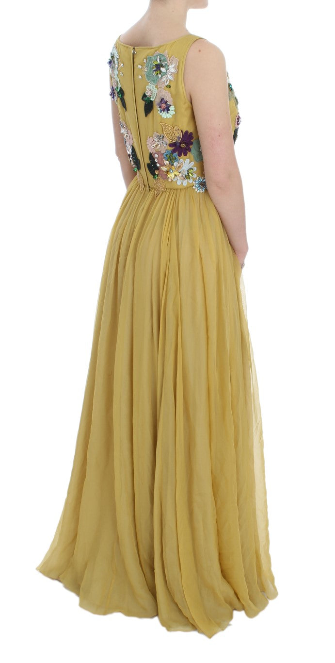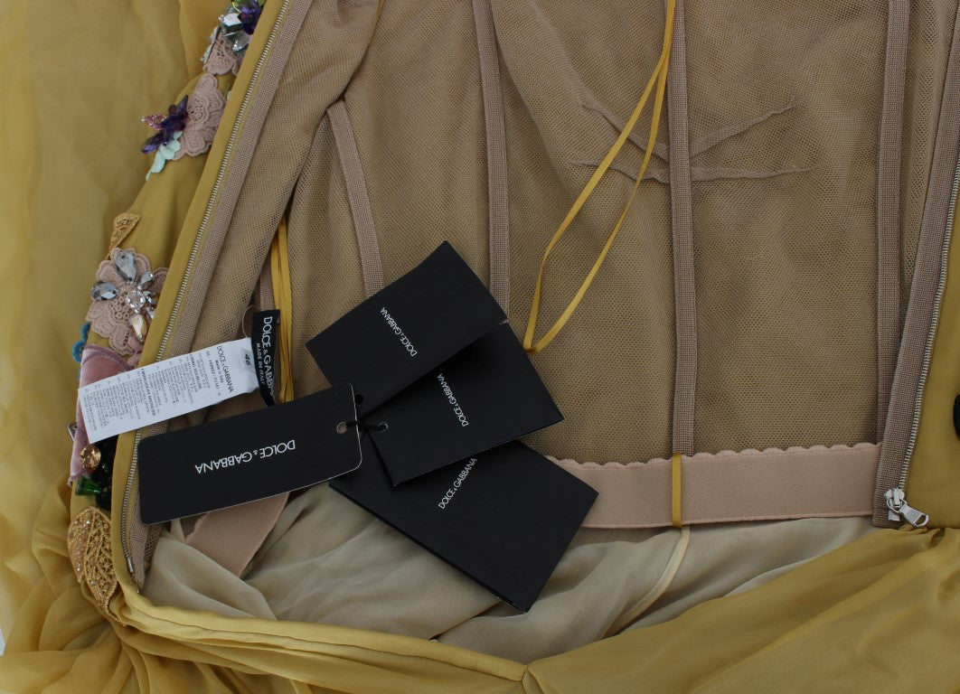 Step into the spotlight with this breathtaking Dolce & Gabbana yellow silk ball gown, embellished with vibrant floral appliqués and sparkling multicolor crystals. A full-length design that showcases meticulous Italian craftsmanship and an inner corset to ensure the perfect fit, this dress is a masterpiece that will turn heads at any high-profile event. Its luxurious silk fabric drapes elegantly, making it an exquisite choice for gala nights, weddings, and exclusive gatherings where making a stunning impression is key.