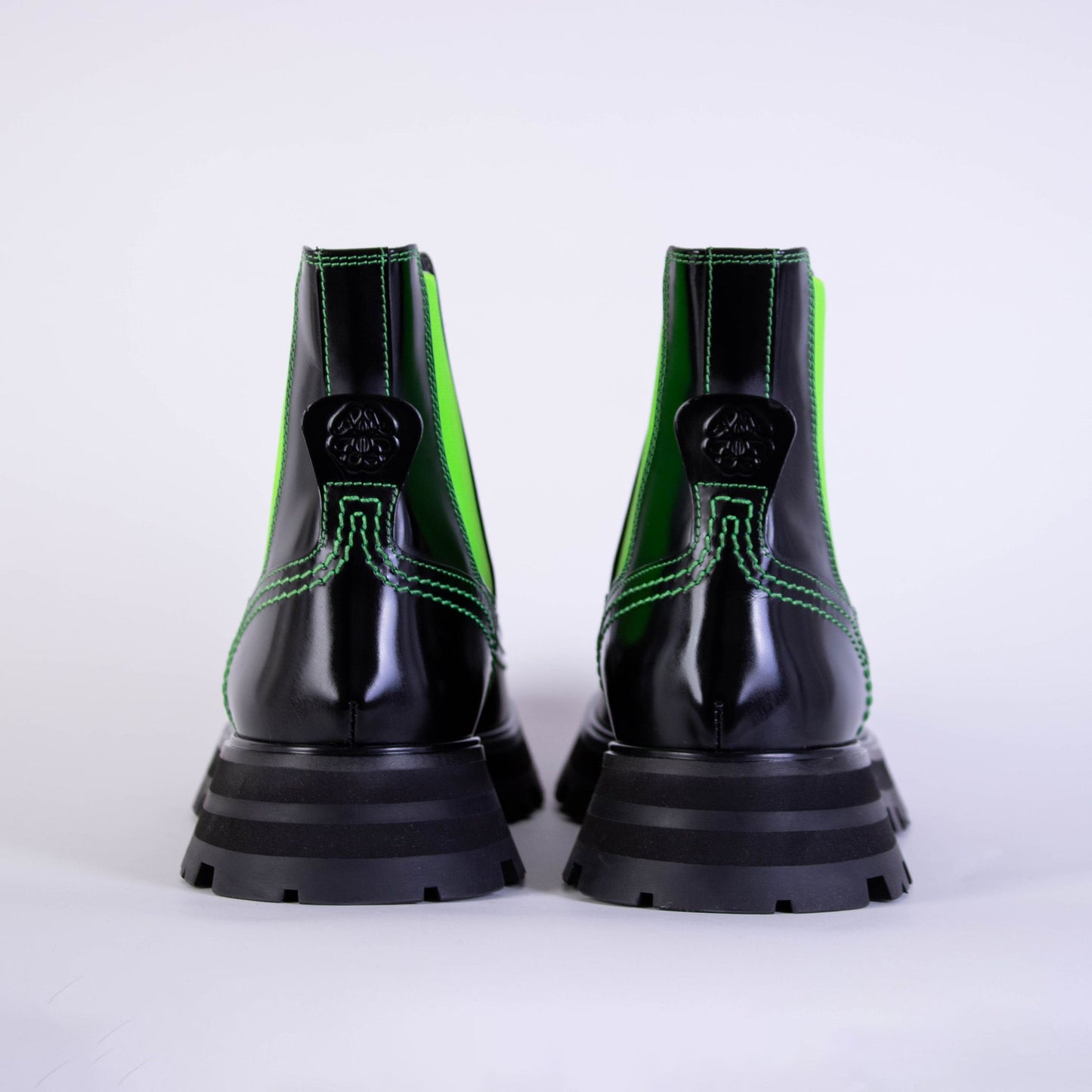 Step into the world of high fashion with these stunning Alexander McQueen Chelsea boots. These boots are not only a symbol of style but also a masterpiece of craftsmanship, perfect for those who appreciate luxury and unique design. The black brushed leather is immaculately paired with fluorescent green stitching for a pop of color that truly stands out. The flared notched sole and layered heel add a modern twist to the classic silhouette, ensuring your ensemble is nothing short of extraordinary. The back tongue proudly displays the printed logo, while the elasticated bands on the sides feature the same vibrant fluorescent green, guaranteeing a snug and comfortable fit.