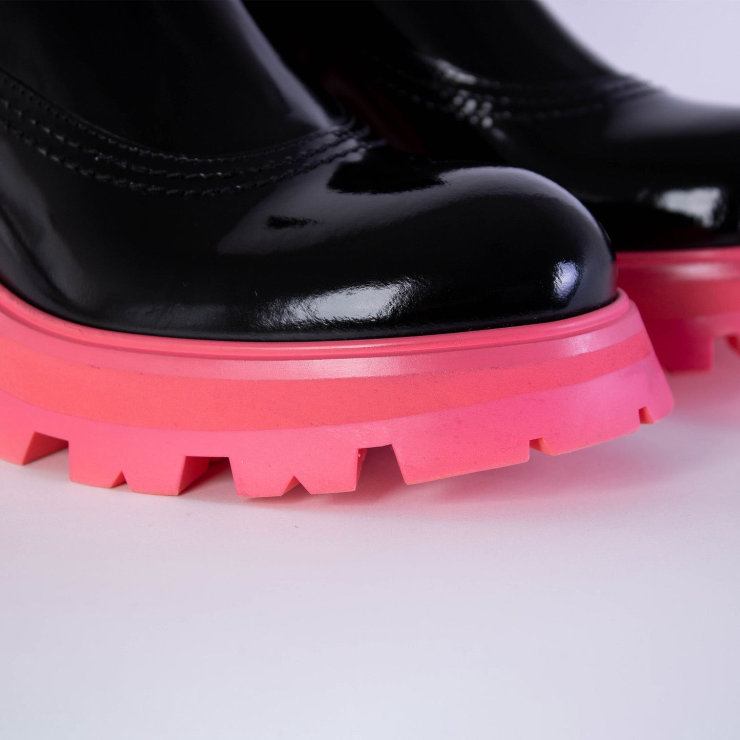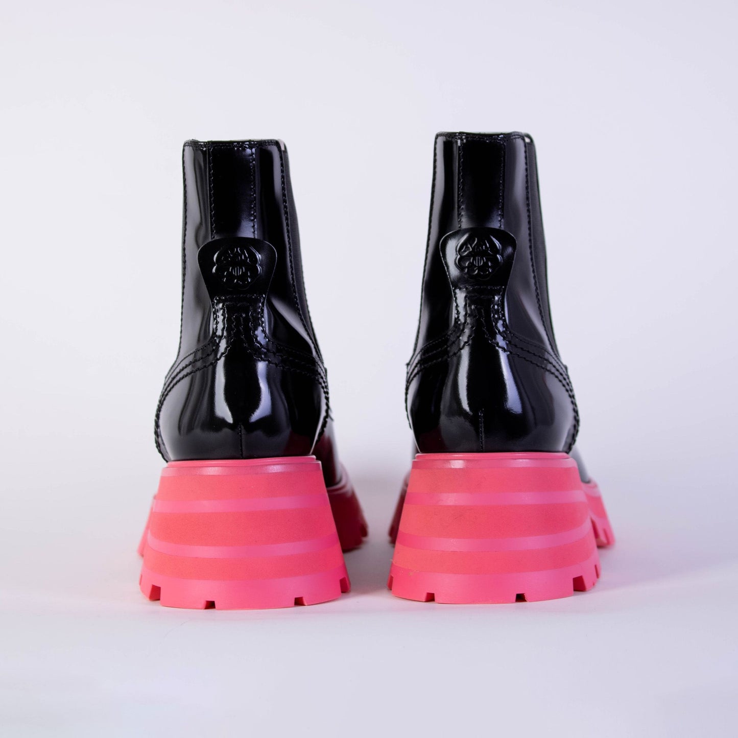 Step out in style with these exquisite Chelsea boots crafted by the renowned Alexander McQueen. Made with high-quality leather, these boots feature a classic black finish complemented by the striking contrast of a fluo pink oversized flared notched sole that adds a pop of color and avant-garde flair. The impeccable craftsmanship is evident in every stitch, and the boots boast a back tongue with the signature Alexander McQueen logo. These boots are not just a fashion statement but a testament to luxury and exclusivity, perfect for those who appreciate fine Italian crafting.