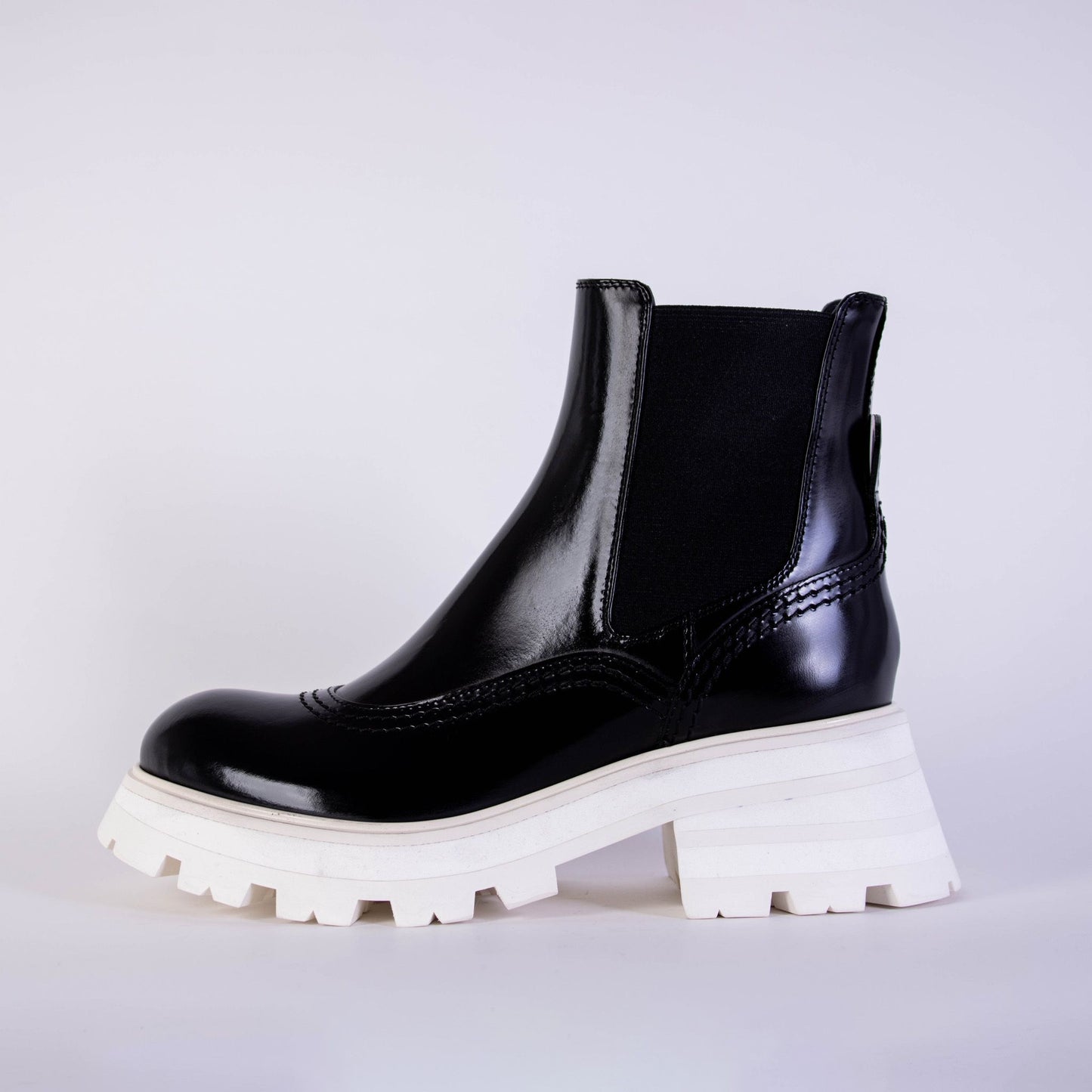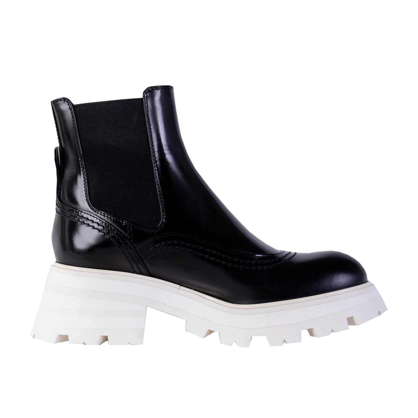 Discover the epitome of modern style with these exquisite Leather Chelsea Boots. Crafted by the renowned Alexander McQueen, these boots feature a sophisticated black hue, complemented by their signature contrasting white oversized, flared notched sole. The high-quality craftsmanship inherent to the brand is evident in every stitch, and the back tongue boasts the prestigious printed logo. Designed for the fashion-forward, these boots are made in Italy and showcase exceptional luxury and finesse.