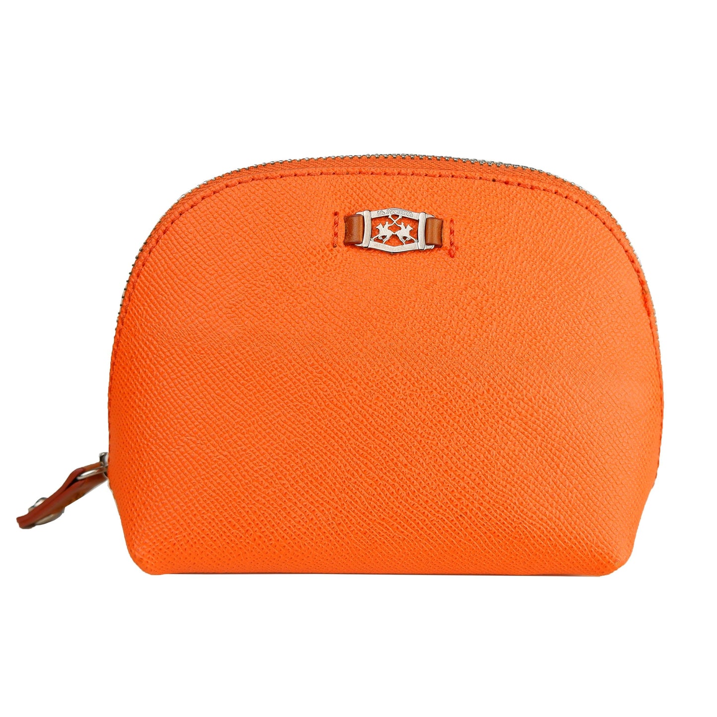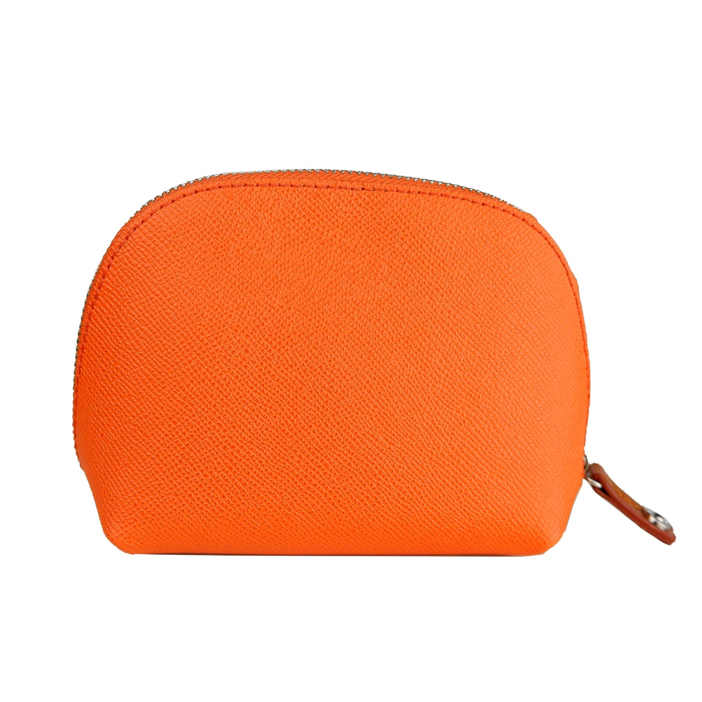 Step out in style with this vibrant orange cosmetic bag, perfect for keeping your essentials secure and organized. Made from the finest calfskin leather, this bag not only speaks elegance but also functionality with its built-in card and coin holder. The sleek design is accented with a prominent brand logo, making it a standout accessory. Compact yet spacious, it measures 18x12x7 cm, ideal for daily use or special occasions.