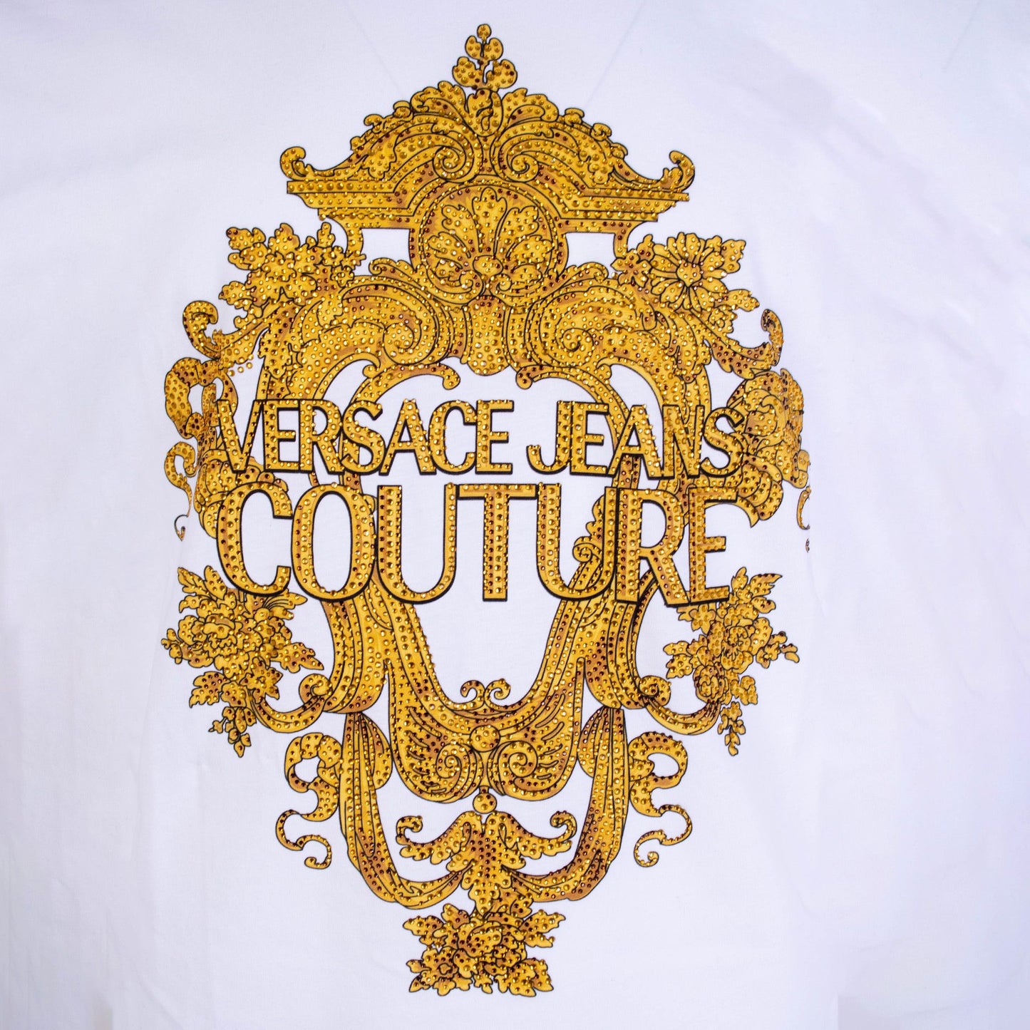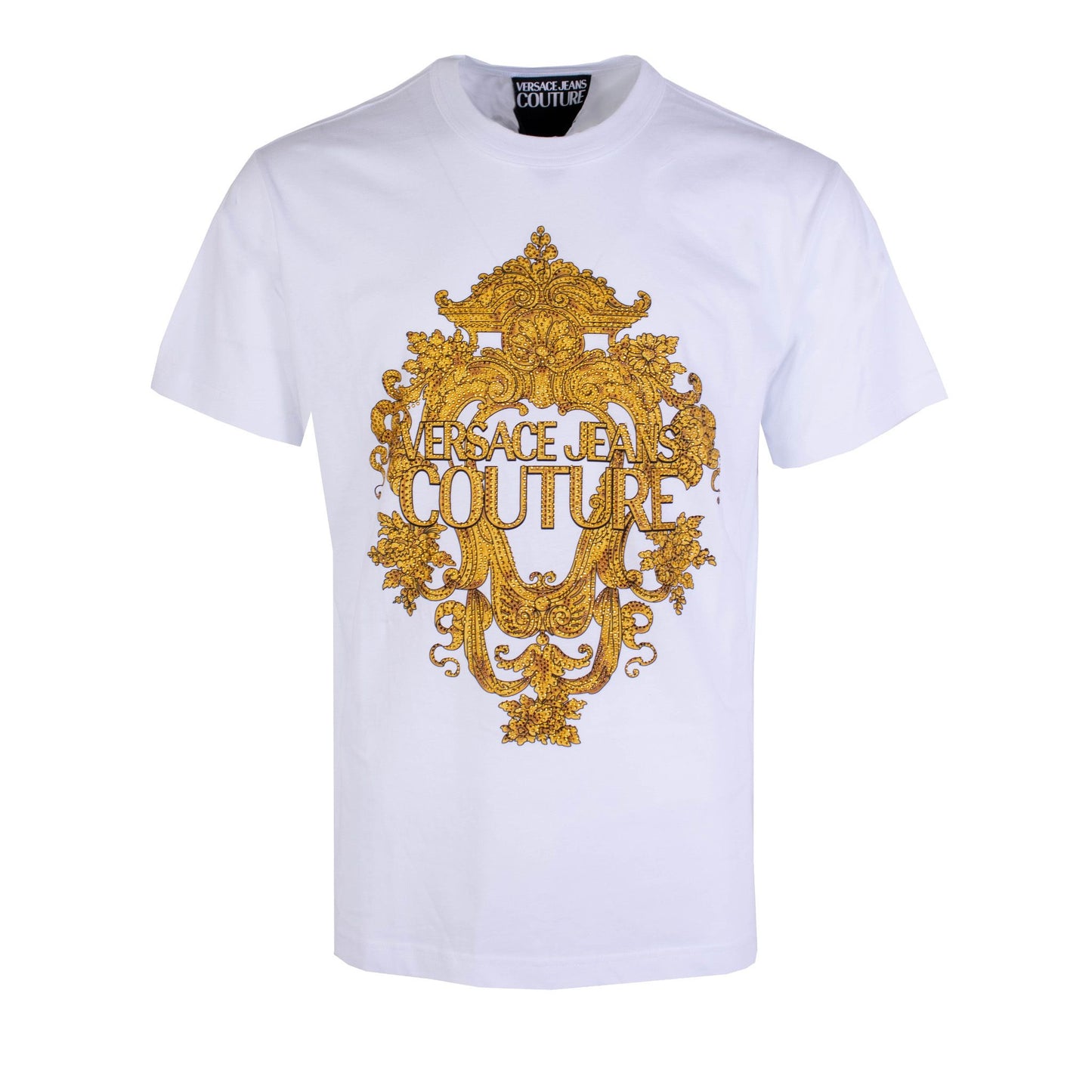 Indulge in the epitome of luxury and style with our Versace Jeans Couture White T-Shirt. This exquisite piece boasts a lavish Gold Crystal Baroque Print, adding an opulent touch to your everyday attire. Crafted in Turkey, this T-shirt guarantees authenticity and top-quality, brand new with tags. Its 100% cotton composition ensures a comfortable regular fit, perfect for both casual and sophisticated looks.