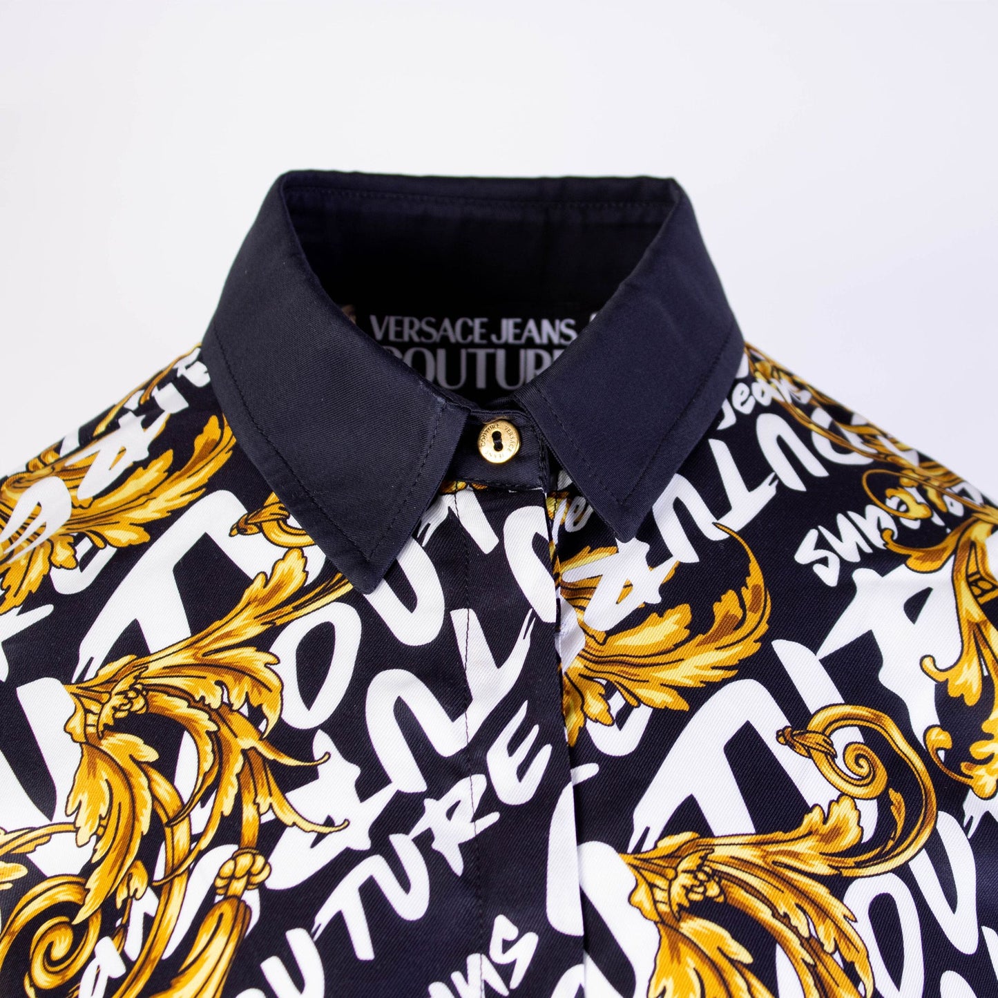Embrace the opulence of this captivating Versace Jeans Couture Baroque Printed Shirt. A statement piece that is brand new with tags, boasting a luxurious print in gold and black, tailored to offer a relaxed fit that flatters the silhouette. Elegantly finished with a front closure featuring tastefully covered buttons, it bears contrasting collar and cuffs to add a striking touch of sophistication to your wardrobe. Manufactured in Albania, this designer shirt is crafted from premium quality viscose, ensuring a soft, smooth feel against the skin.