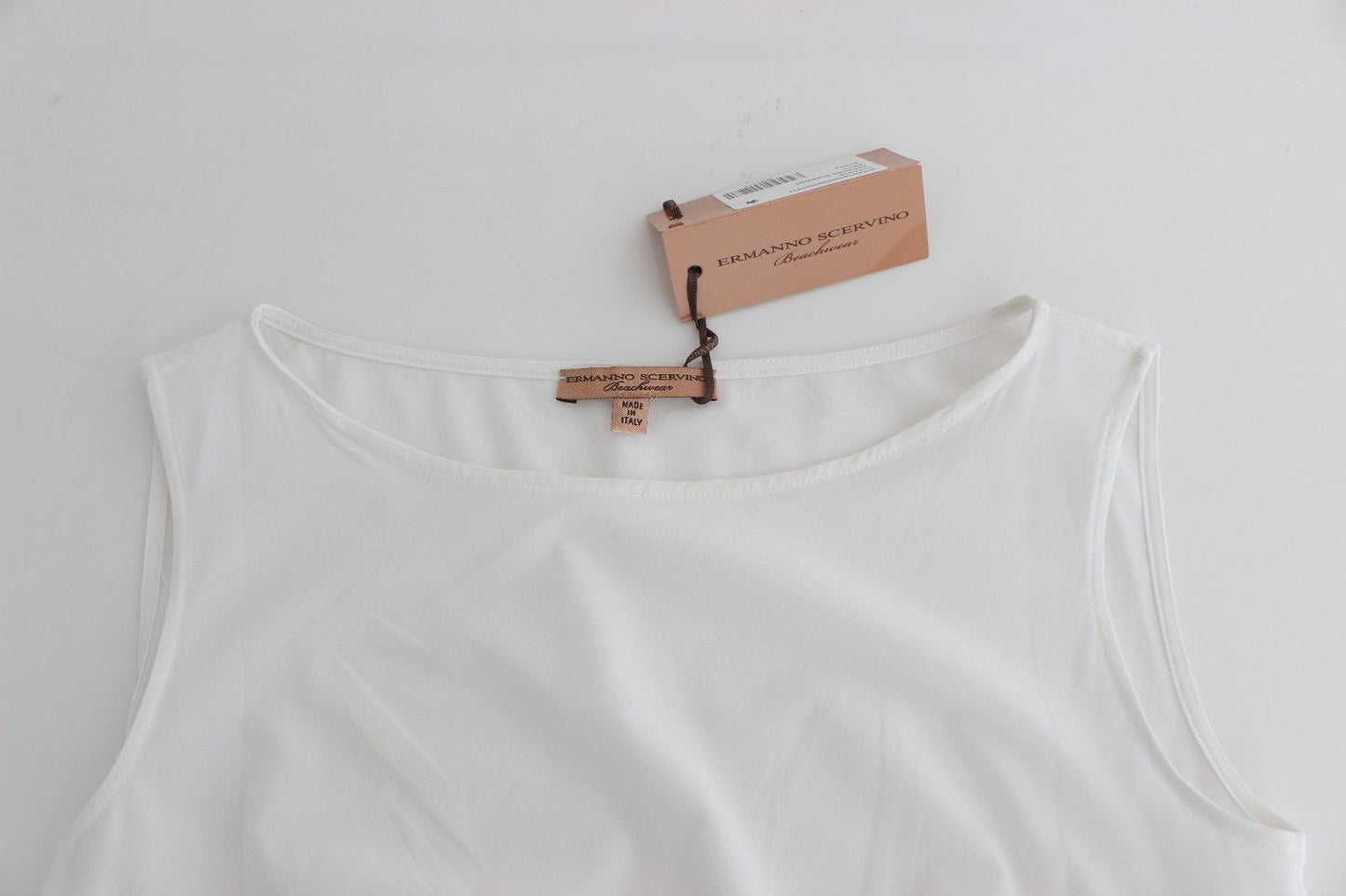 Indulge in the epitome of beachside luxury with this stunning sleeveless Ermanno Scervino maxi/kaftan dress. Brand new with tags, it captures the essence of sophisticated leisure. Its solid white color and flowing full-length skirt make it a perfect blend of elegance and comfort.