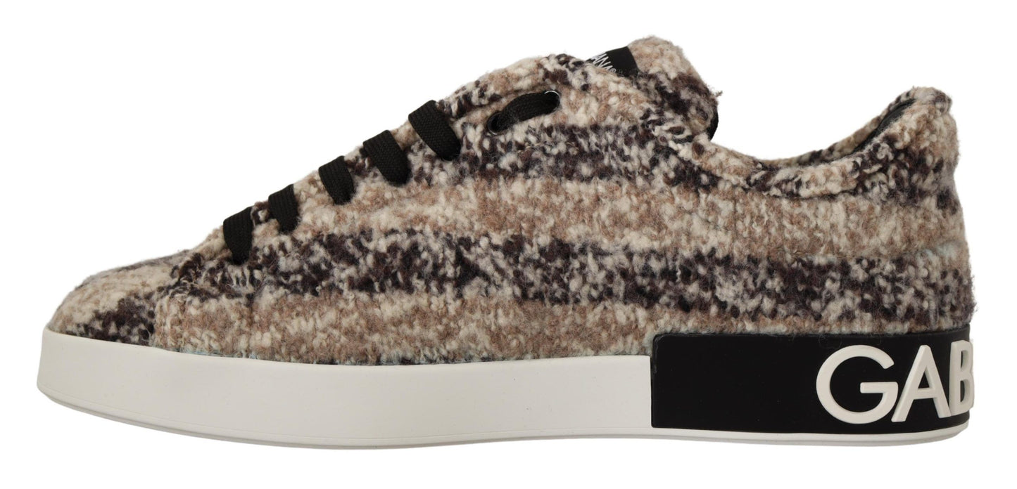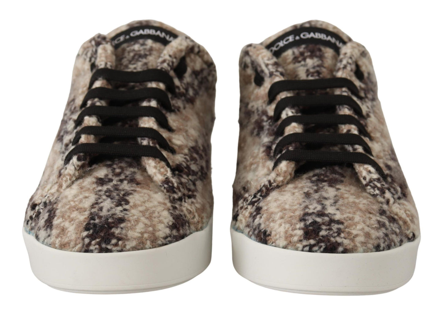 Step into sophistication with these luxurious Dolce & Gabbana casual low top sneakers. Crafted from a premium blend of wool and cotton, these shoes feature a chic beige and brown color palette that exudes elegance. The durable rubber sole provides comfort and longevity, making these sneakers a staple for any fashion-forward wardrobe. With meticulous attention to detail and Italian craftsmanship, these sneakers showcase the iconic logo for that touch of designer appeal. Perfect for any casual outing or smart-casual event.