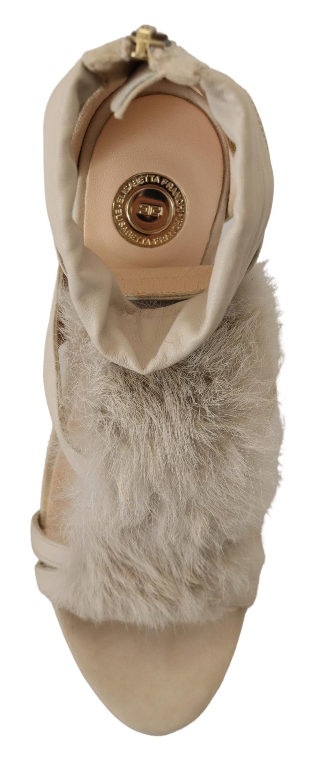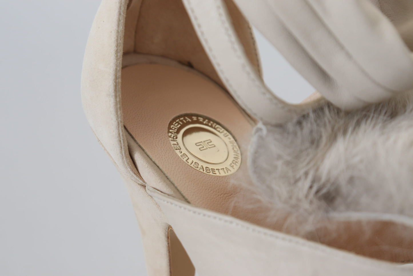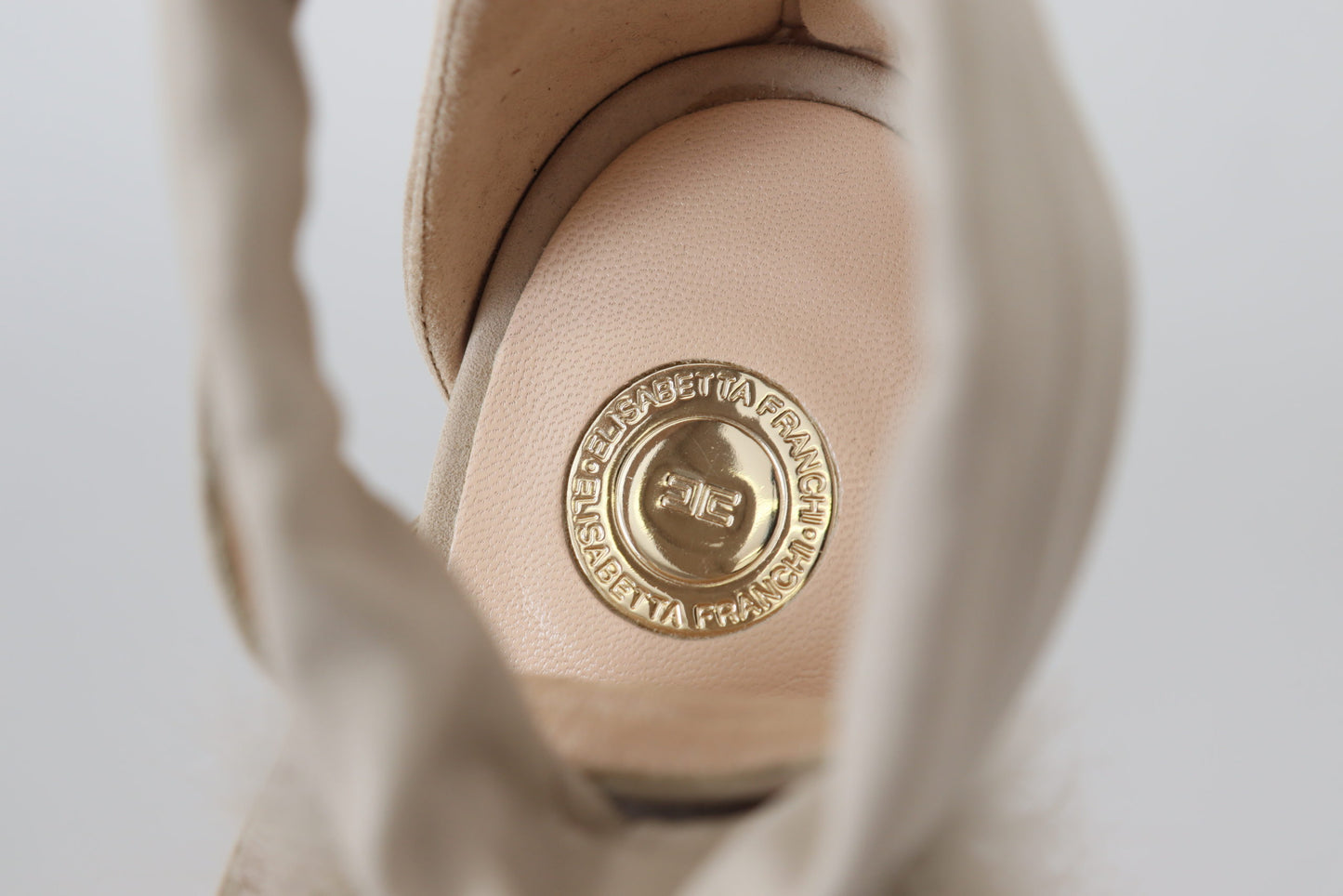 Step out in style with these exquisite Elisabetta Franchi beige leather sandals, adorned with delicate feathers. These brand new heels come with original tags and exude Italian elegance and expert craftsmanship. The ankle strap design provides a classic silhouette, making them perfect for any sophisticated ensemble.