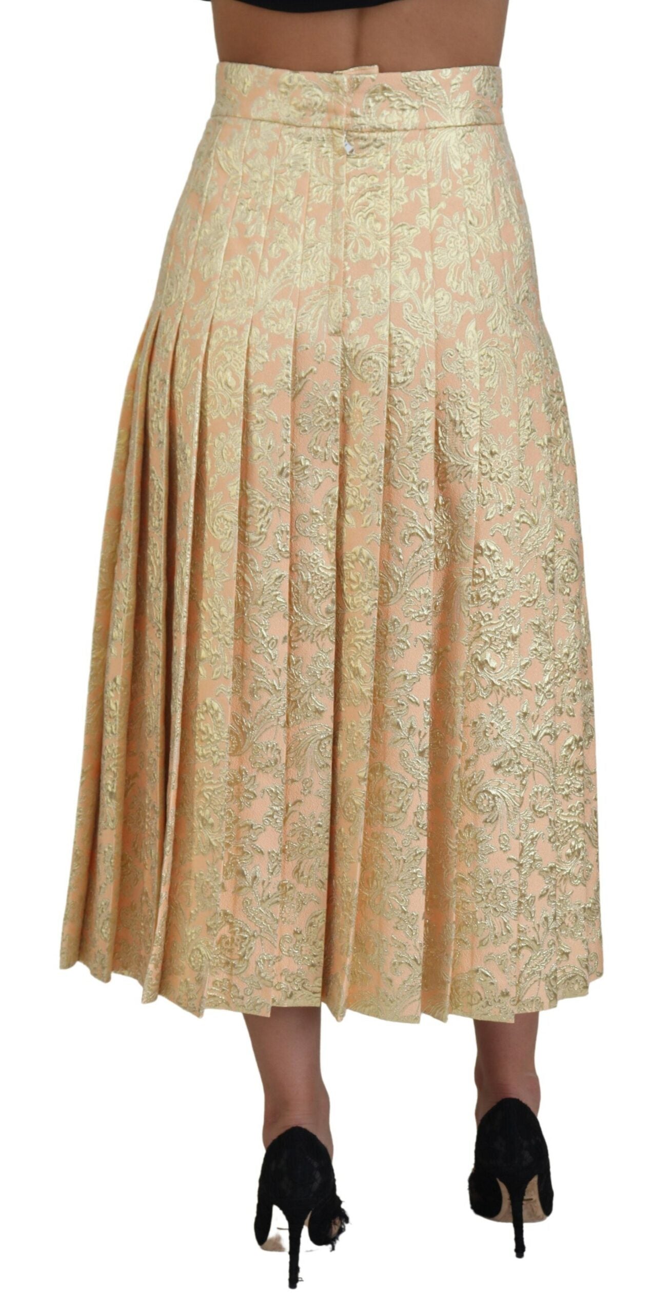 Elevate your wardrobe with this stunning high waist pleated midi skirt from the esteemed house of Dolce & Gabbana. Gorgeous new with tags, this skirt exudes sophistication with its refined beige floral jacquard design. Perfectly tailored for an elegant silhouette, it includes a smooth zipper closure and is beautifully lined for comfort. Crafted in Italy, it embodies the luxury and attention to detail synonymous with the brand.