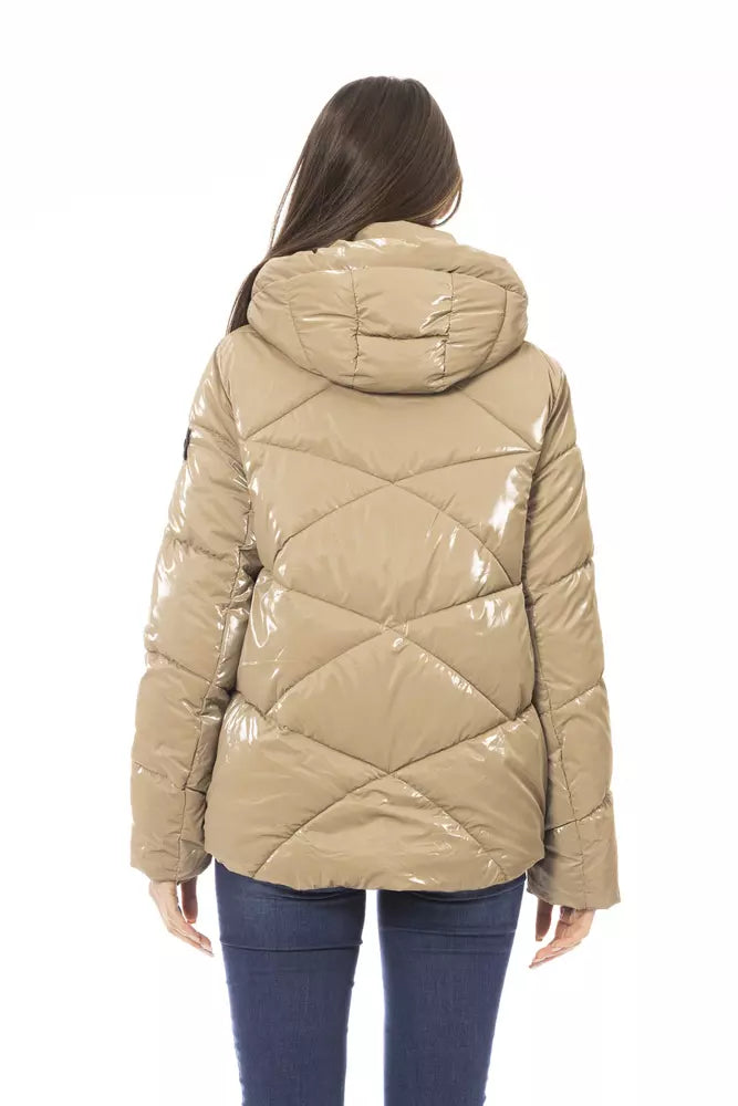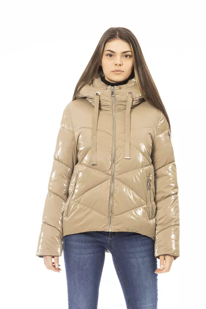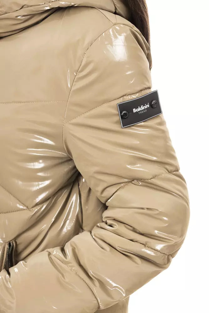 Experience warmth and refined style with this Beige Short Down Jacket, perfect for those brisk days. Features an adjustable hood for personalized comfort and external welt pockets for a sleek look. A striking Baldinini Trend metal monogram adds a touch of luxury. The front zipper closure is accented with a custom zip puller, blending functionality with elegance.