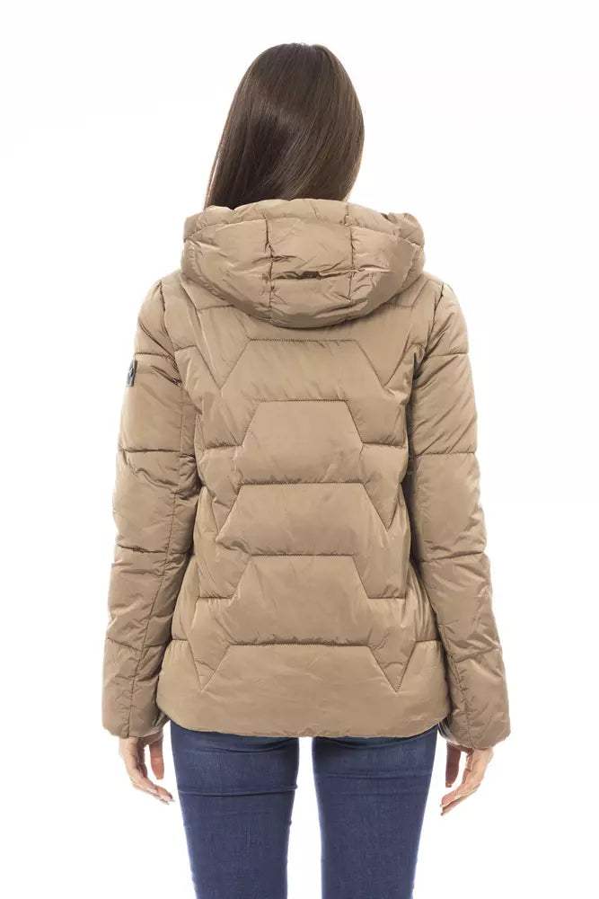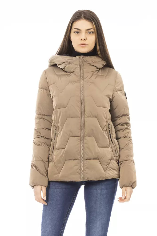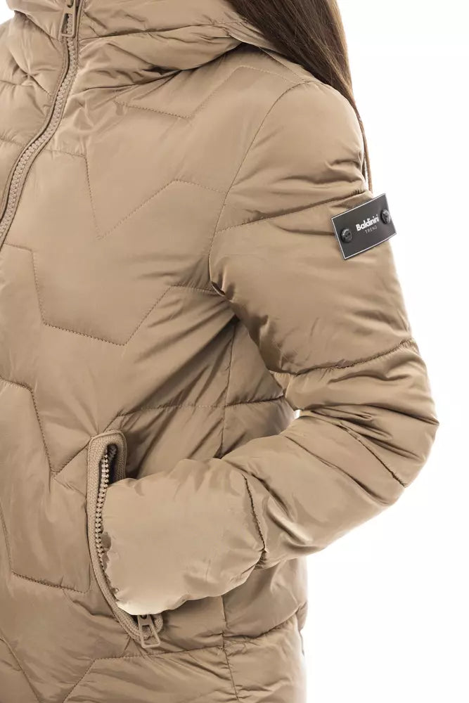Stay effortlessly chic as the temperature drops with this sophisticated beige short down jacket. Boasting an adjustable hood and sleek external welt pockets, this piece merges style with practicality. The front closure is adorned with a custom zip puller, while a gleaming Baldinini monogram adds a touch of elegance to your outerwear collection. Ideal for bracing the cold without compromising on style.