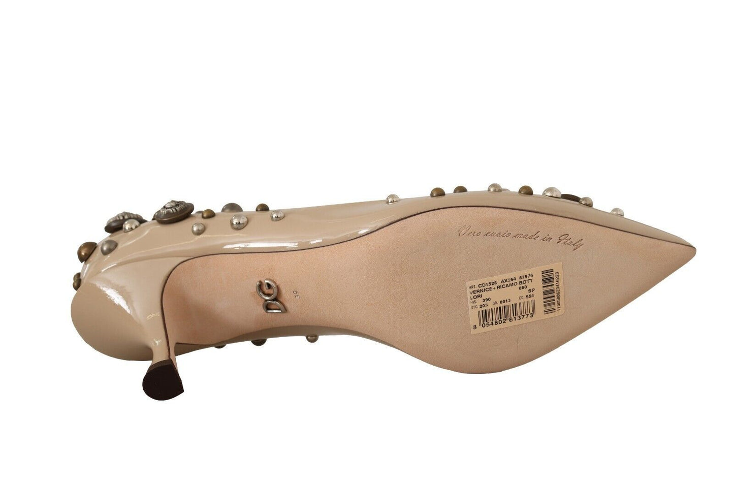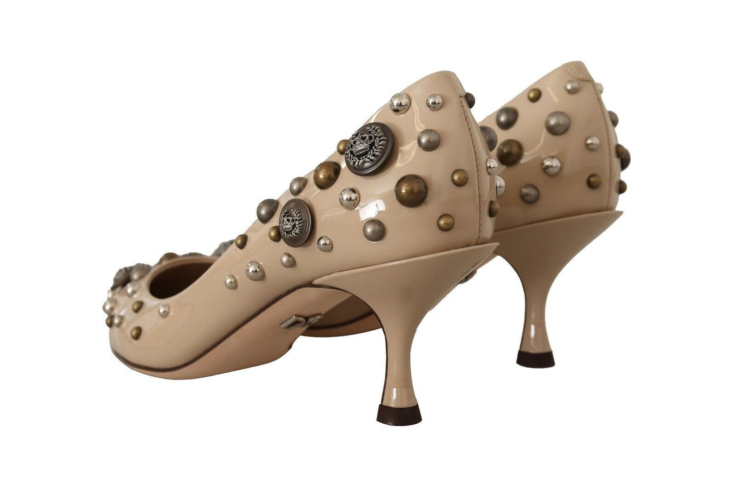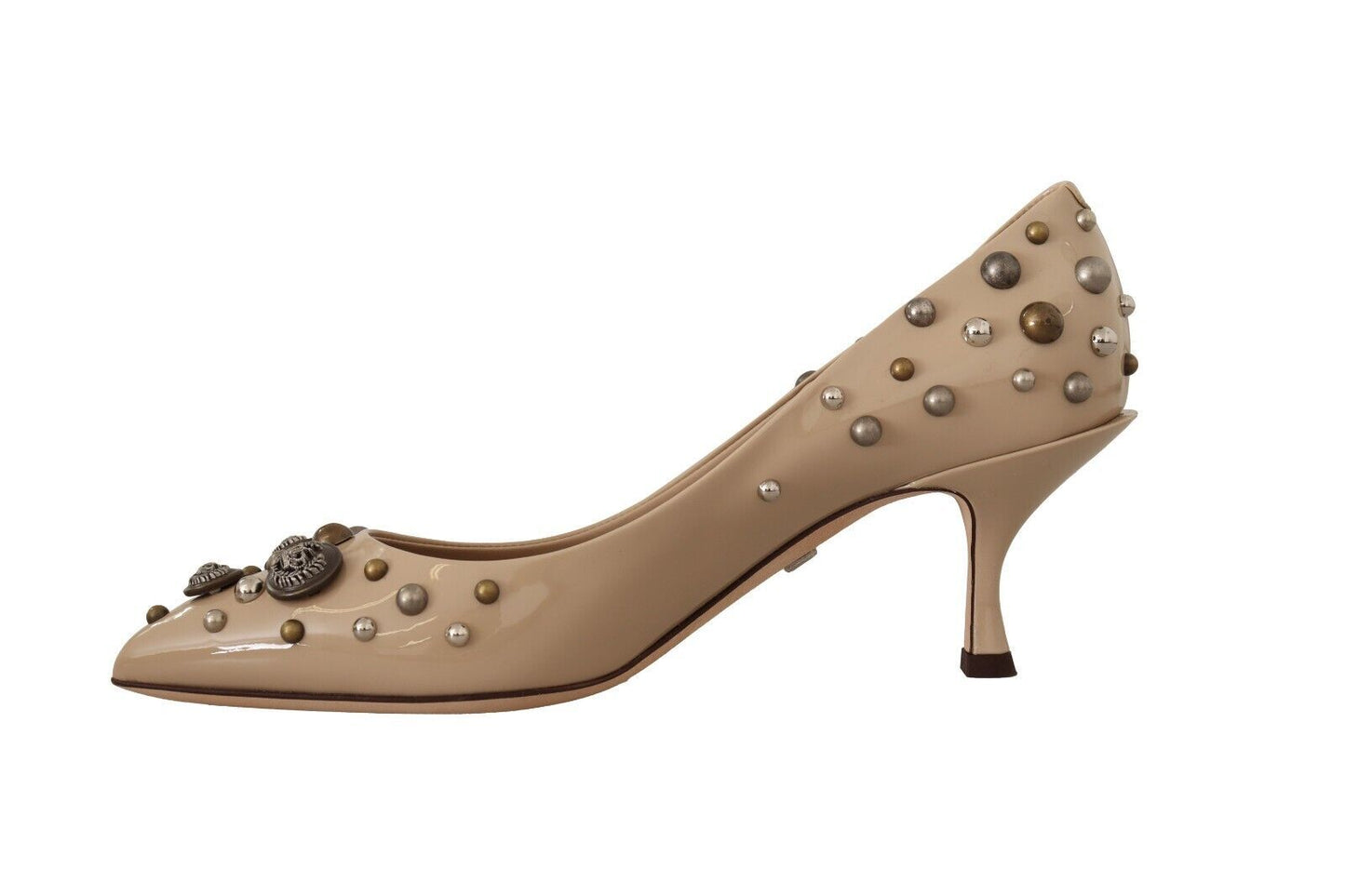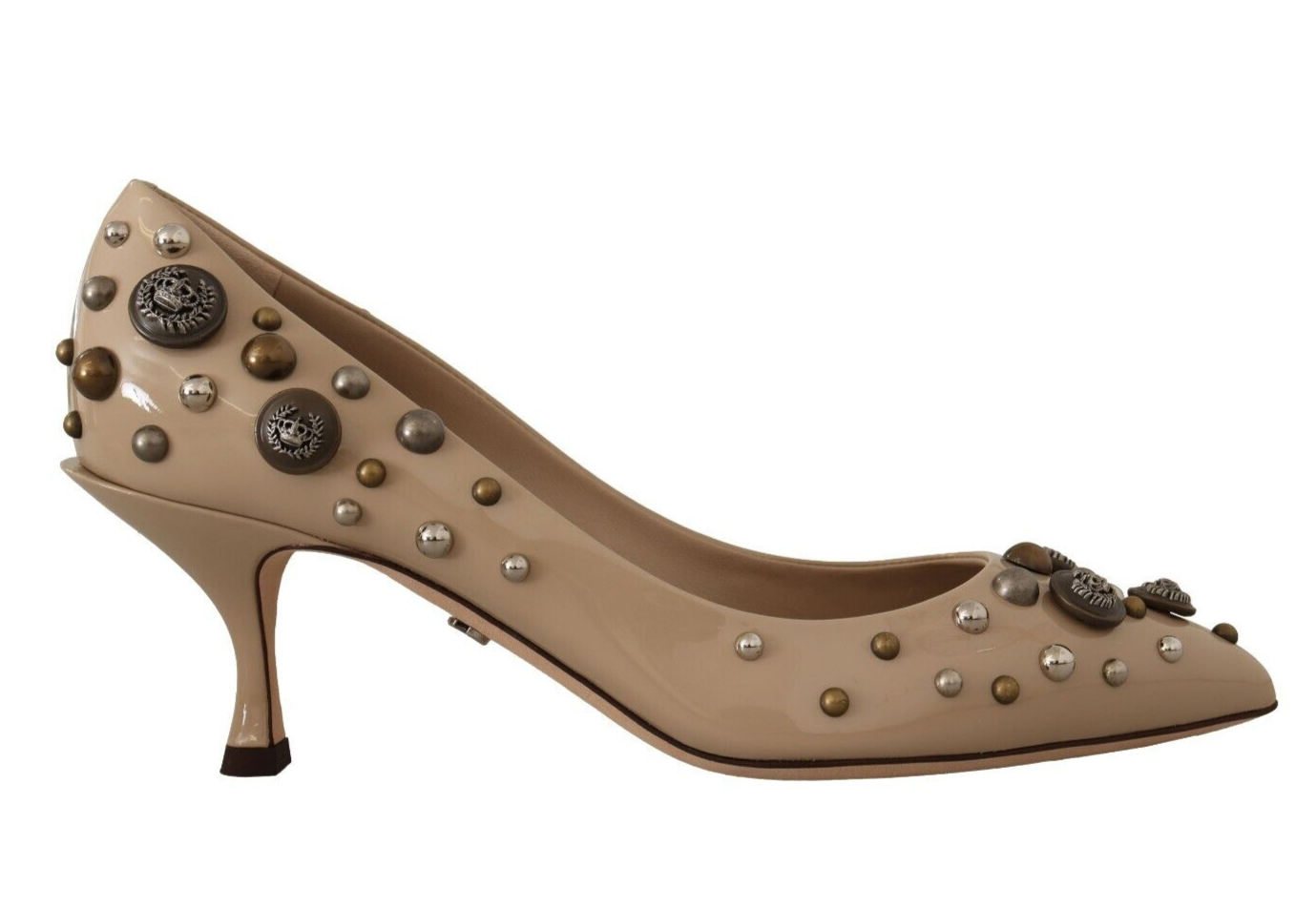 Step into luxury with these exquisite, brand new Dolce & Gabbana leather pumps. Adorned with studs and crafted with precision, these pumps feature an elegant mid kitten heel and a stylish pointed toe, perfect for adding a touch of sophistication to any outfit. The beige leather assures versatility, while the quality of Italian craftsmanship is evident in every detail.