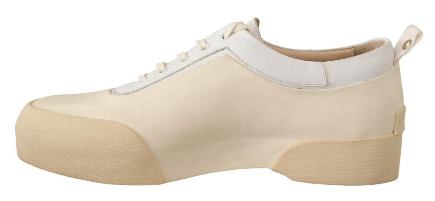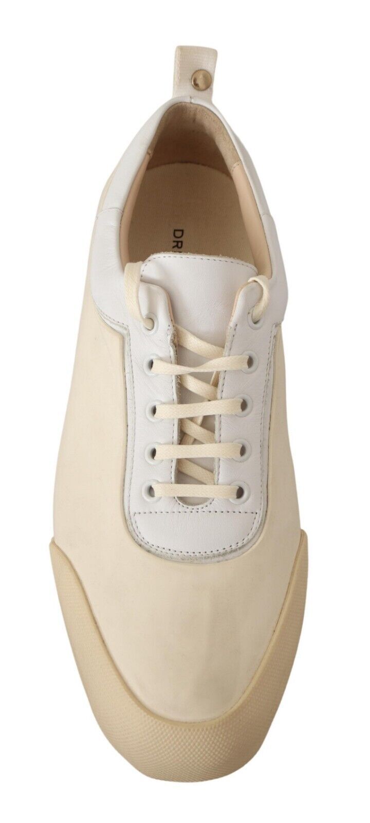 Step into style with these elegant white leather low top sneakers. Originally from the prestigious Dries Van Noten collection, these sneakers blend luxurious comfort with a sleek, modern design. Perfect for accentuating any outfit, they feature a classic lace-up closure and a durable rubber sole, complete with subtle logo details for an unmistakable touch of class.