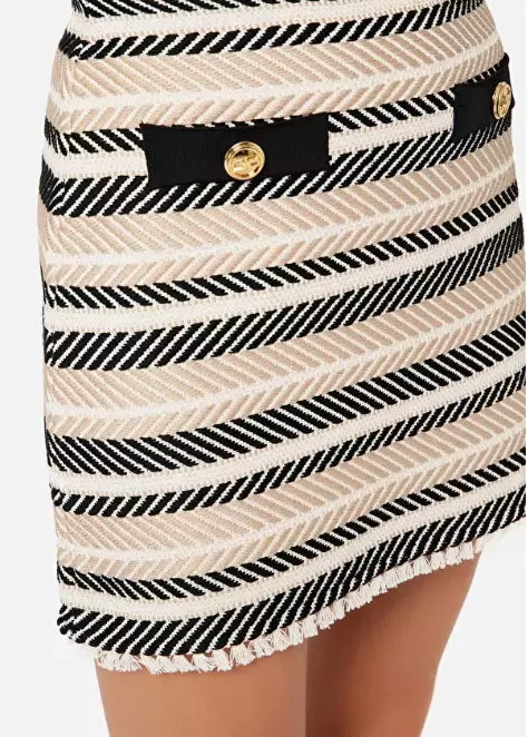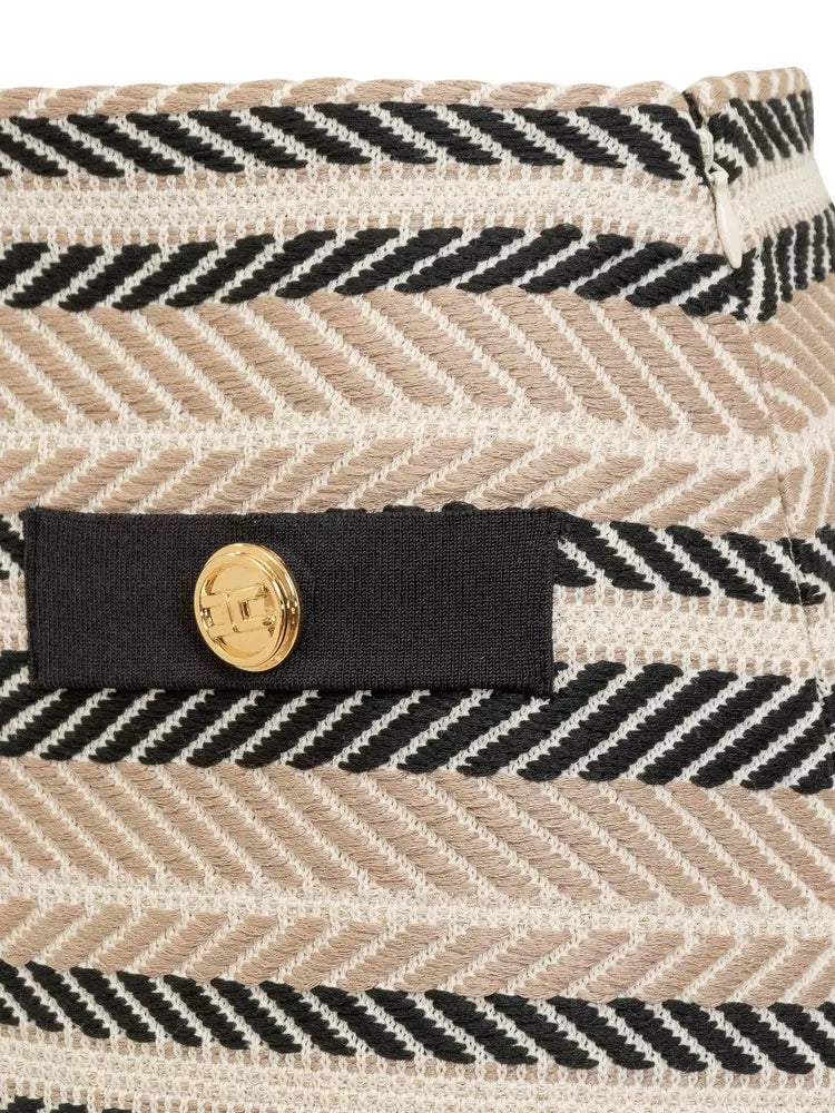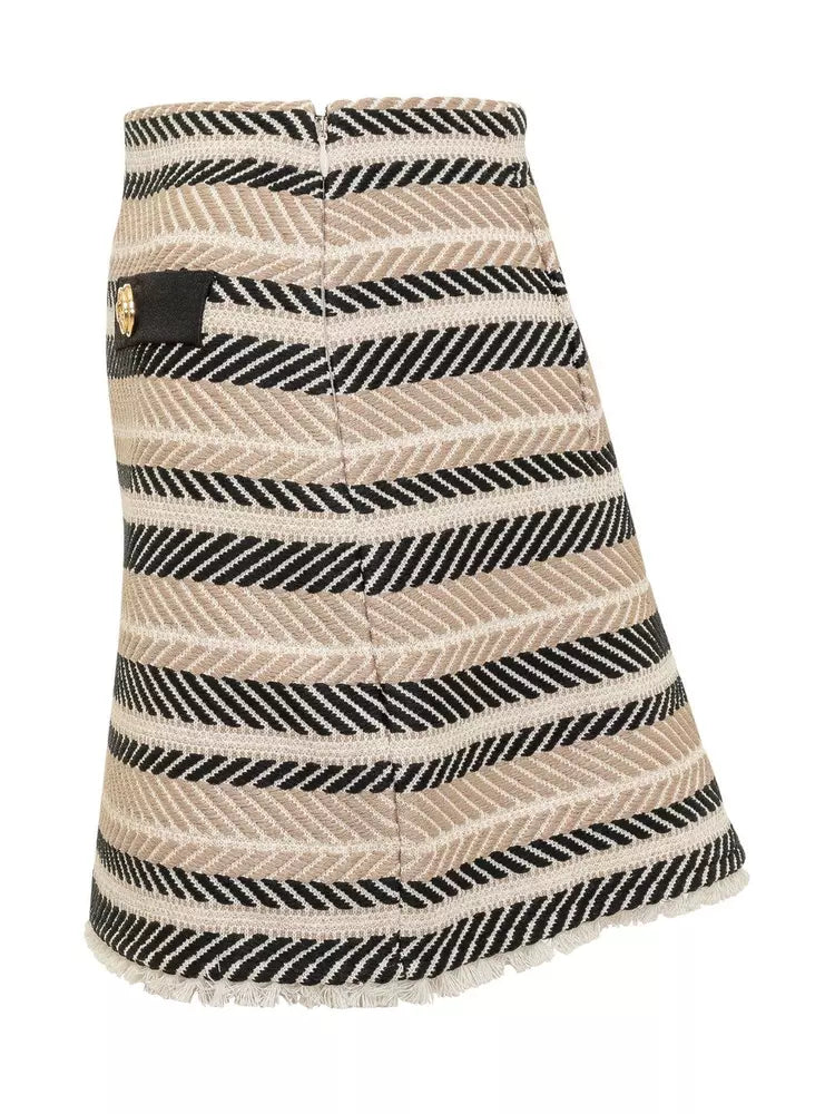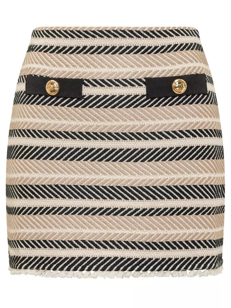 Step into sophistication with this impeccably tailored miniskirt, featuring a classic herringbone pattern complemented by tufted detailing along the hem. Golden logo buttons and a sleek side zip provide functionality with a touch of luxury. Crafted with a blend of high-quality fabrics, this skirt promises comfort and durability, while embodying Italian craftsmanship at its finest.