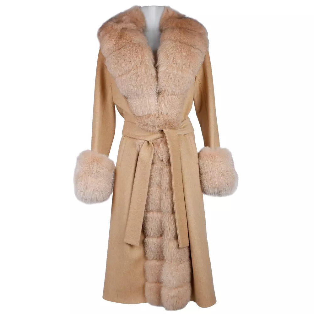 Elegant Beige Wool Coat with Fox Fur Trim
