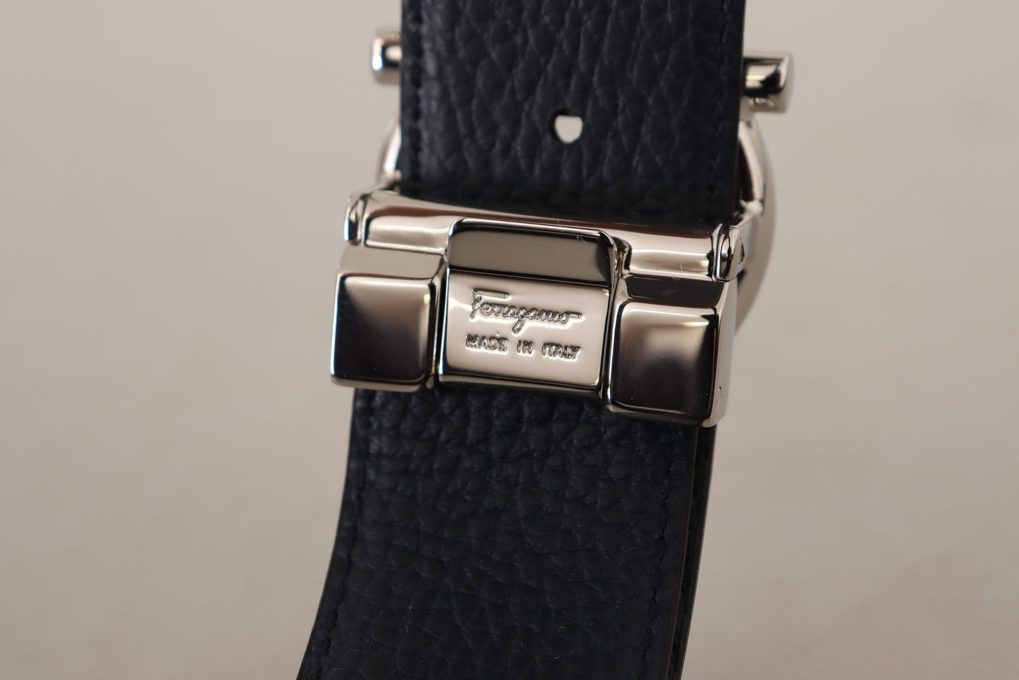 Indulge in the epitome of luxury with our absolutely stunning, 100% authentic Salvatore Ferragamo reversible belt—fresh from the latest collection, complete with original tags, a dust bag, and a box. This functional and stylish accessory effortlessly switches between a rich Marine Blue and classic Black, topped with an elegant silver buckle.