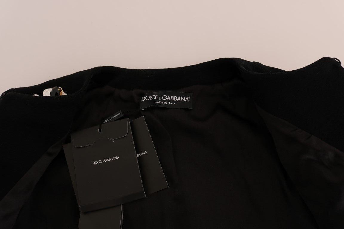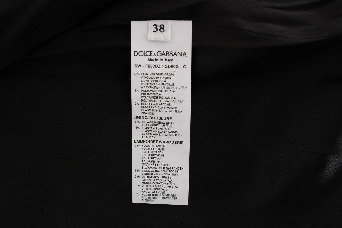 Immerse yourself in the luxurious opulence of Dolce & Gabbana with this exquisite black coat jacket, beautifully adorned with white floral embroidery and sparkling crystals. Boasting Italian craftsmanship and exclusive high-end appeal, this coat features a sleek full hook closure and is lined with sumptuous silk-stretch fabric for supreme comfort. Up your fashion game with this statement piece that seamlessly blends classic elegance with modern glam.