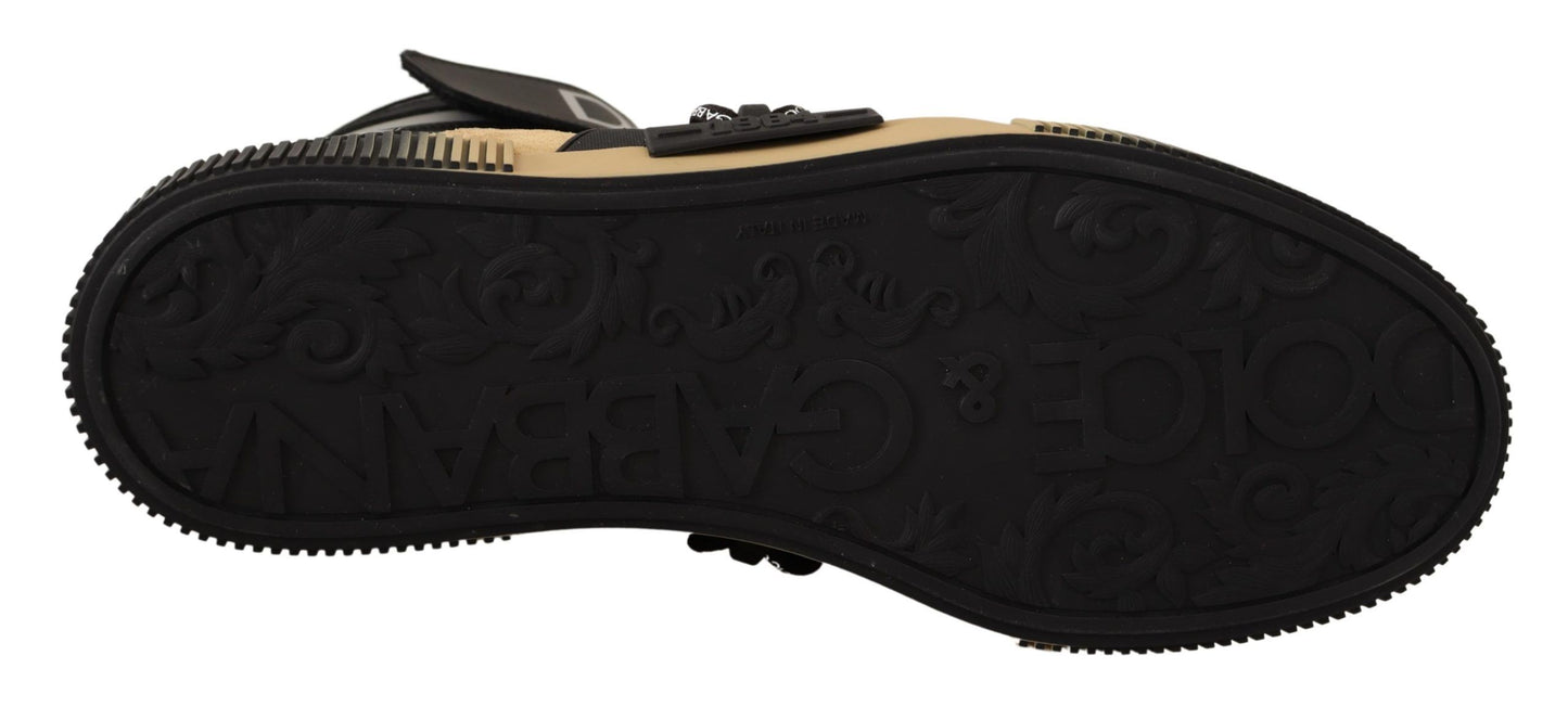 Discover the epitome of Italian craftsmanship with these Dolce & Gabbana High Top Sneakers. Exquisitely made with a blend of leather and nylon, these sneakers exemplify luxury with their sleek black color, highlighted with beige accents. Embroidery and the iconic logo adorn this pair, signaling a distinguished taste. Perfect for adding a refined touch to any casual ensemble, they boast a comfortable rubber sole, designed for durability and style.