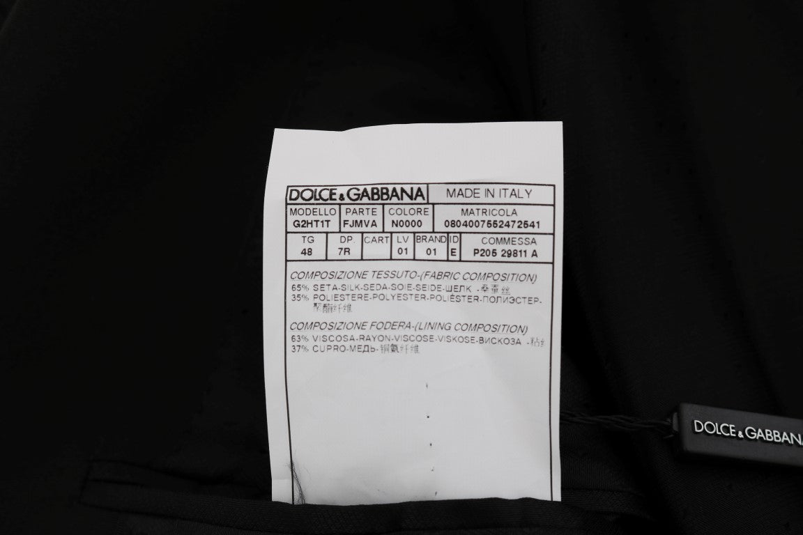 Exude sophistication with this luxurious black and blue patterned blazer and vest set by Dolce & Gabbana. Crafted in Italy, the ‘MARTINI’ model boasts a slim fit, single-breasted one-button design, ensuring a sleek silhouette. High-quality materials and attention to detail are evident with a silk blend construction, offering both premium comfort and durability. The set features three external pockets, two internal pockets, a sleek black silk lining, and a single back vent for added elegance. This rare and exclusive item encapsulates high craftsmanship and exceptional tailoring, designed to elevate your formal attire.