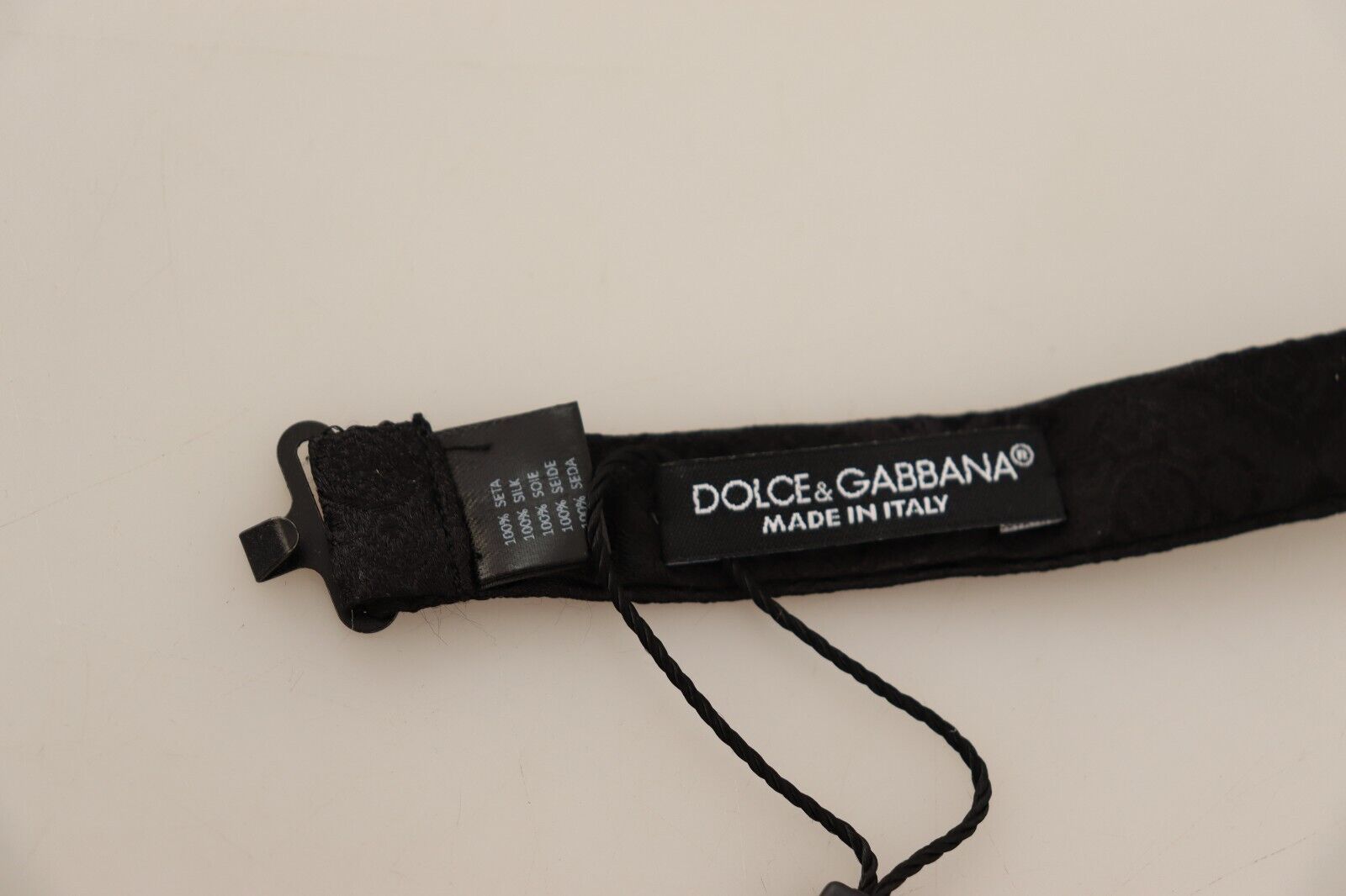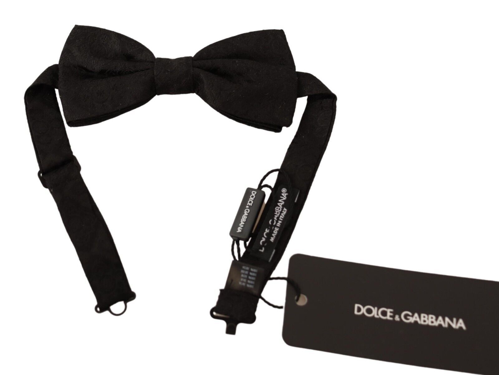 Discover the epitome of luxury with this exquisite silk bow tie from Dolce & Gabbana. Tailored to perfection, this stunning accessory features a rich black brocade, exuding a timeless appeal that effortlessly elevates any formal attire. Crafted with the utmost attention to detail, it includes a convenient and stylish metal clasp at the back for a secure fit. Made in Italy, this bow tie is synonymous with the sophistication and craftsmanship that Dolce & Gabbana is renowned for.