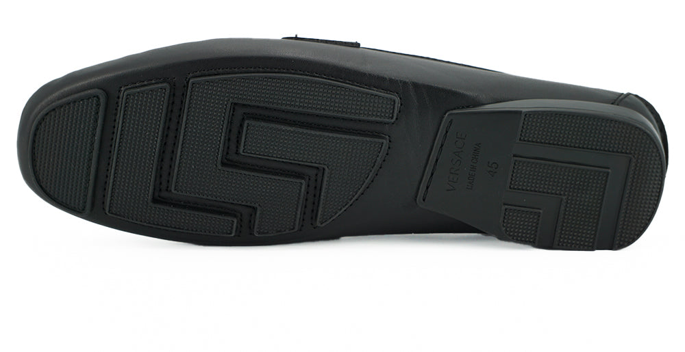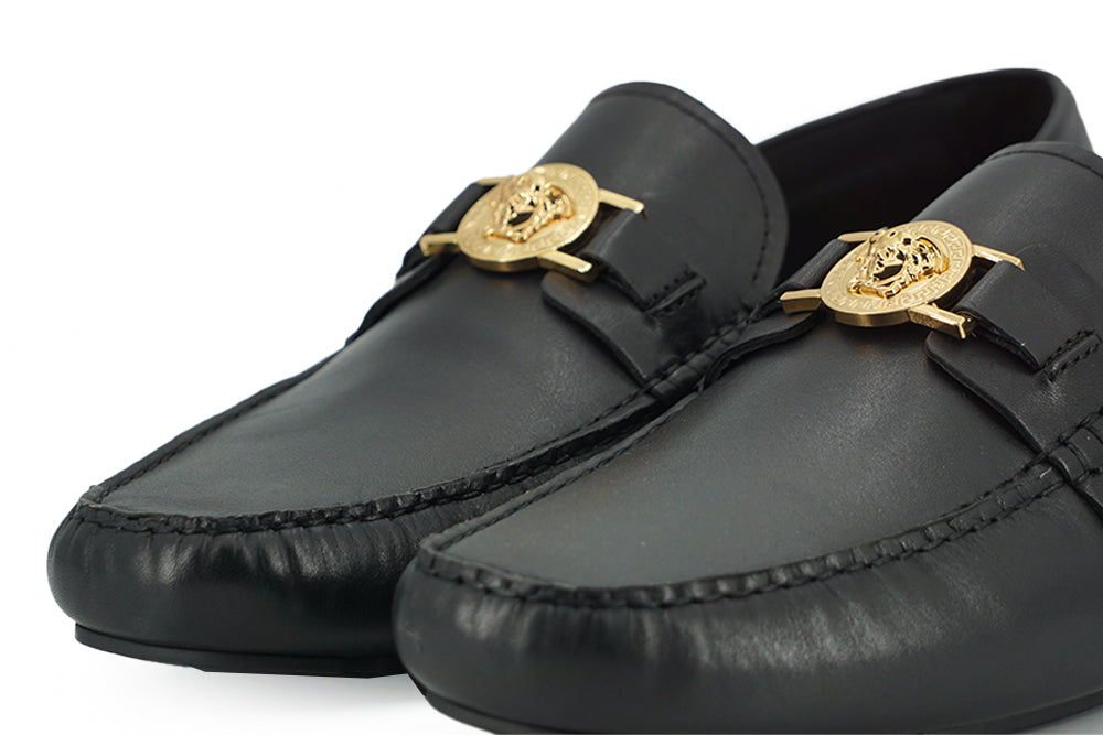 Step into luxury with these impeccable 100% Authentic Versace men’s loafers, a blend of sophistication and classic style. These shoes come new with their original box, tags, and an exclusive Versace dust bag. Imbued with elegance, the black calf leather is accentuated by glistening gold-toned metal hardware featuring the iconic Medusa emblem and the esteemed Versace logo detail.