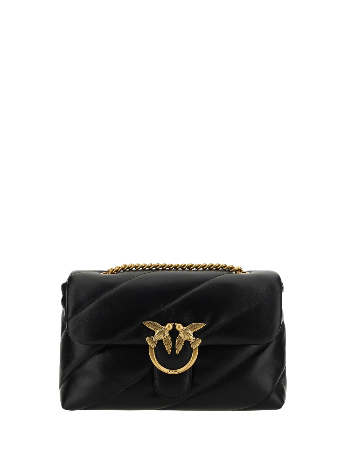 Discover the epitome of luxurious style with this chic 100% authentic PINKO Love Classic Shoulder Bag. Crafted from sumptuous calf leather, this gorgeous shoulder bag is a staple of elegance and sophistication. The classic black hue is versatile for any occasion, whether it’s a day in the office or a night out on the town. Detailed with a stunning gold-plated Love Birds logo and a quilted padded design, it boasts a double internal compartment for organization and a sliding chain strap for a touch of glamour.