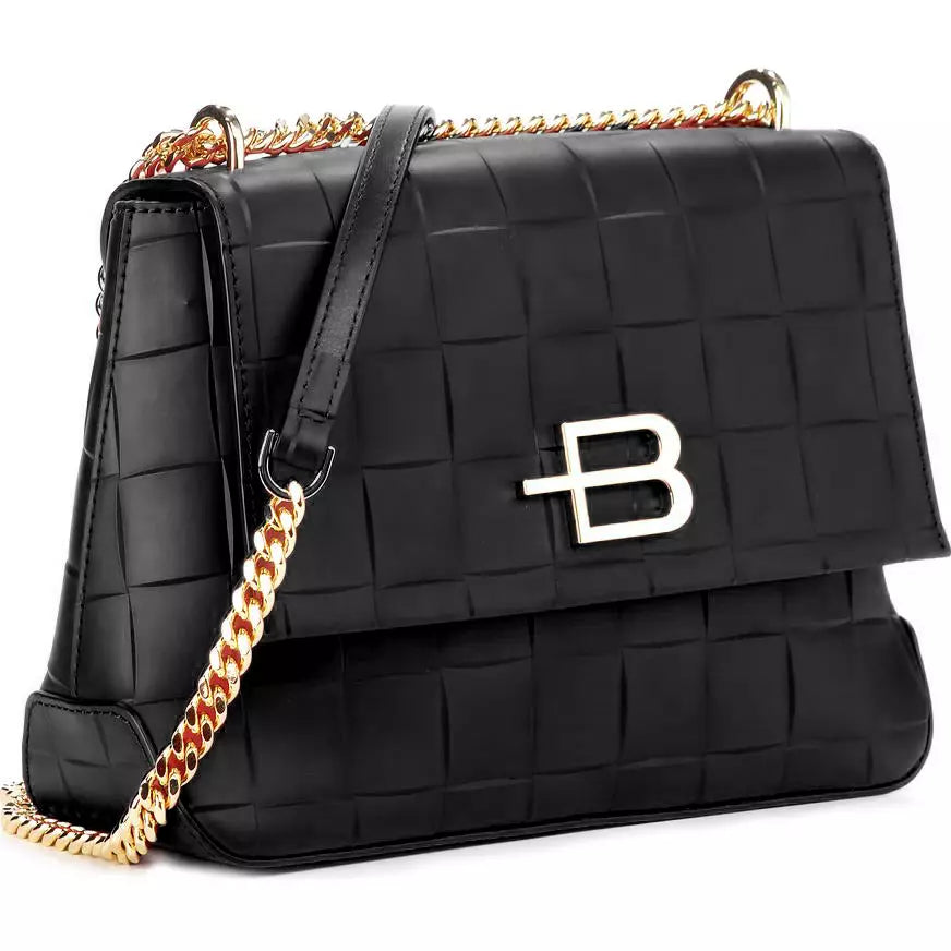 Discover the epitome of elegance with our Italian-designed calfskin shoulder bag, featuring a sophisticated automatic button closure. Its sleek square motif leather print is accentuated by a distinctive metal logo on the front, adding a touch of class. Designed for versatility and style, it comes with a chain shoulder strap enhanced by a comfortable leather pad. Perfect for those who appreciate luxury and functionality.