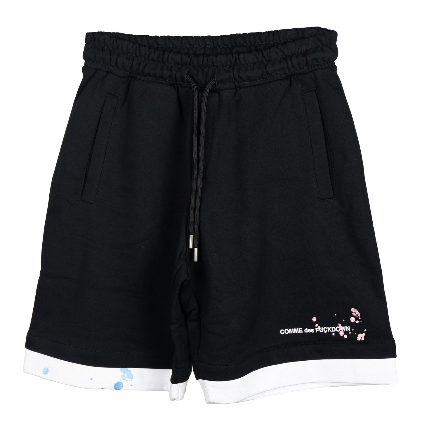 Comme Des Fuckdown stretch cotton shorts with drawstring and side pockets, logo print on the front and embroidered details